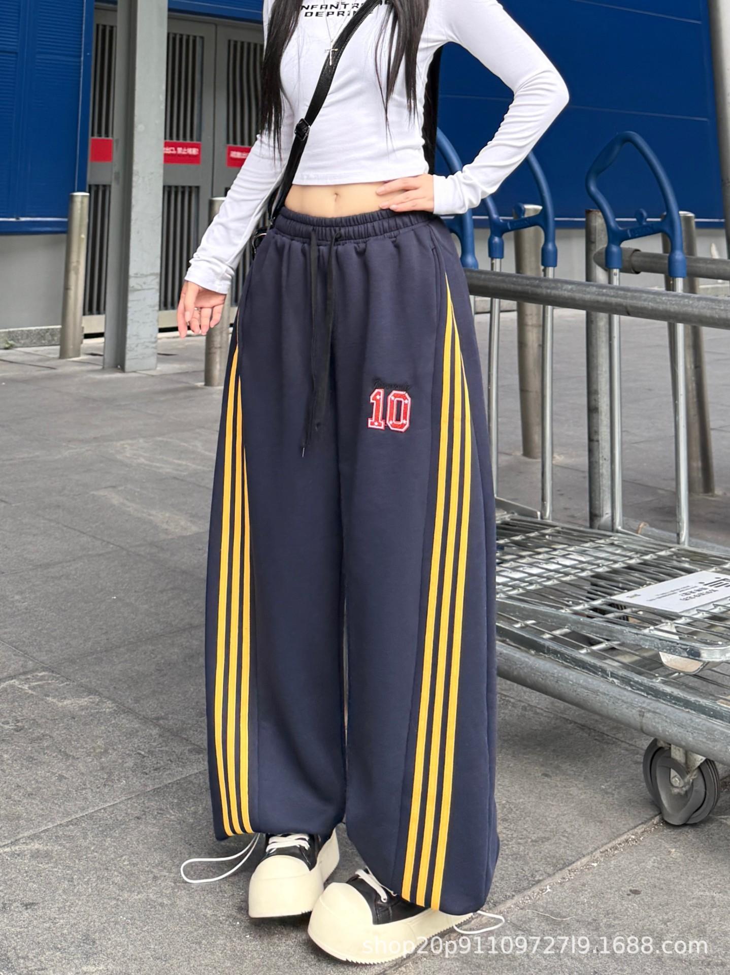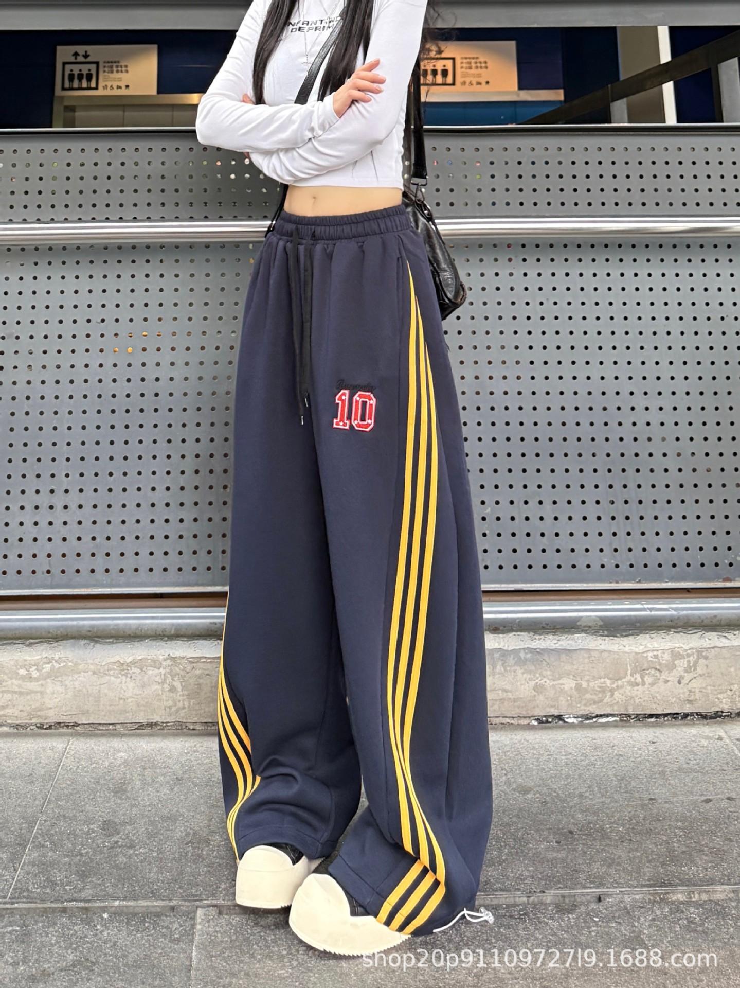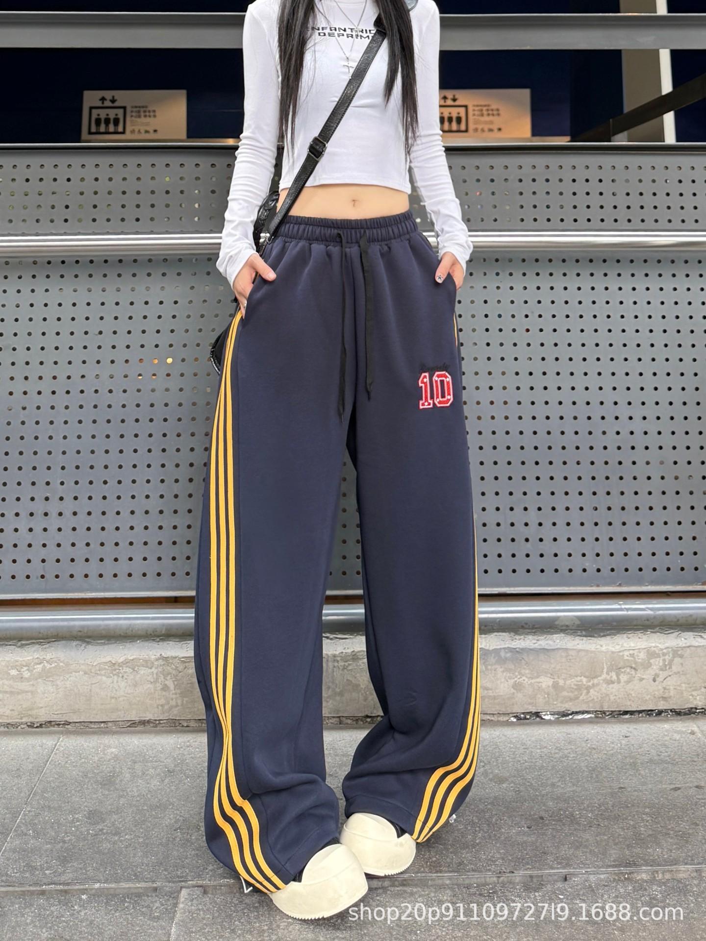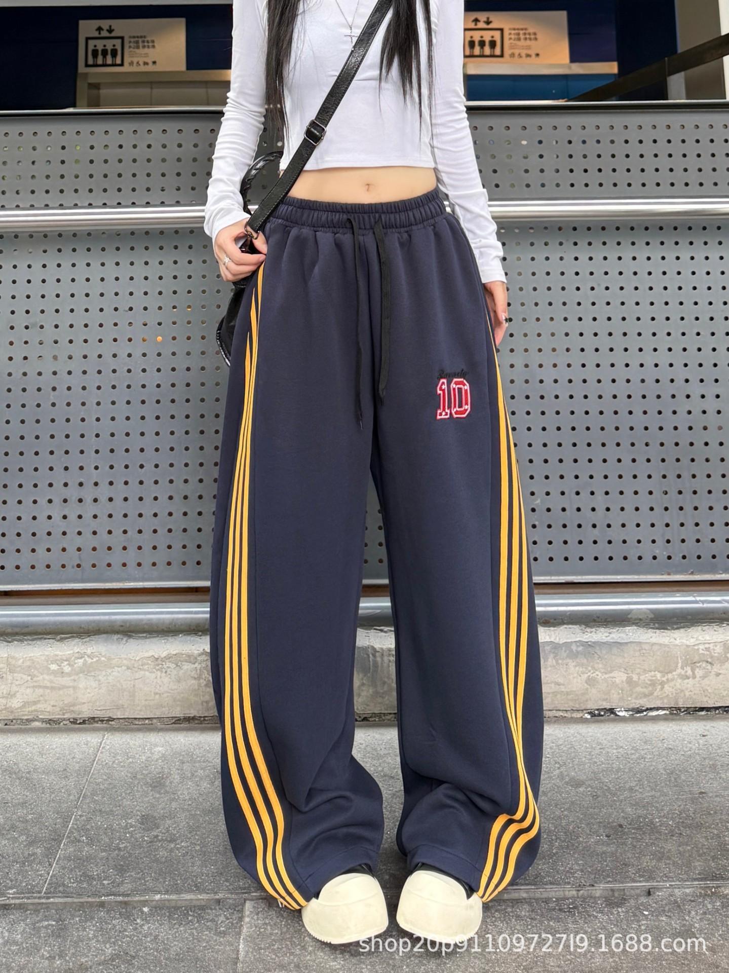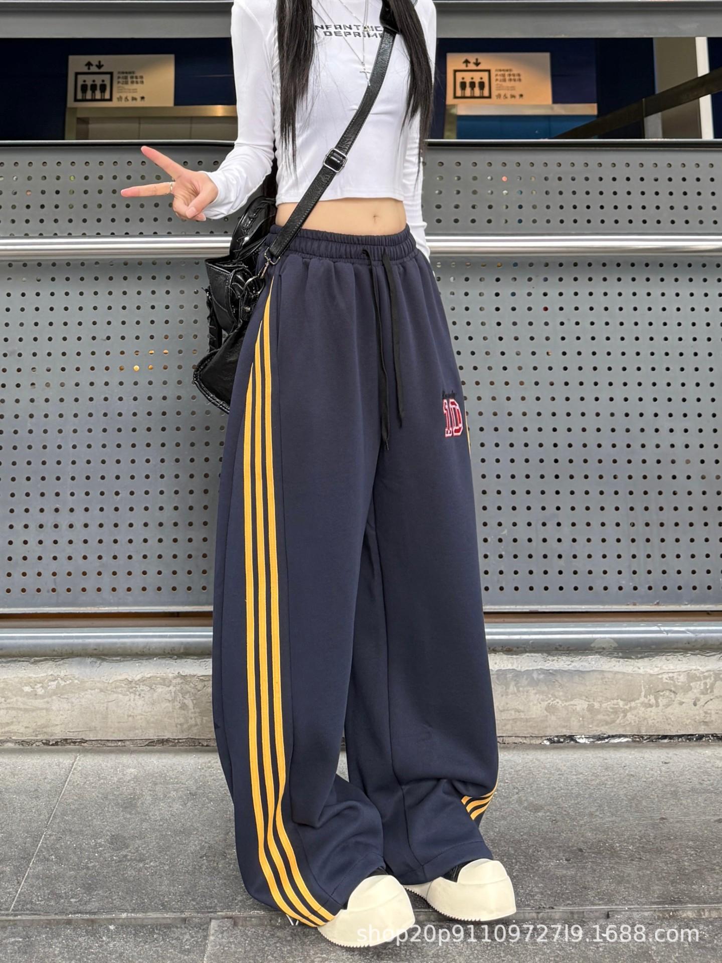 Amazon nuevos pantalones deportivos casuales holgados con cordón americano de tres rayas para mujer otoño pantalones de pierna ancha recta comercio exterior transfronterizo