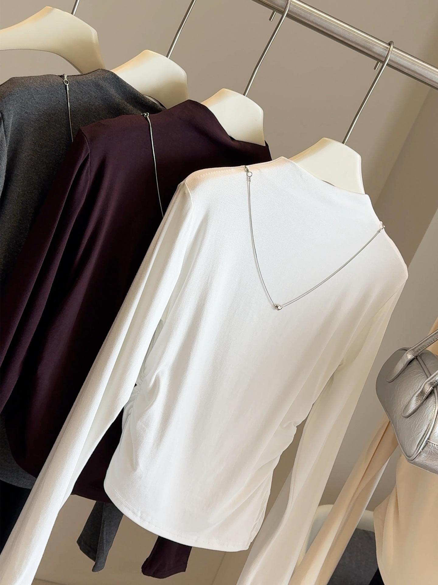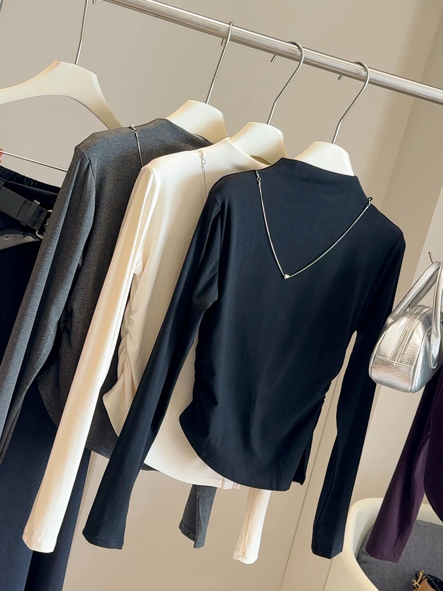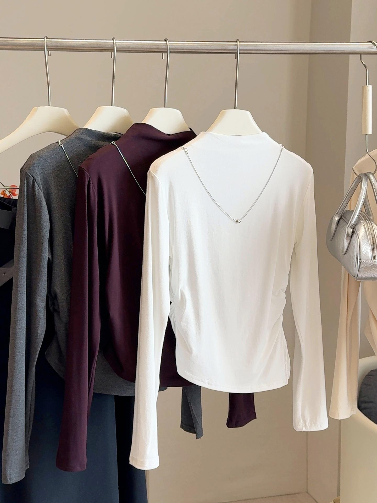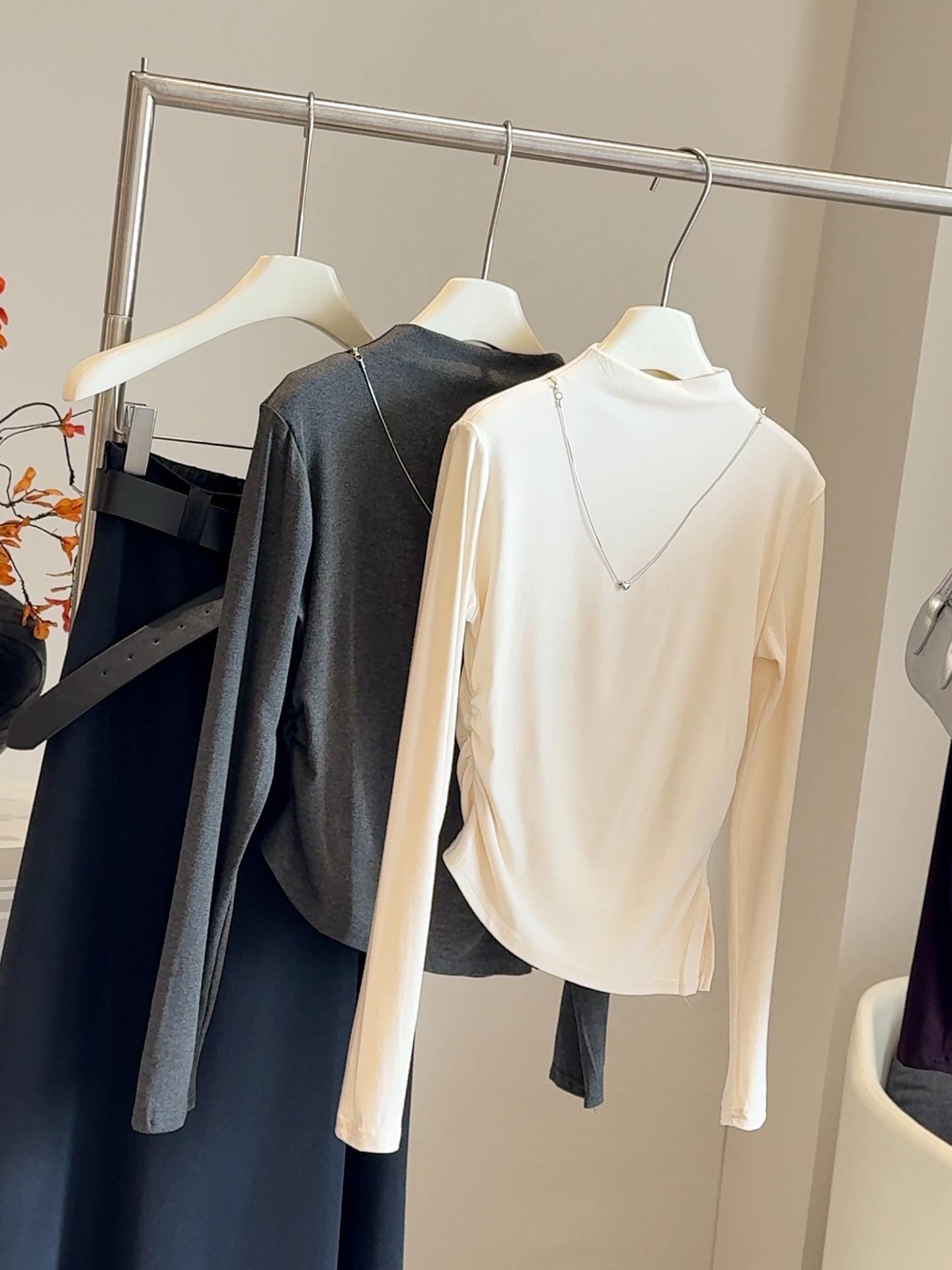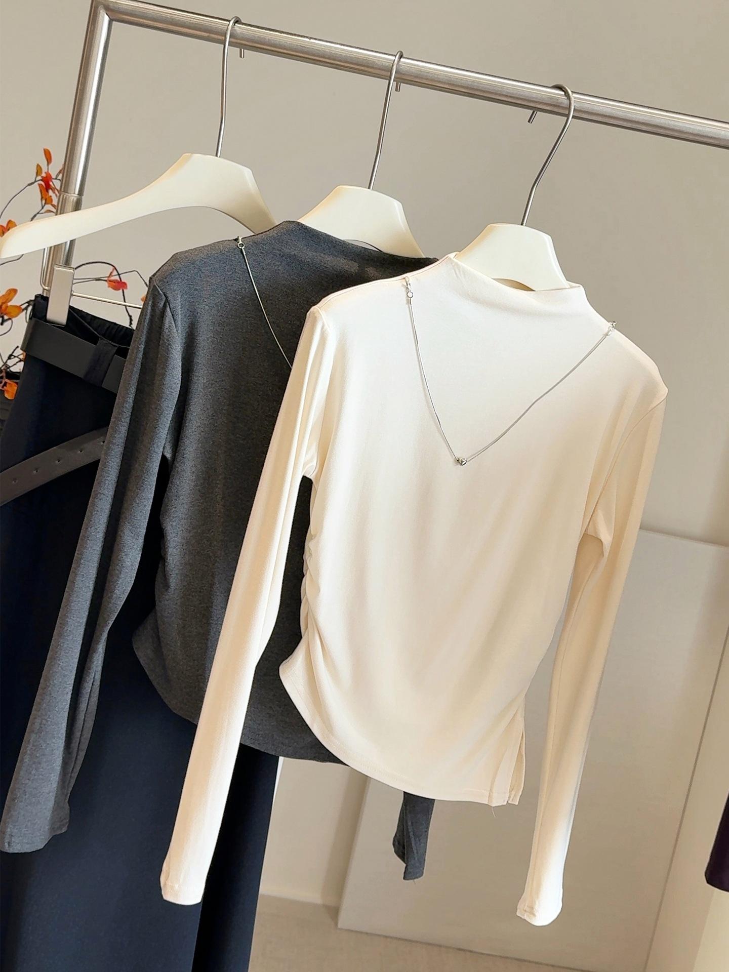 Sentido del diseño cuello semi alto bajo asimétrico camiseta base mujer principios de otoño 2025 nueva corte ajustado manga larga en capas camiseta interior top