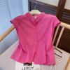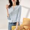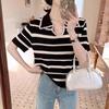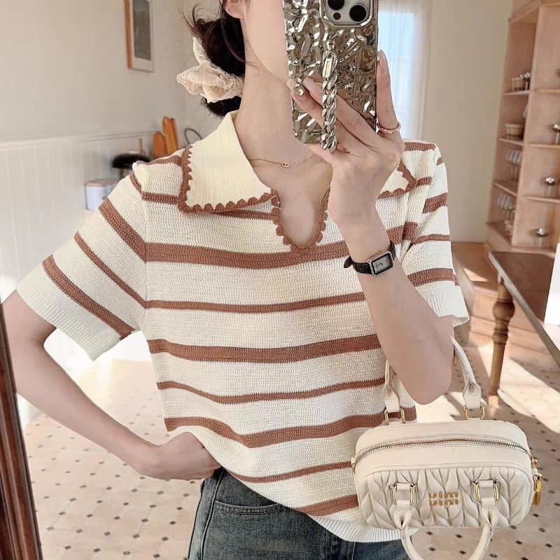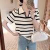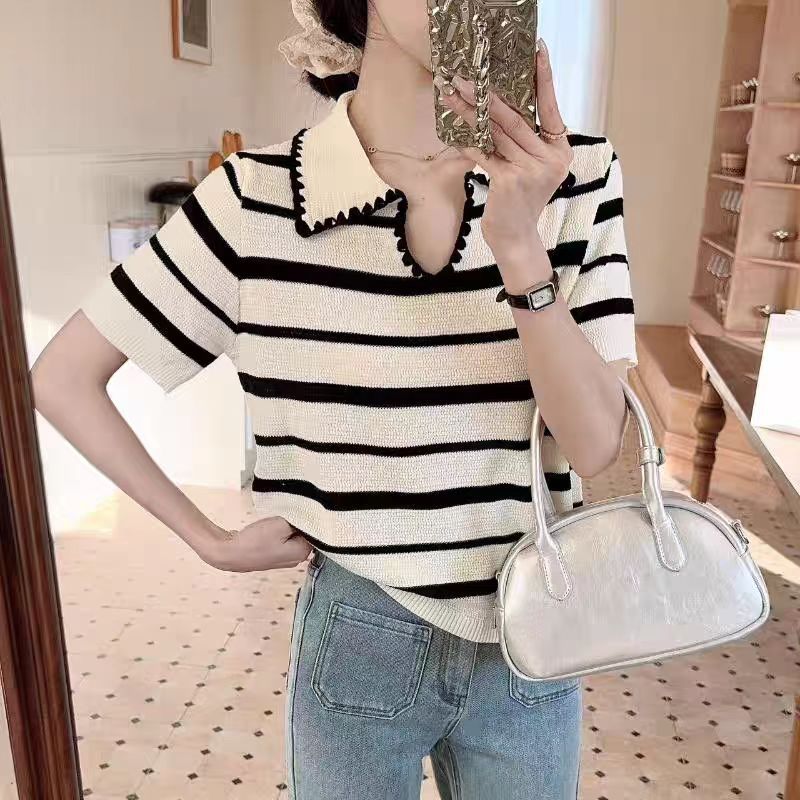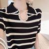 Hermosa camisa europea gigante delgada de verano 2025 nueva de solapa manga corta a rayas versátil textura moda