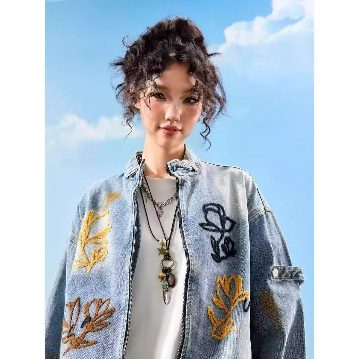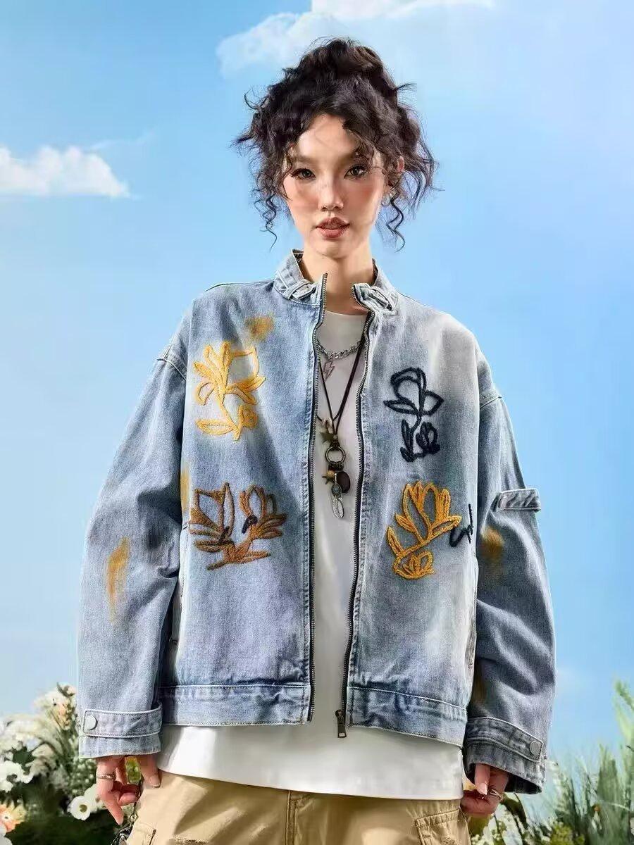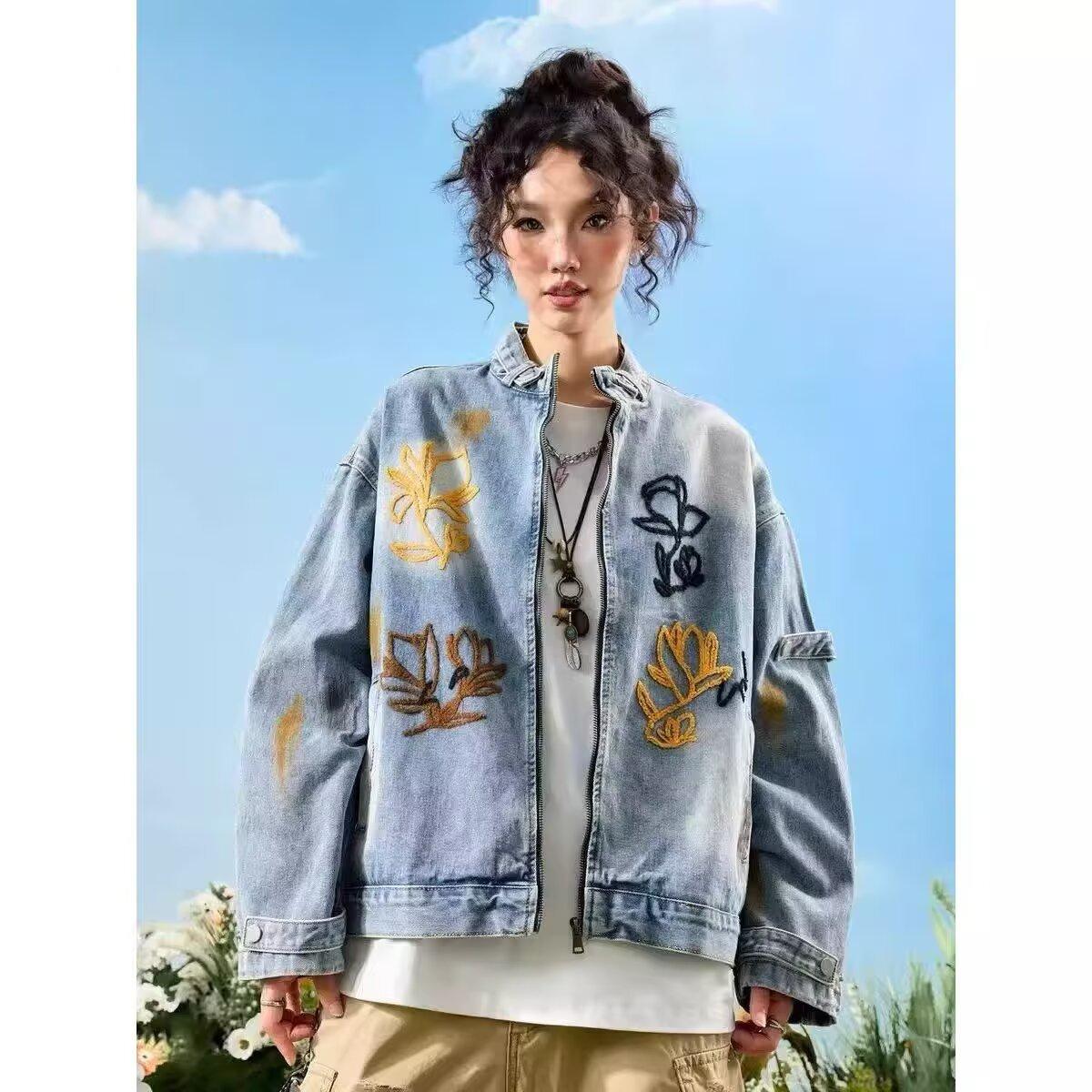 Chamarra de mezclilla con estampado floral retro americano para hombre y mujer 2025 otoño lavado desgastado holgada cuello vuelto ropa exterior