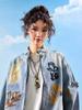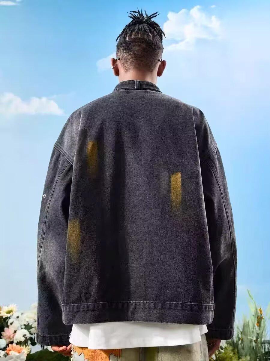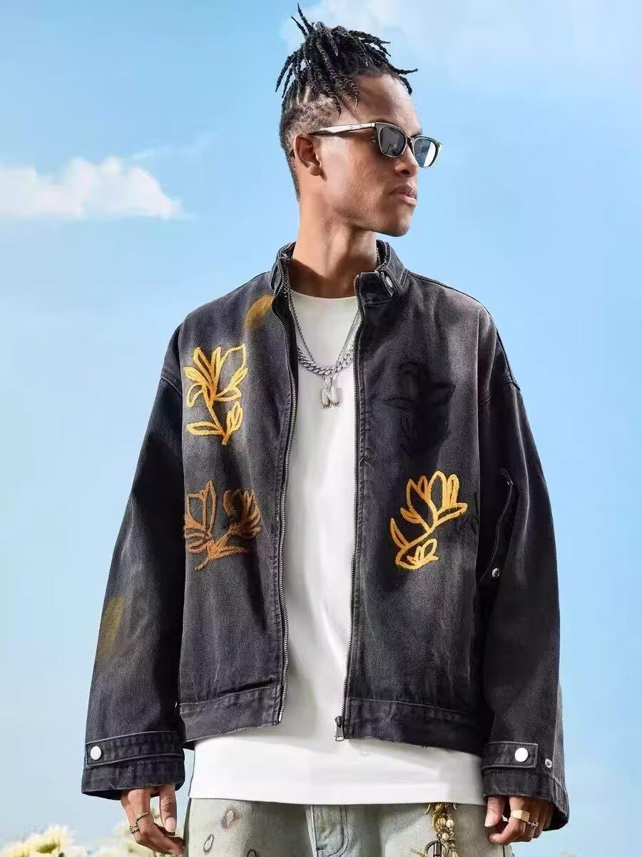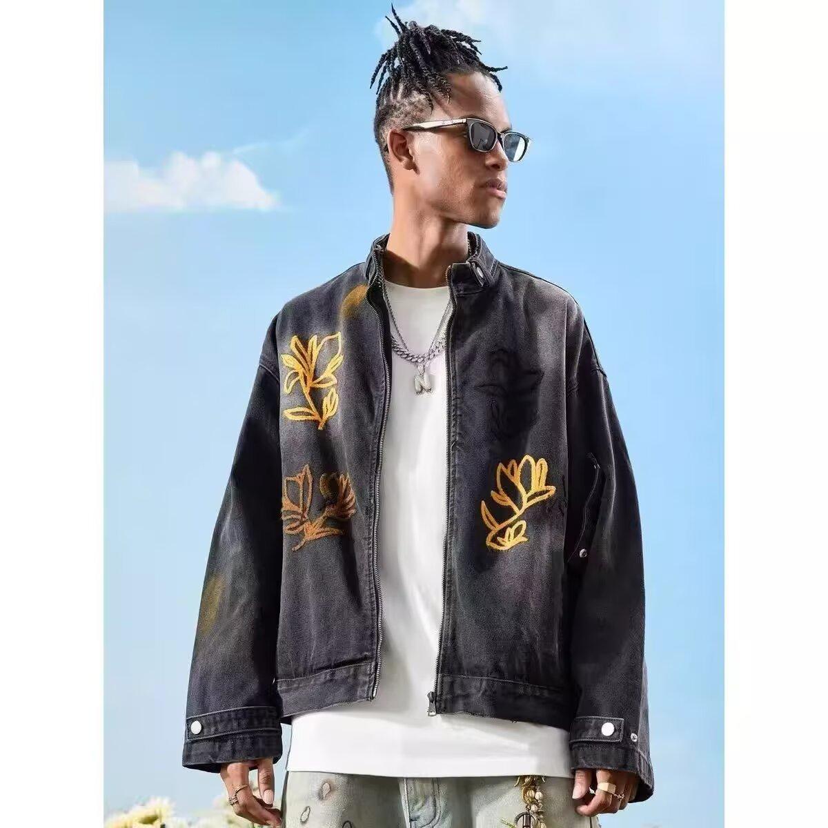 Chamarra de mezclilla con estampado floral retro americano para hombre y mujer 2025 otoño lavado desgastado holgada cuello vuelto ropa exterior