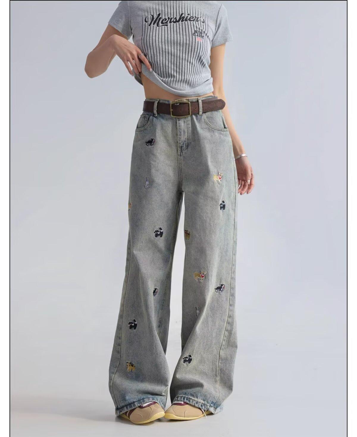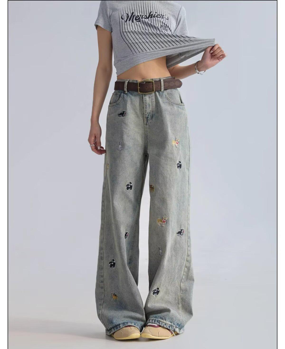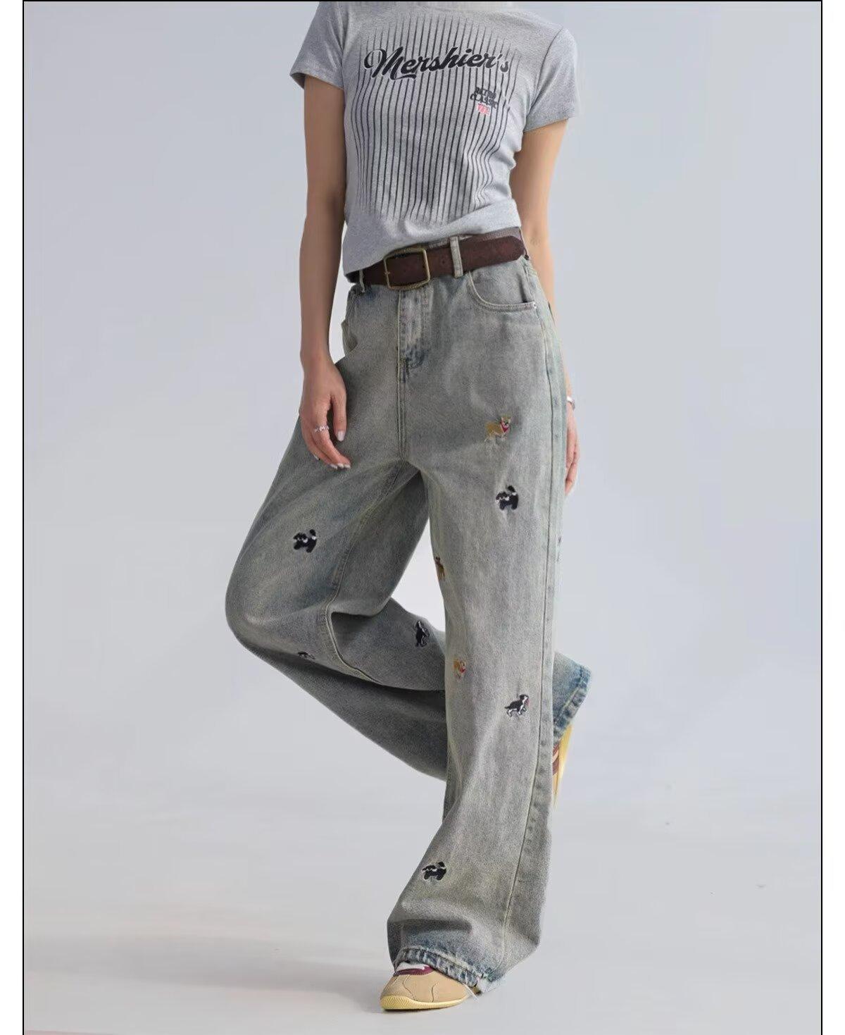 Jeans de Bordado Lúdico para Mujer 2025 Nuevo Pantalón Holgado de Pierna Ancha hasta el Piso de Cintura Alta Adelgazante de Pierna Recta Versátil