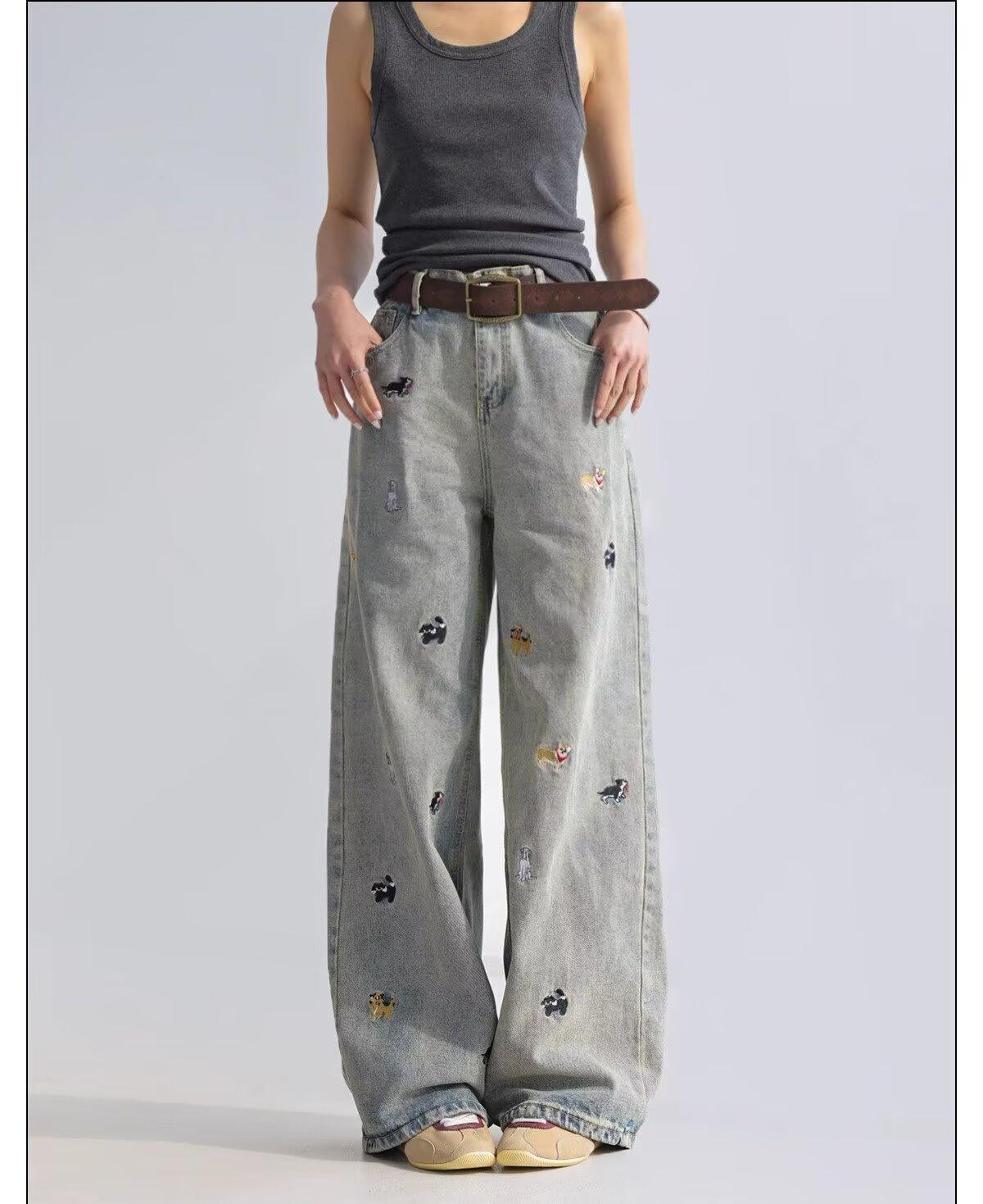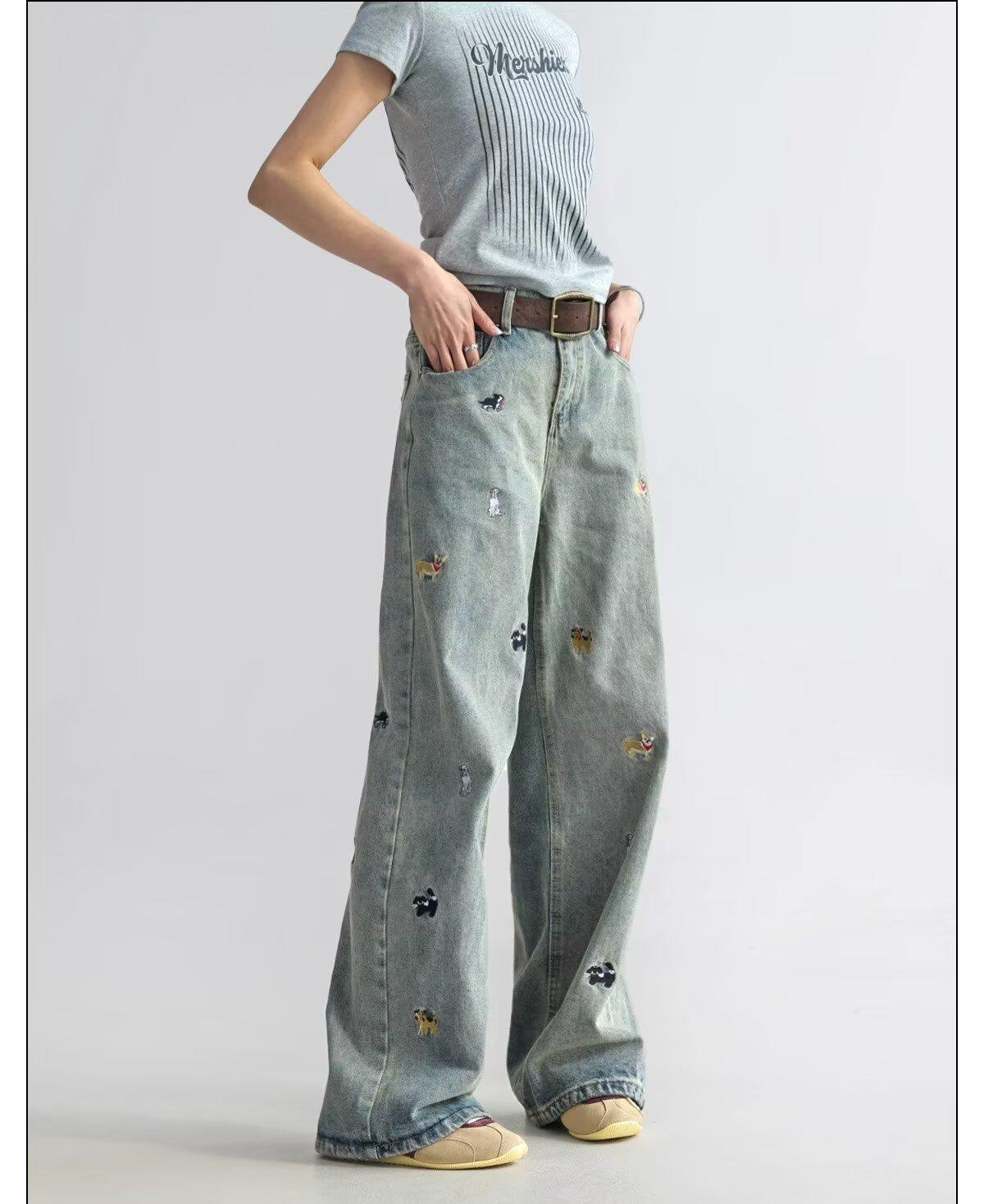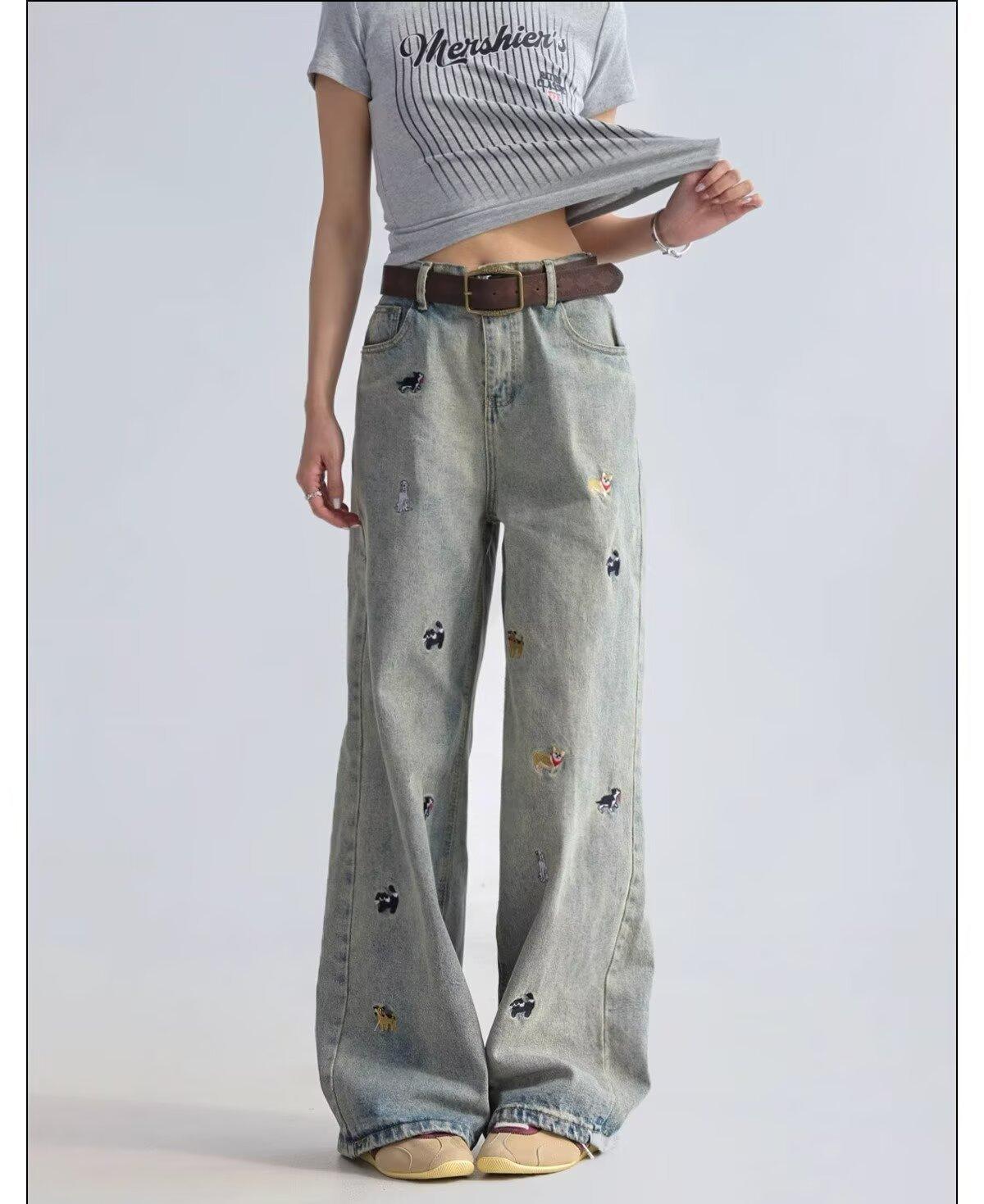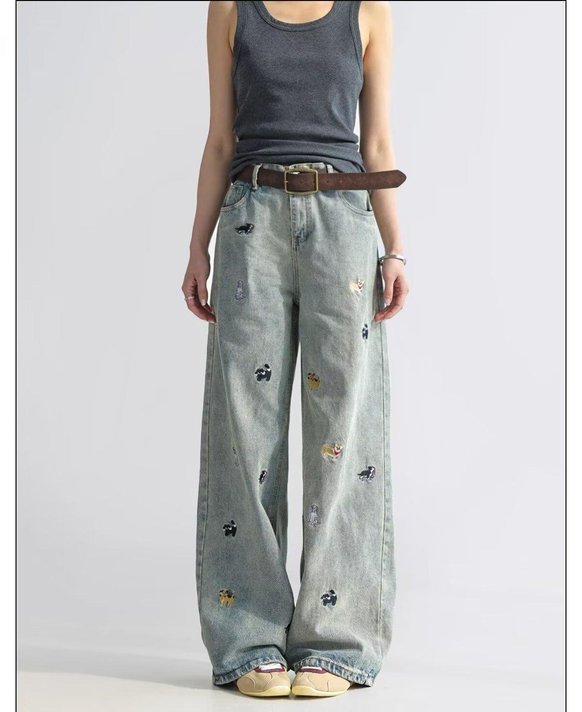 Jeans de Bordado Lúdico para Mujer 2025 Nuevo Pantalón Holgado de Pierna Ancha hasta el Piso de Cintura Alta Adelgazante de Pierna Recta Versátil