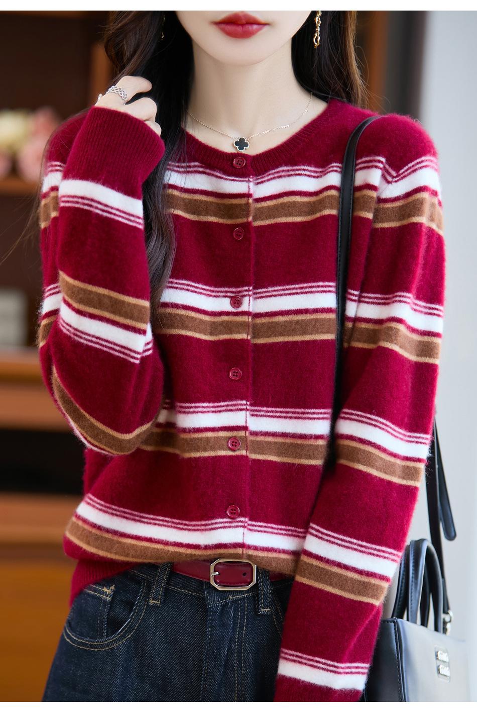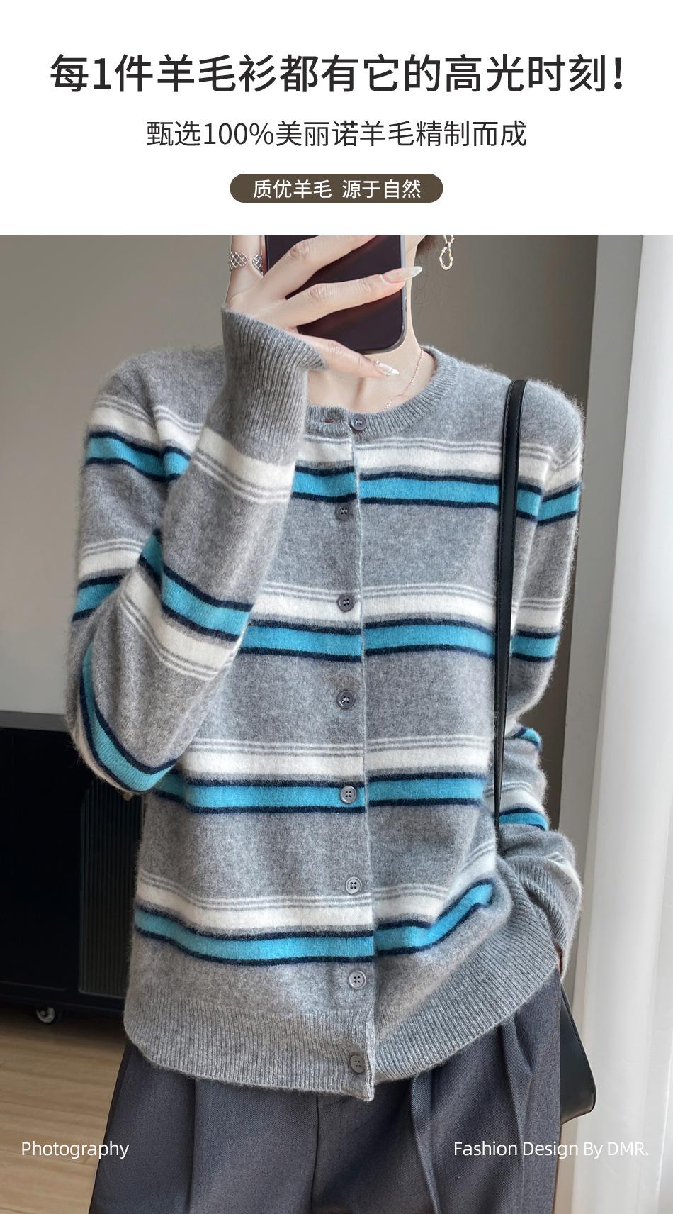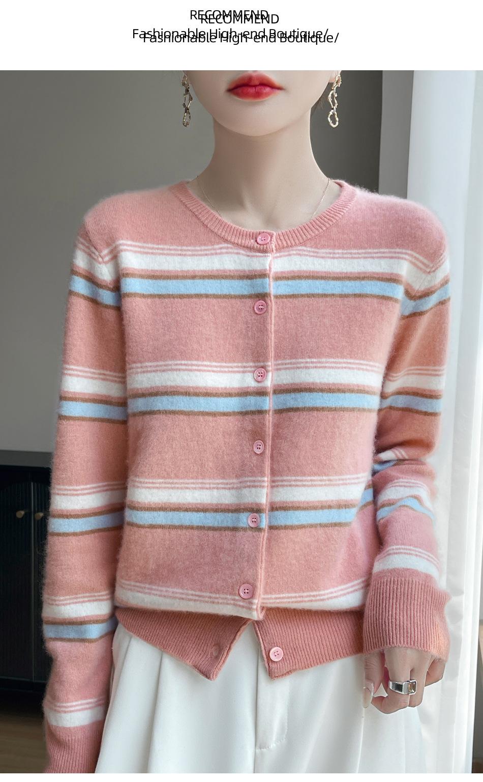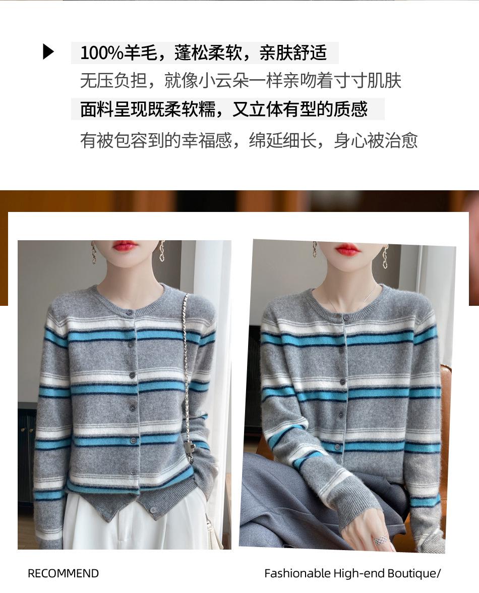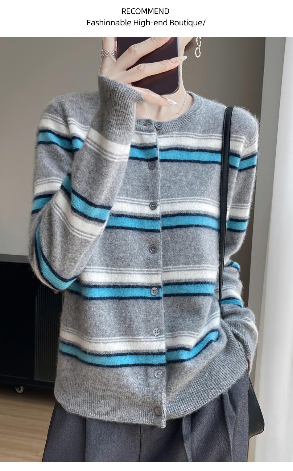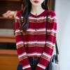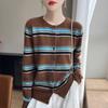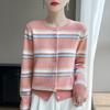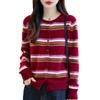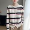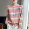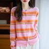 Suéter de cuello redondo para mujer 100% lana pura Cárdigan de punto Otoño e Invierno Nuevo Suéter a rayas con bloque de color adelgazante