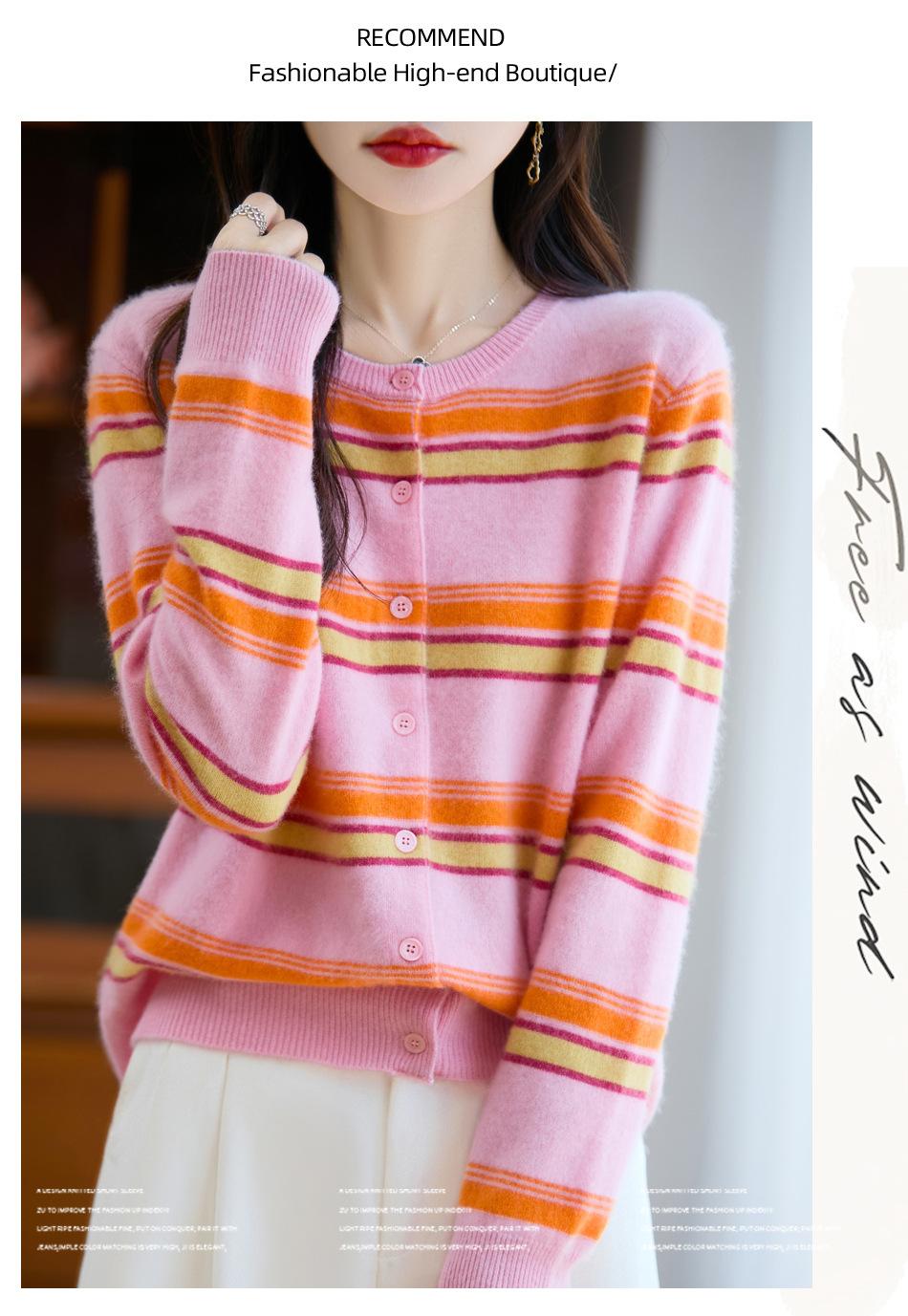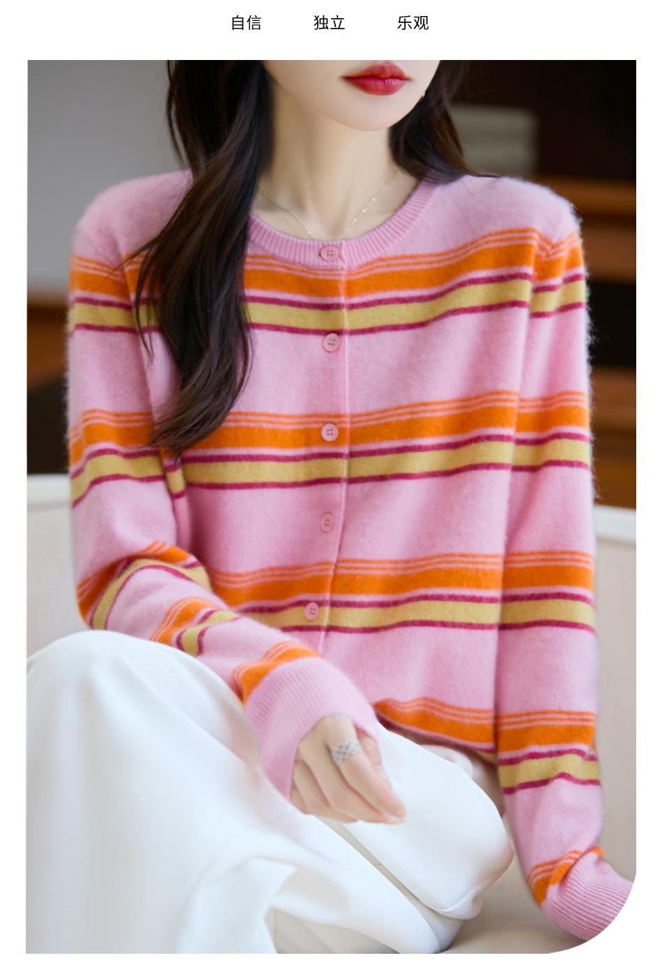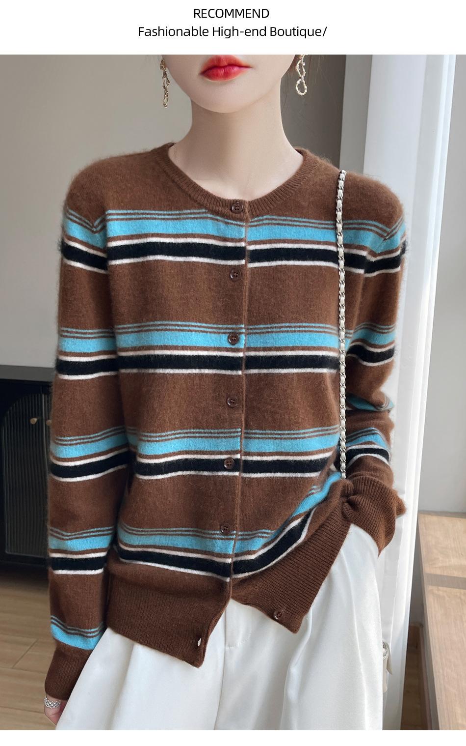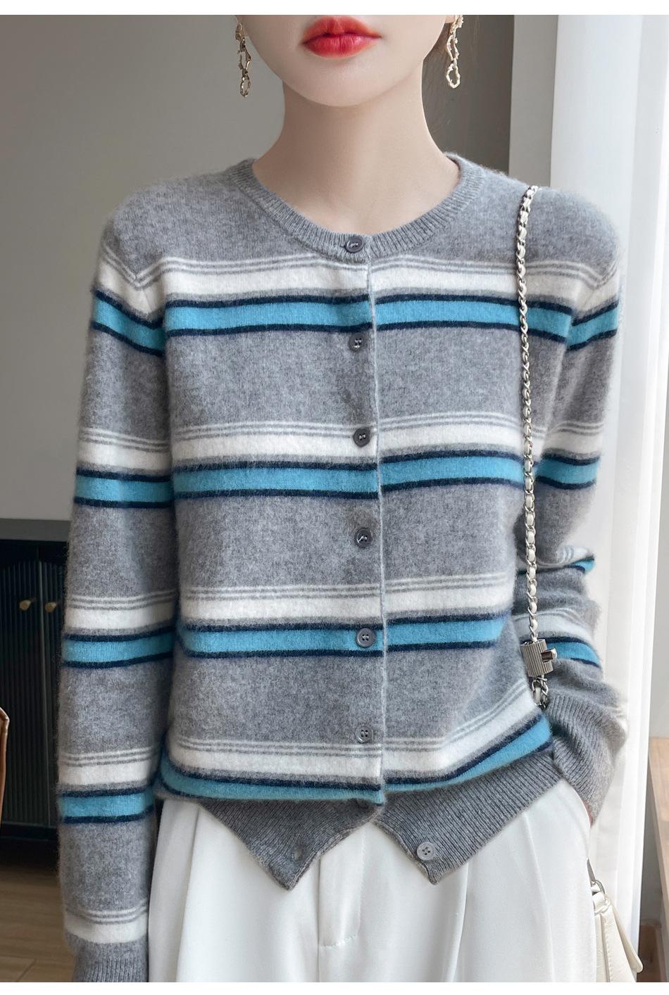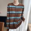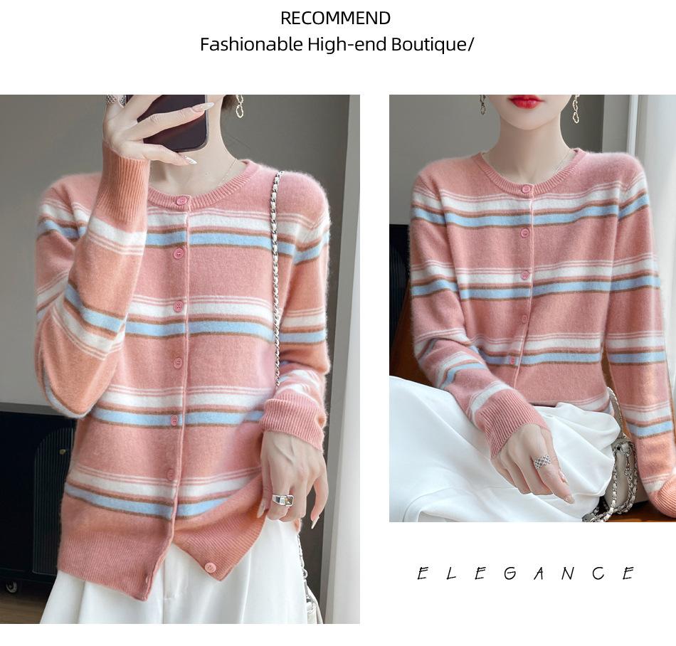 Suéter de cuello redondo para mujer 100% lana pura Cárdigan de punto Otoño e Invierno Nuevo Suéter a rayas con bloque de color adelgazante