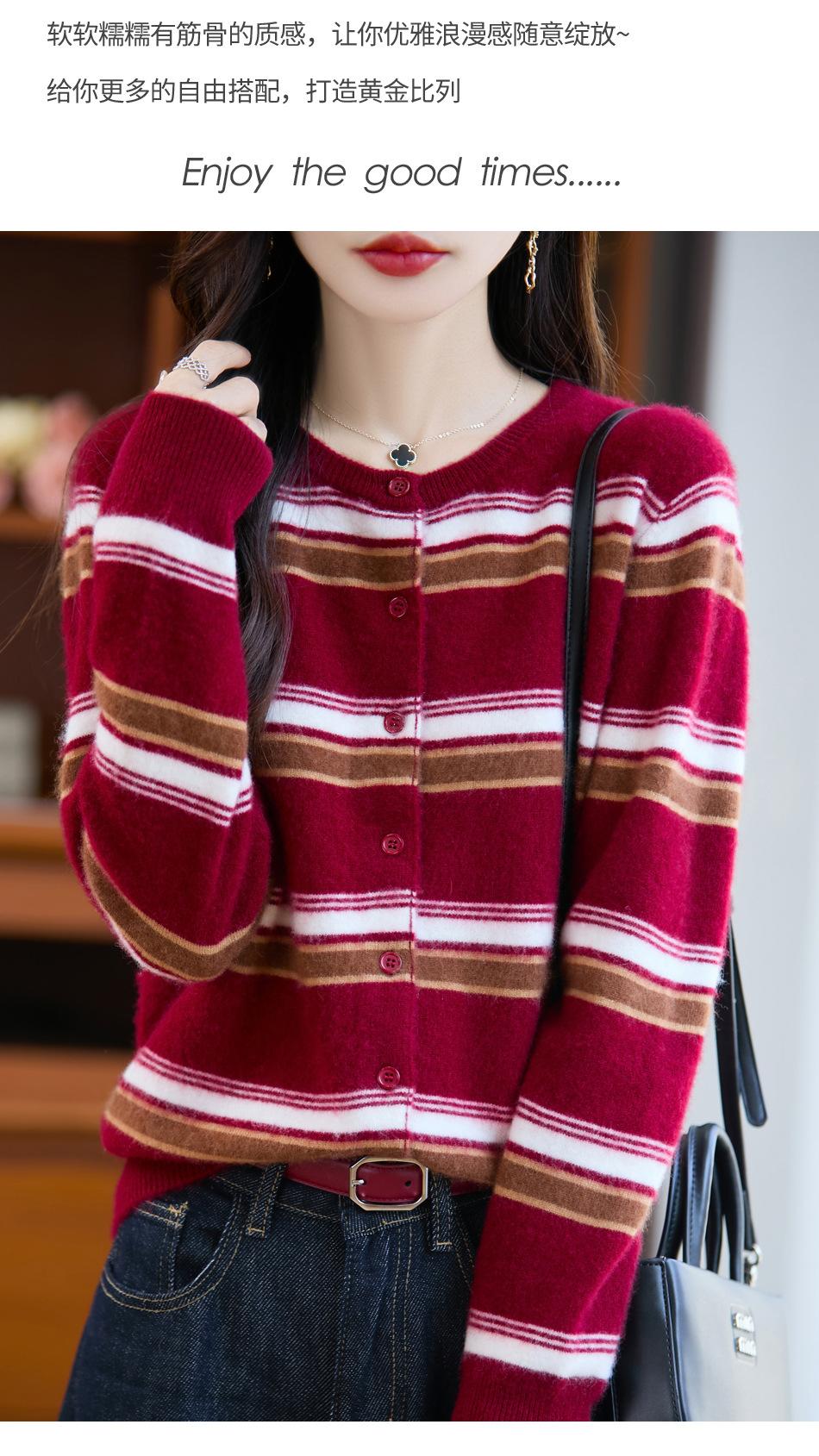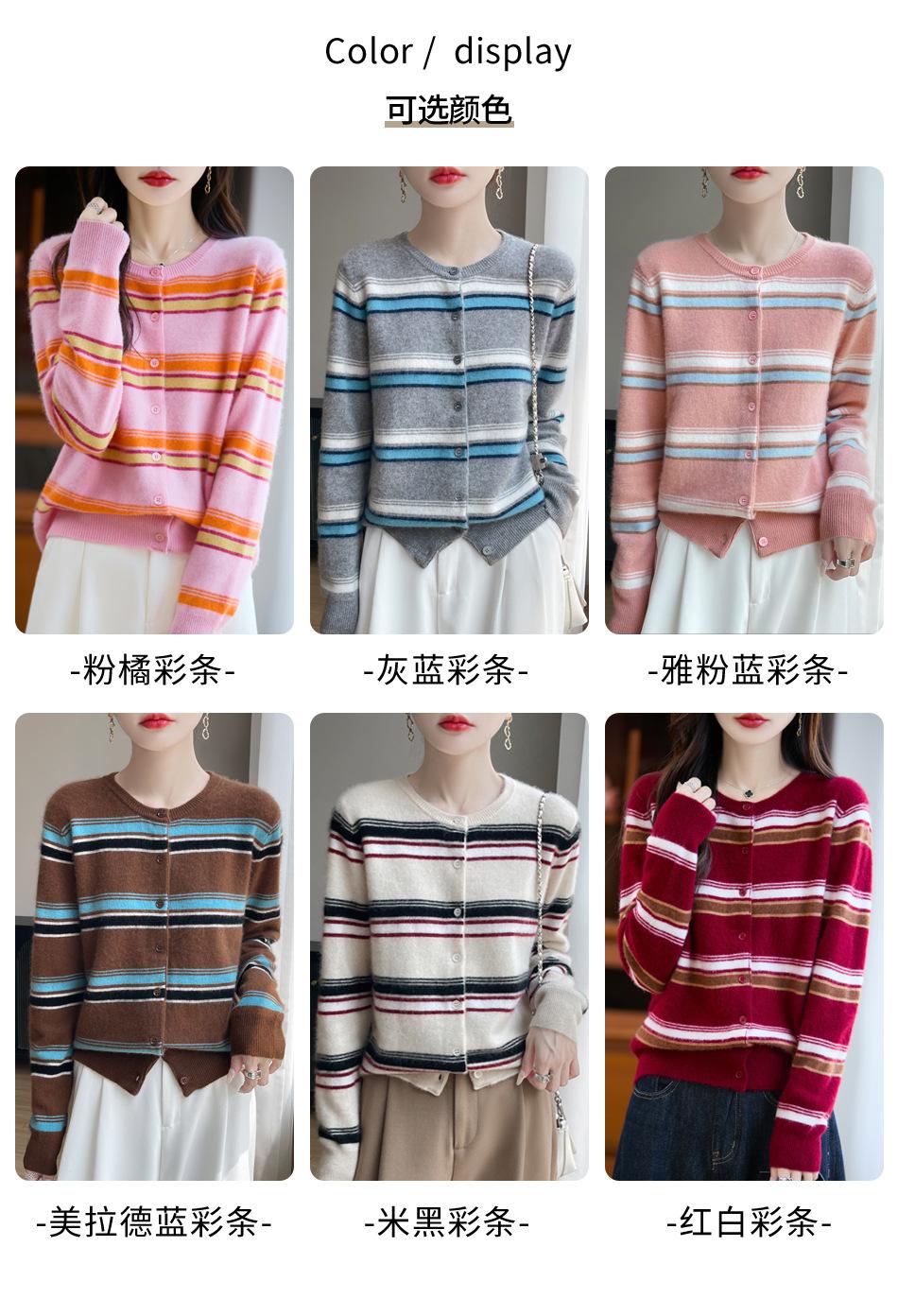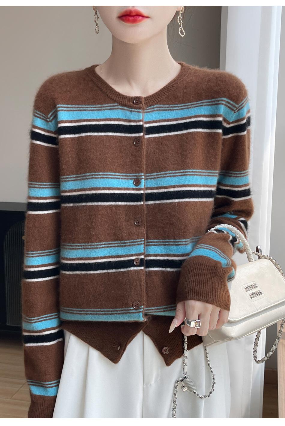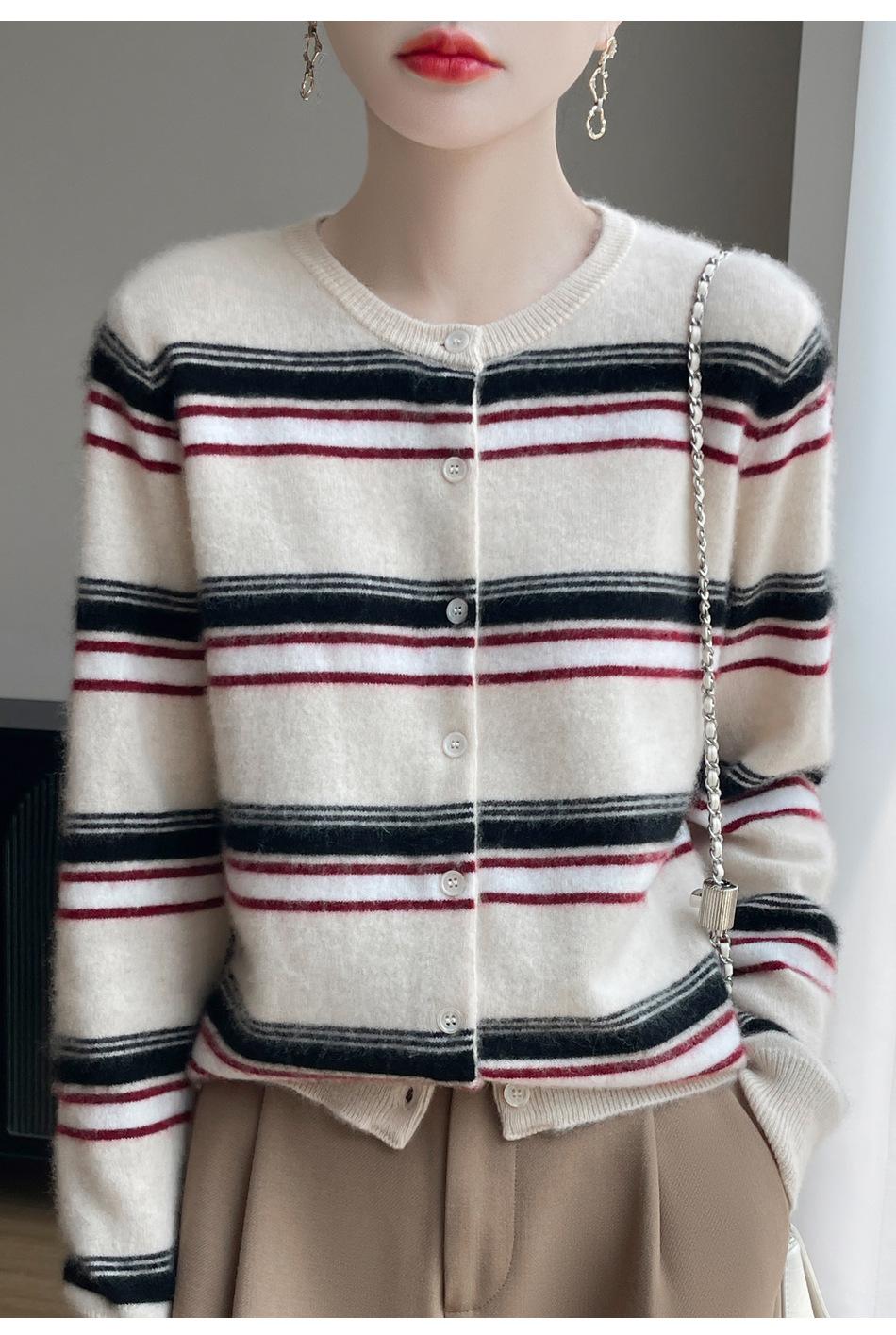 Suéter de cuello redondo para mujer 100% lana pura Cárdigan de punto Otoño e Invierno Nuevo Suéter a rayas con bloque de color adelgazante