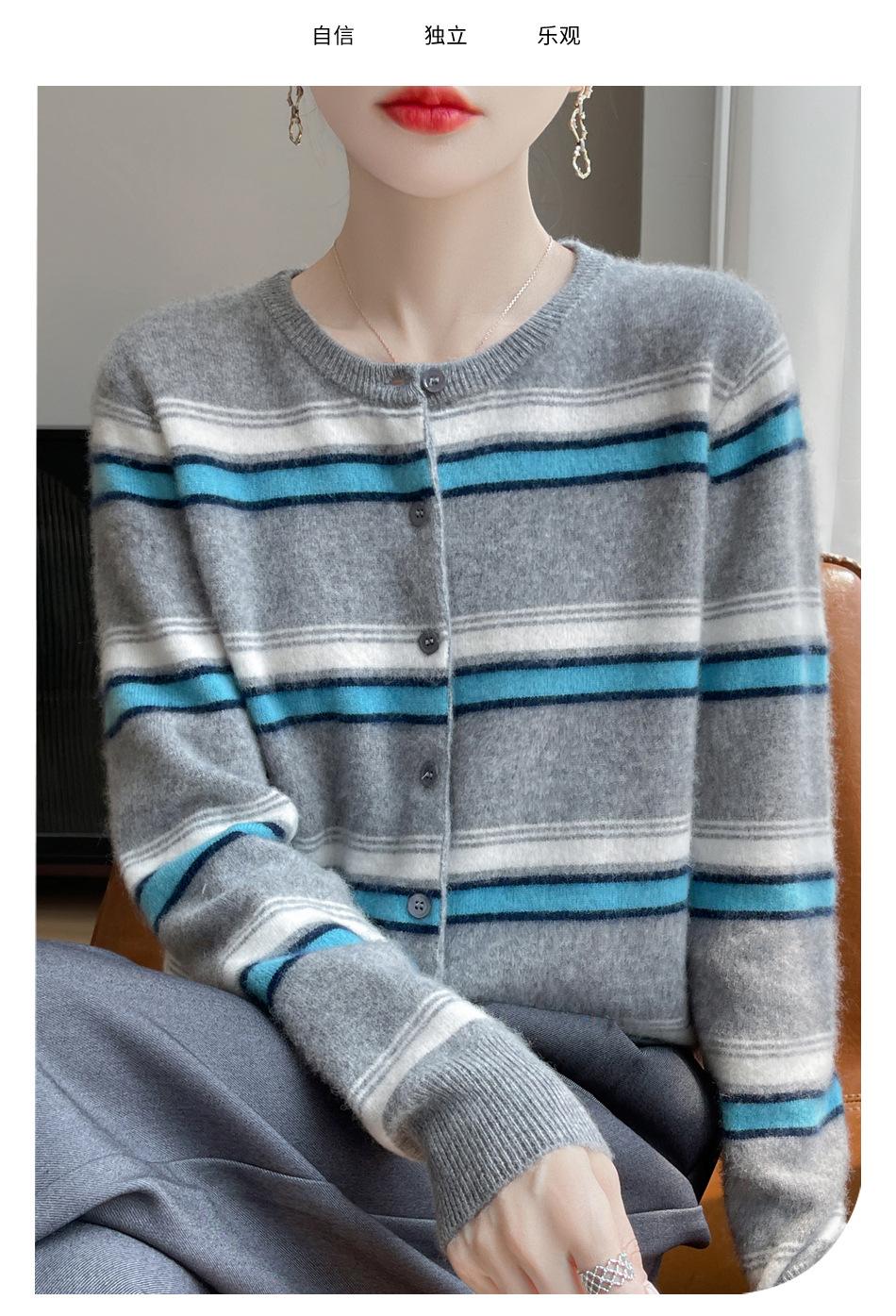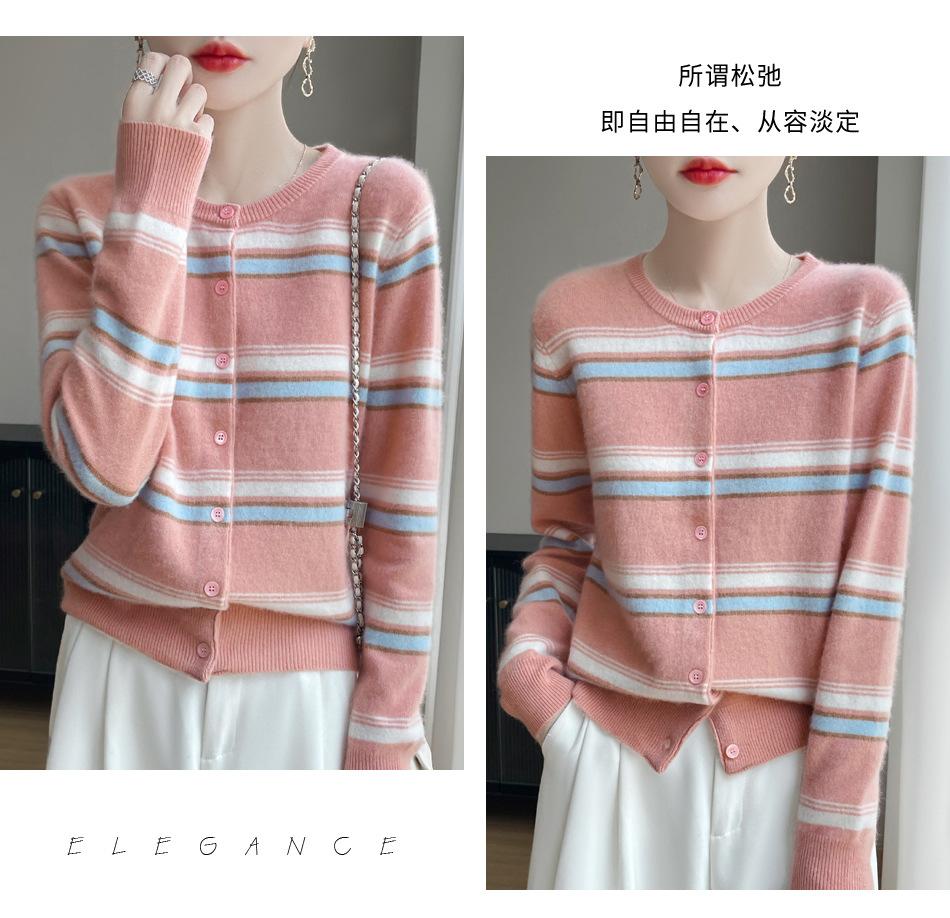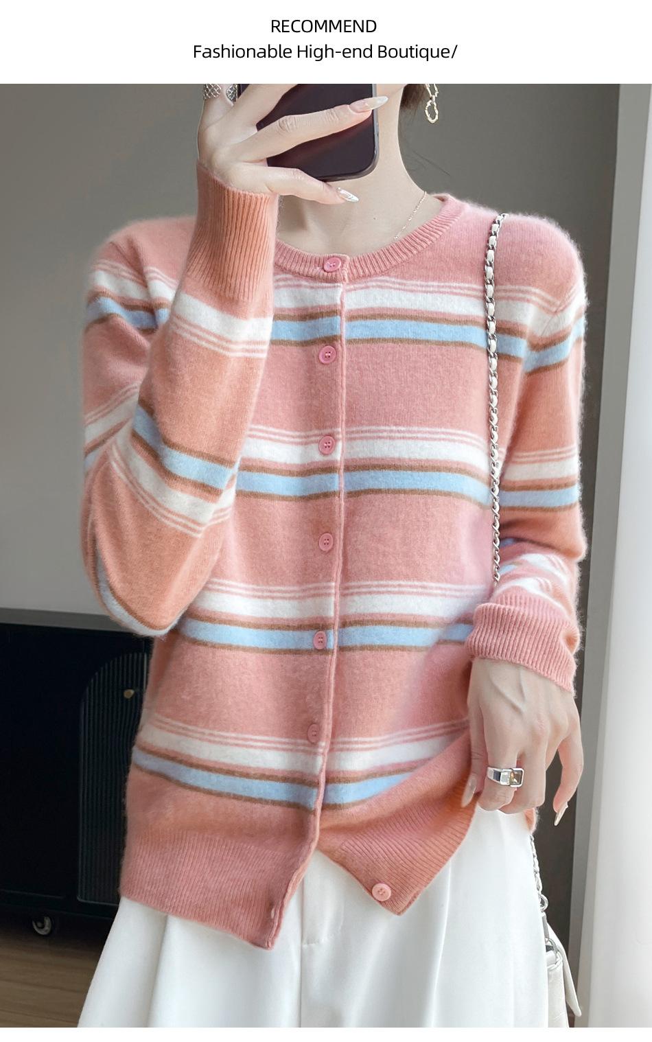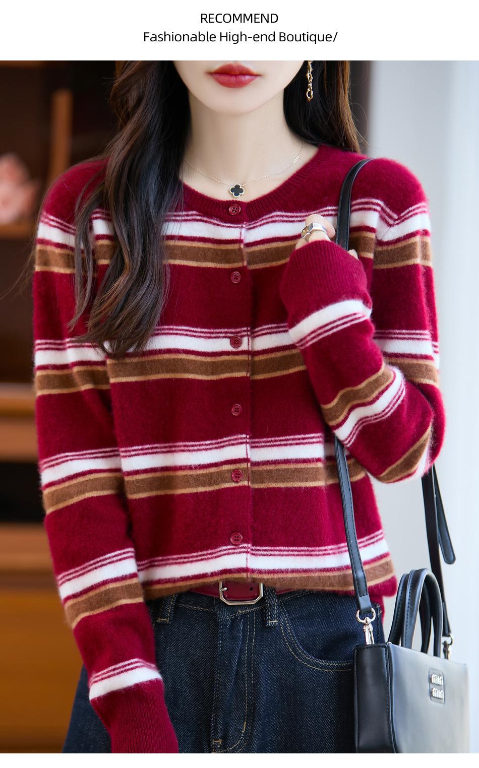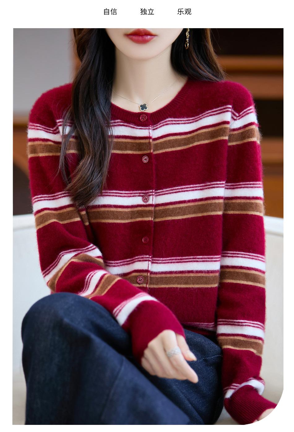 Suéter de cuello redondo para mujer 100% lana pura Cárdigan de punto Otoño e Invierno Nuevo Suéter a rayas con bloque de color adelgazante