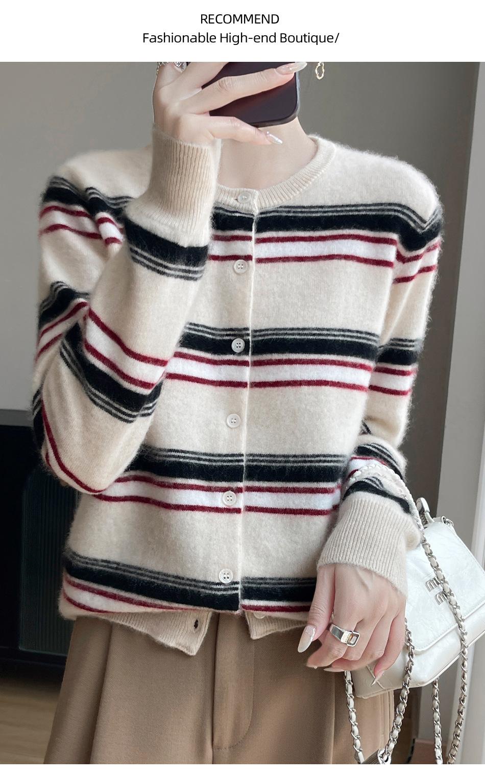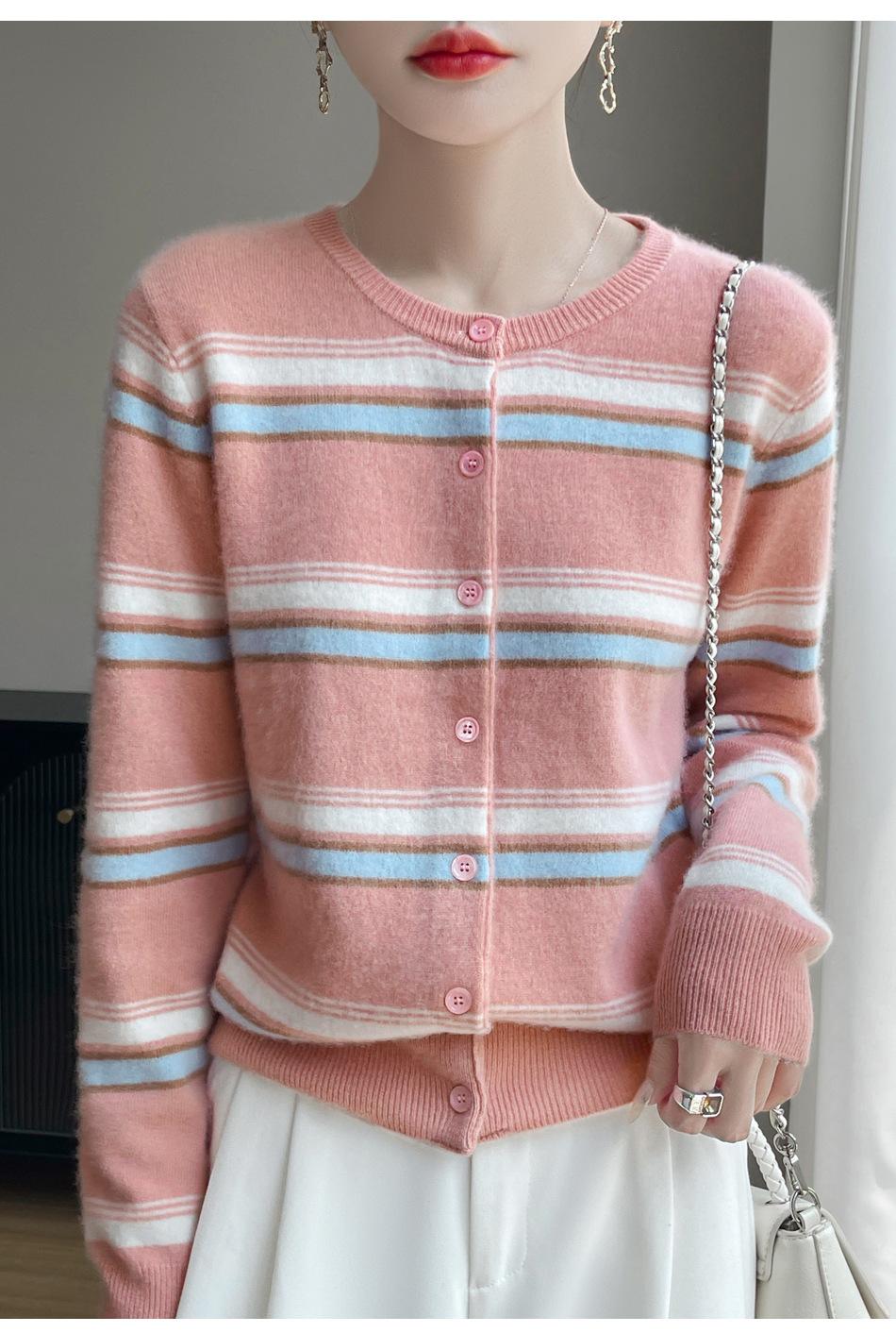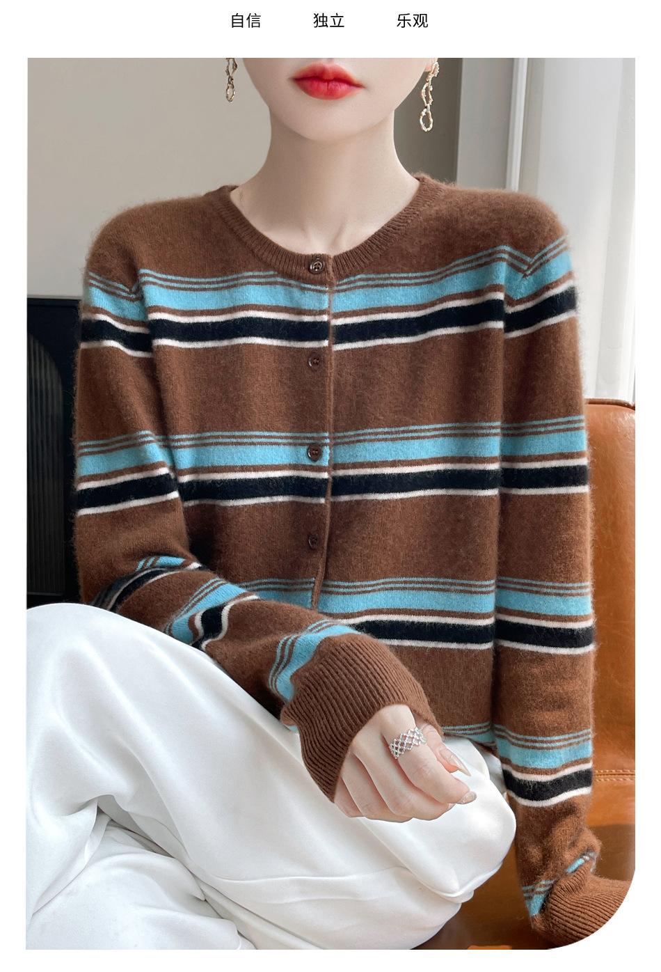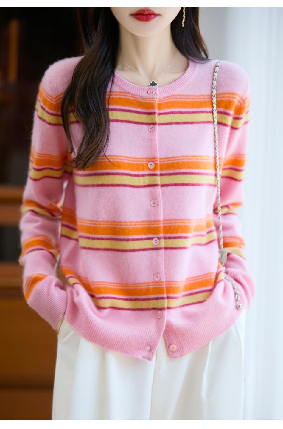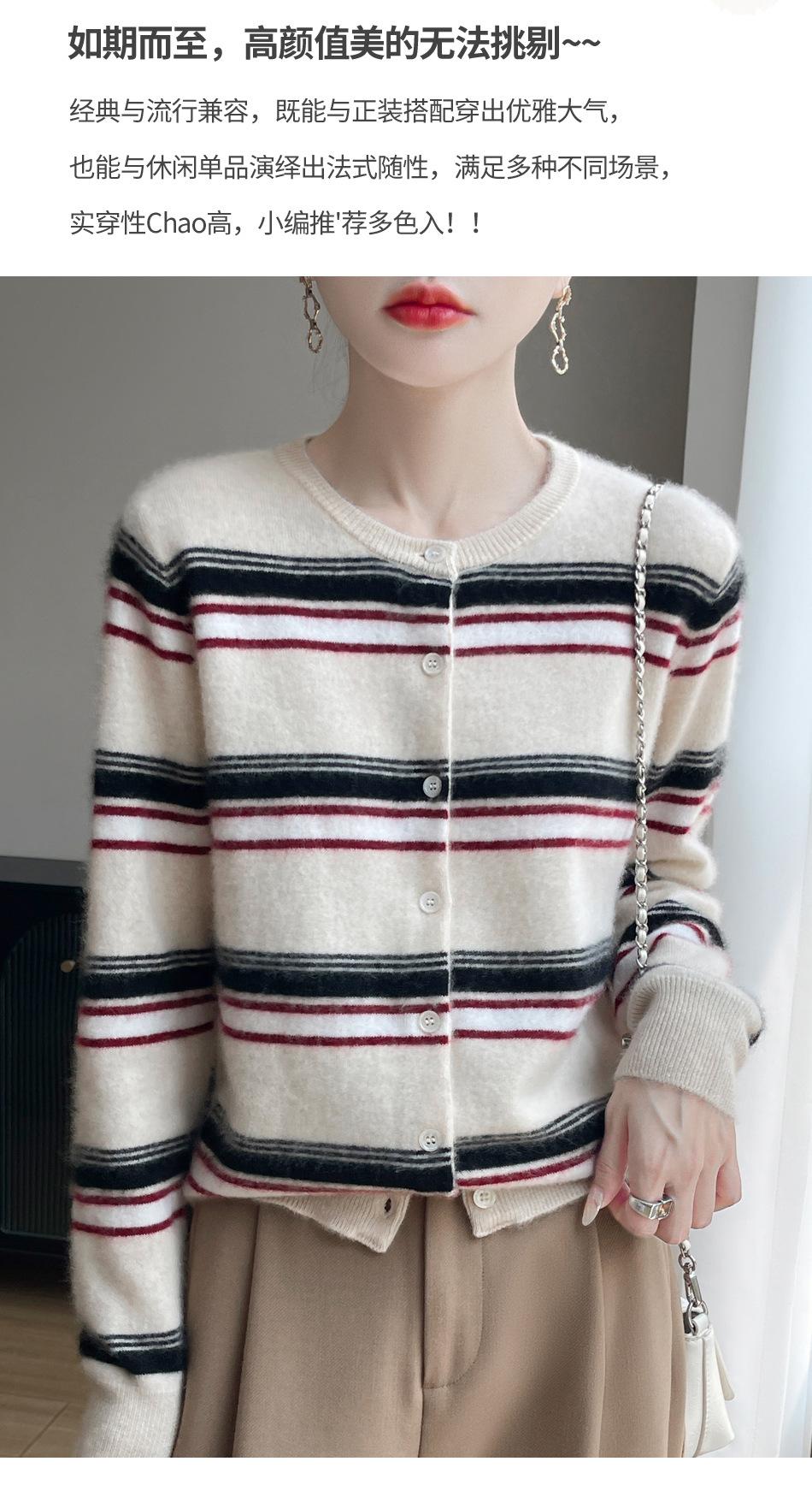 Suéter de cuello redondo para mujer 100% lana pura Cárdigan de punto Otoño e Invierno Nuevo Suéter a rayas con bloque de color adelgazante