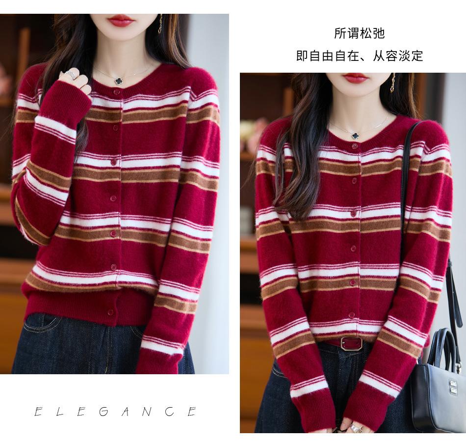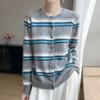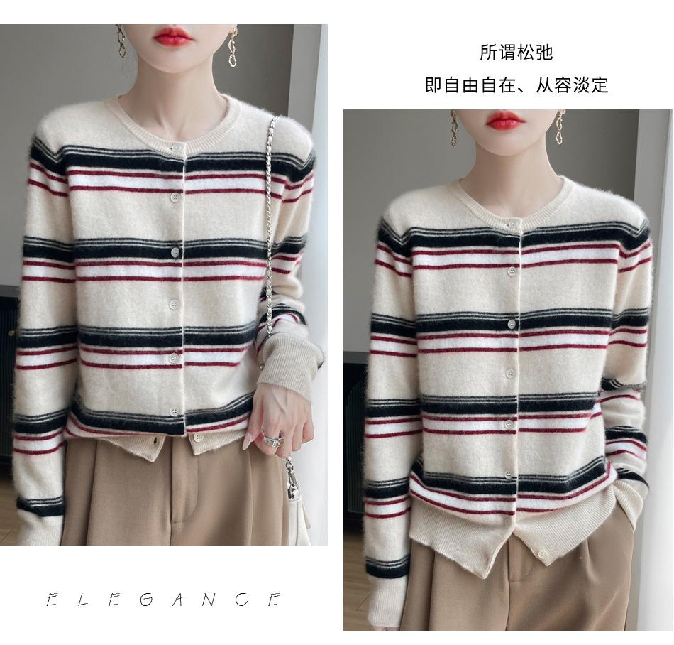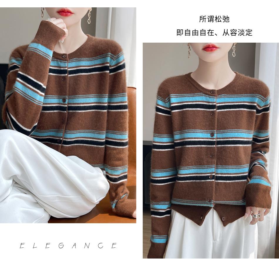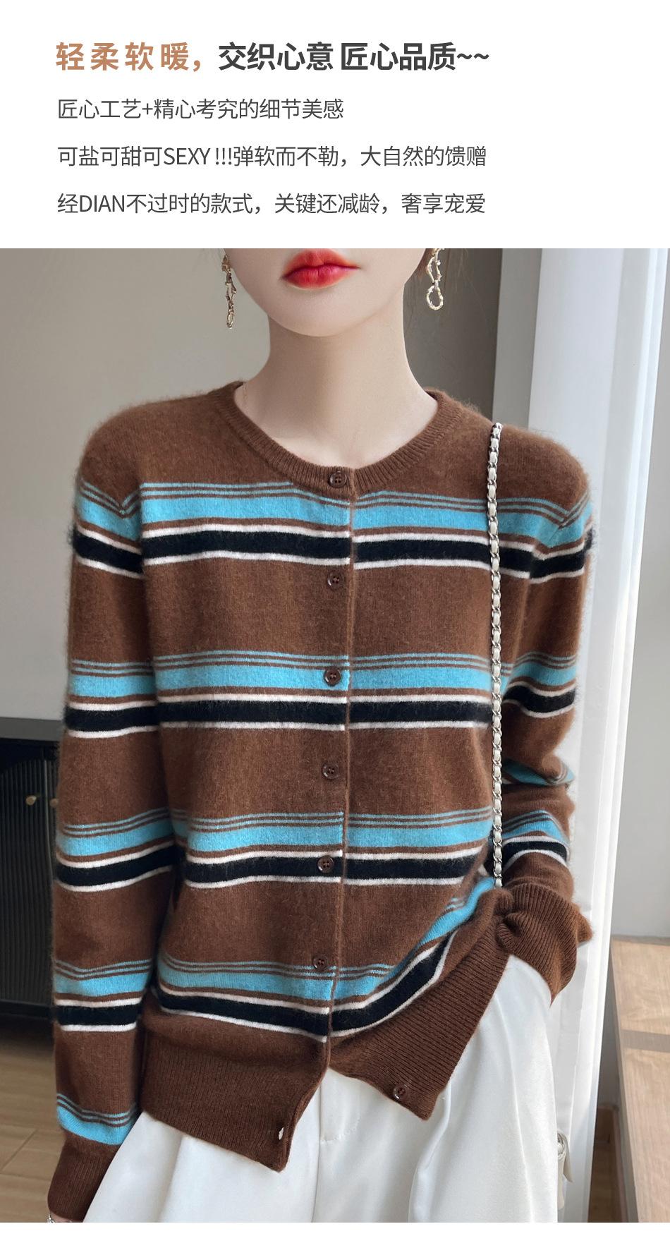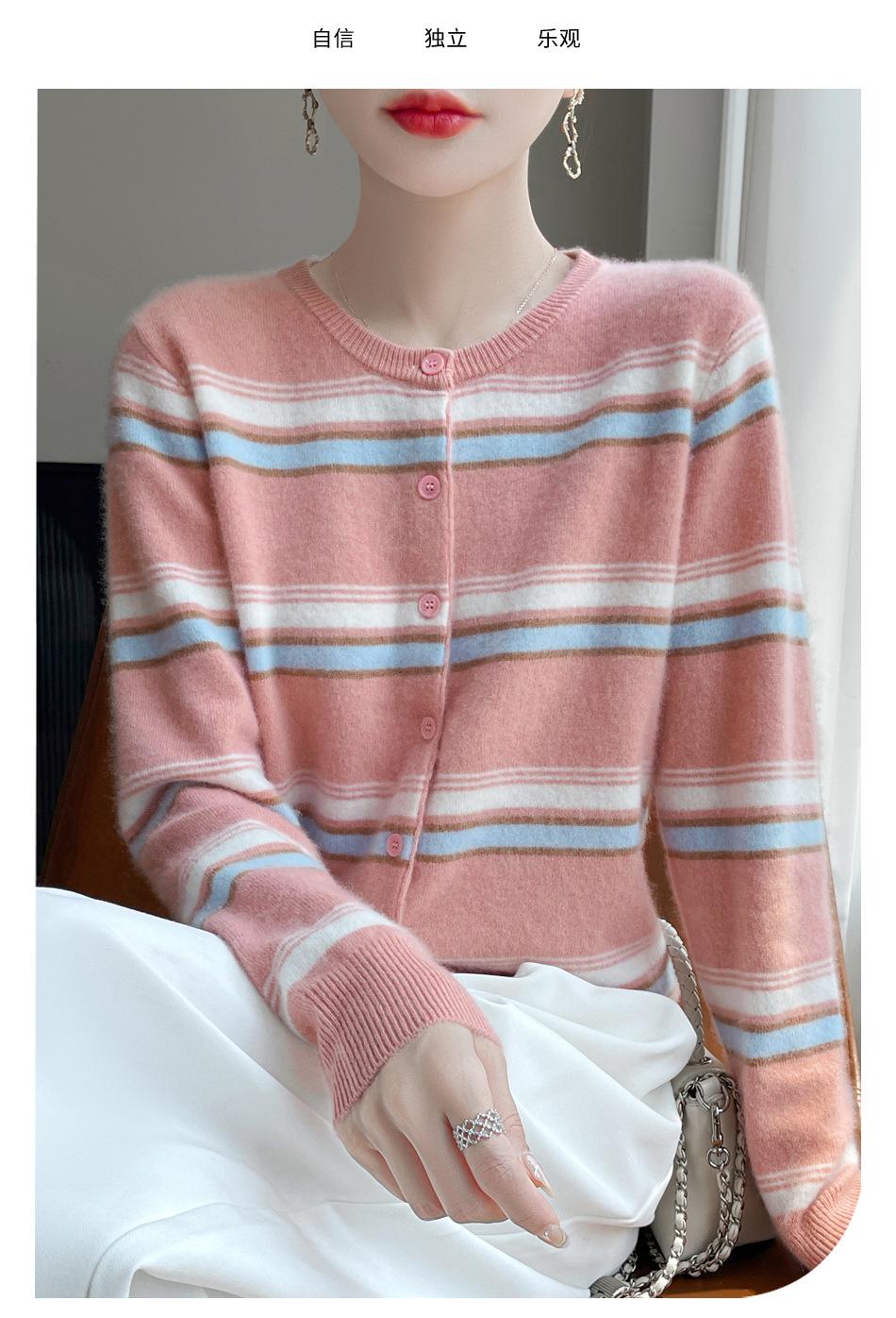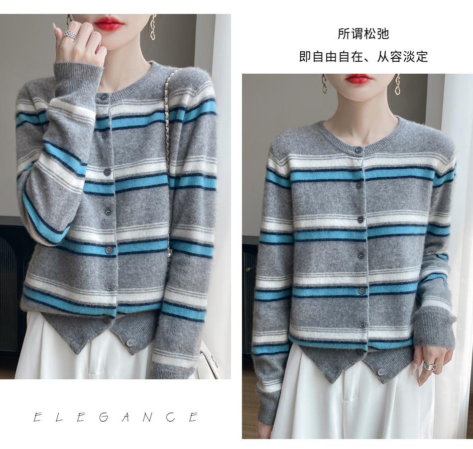 Suéter de cuello redondo para mujer 100% lana pura Cárdigan de punto Otoño e Invierno Nuevo Suéter a rayas con bloque de color adelgazante
