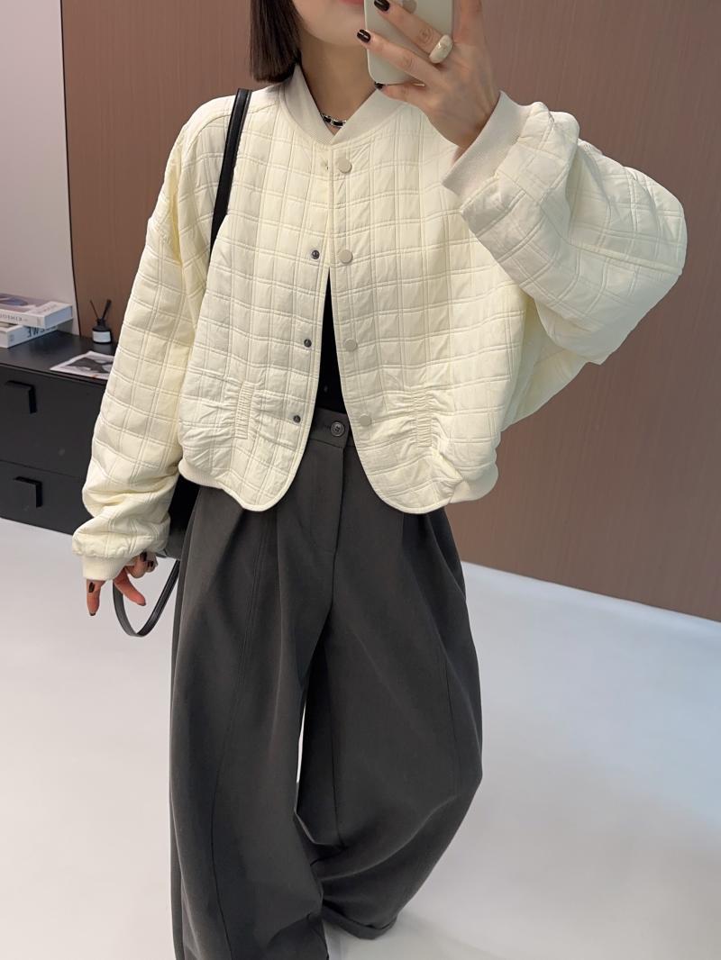 Otoño 2025 Nuevo Moda Coreana Cuello Redondo Manga Farol Argyle Algodón Delgado Chaqueta Corta Mujer Suelto Uniforme de Béisbol Top