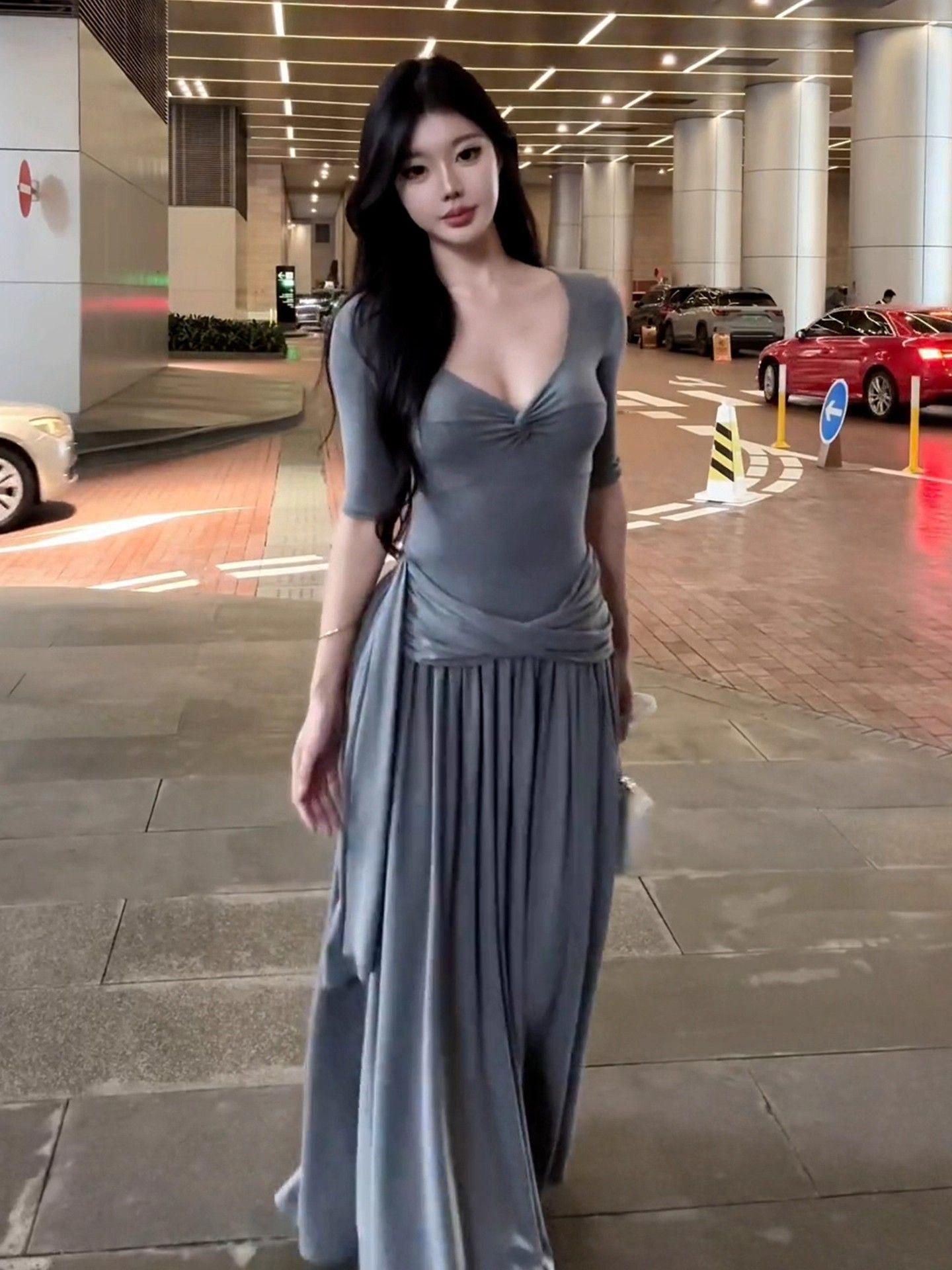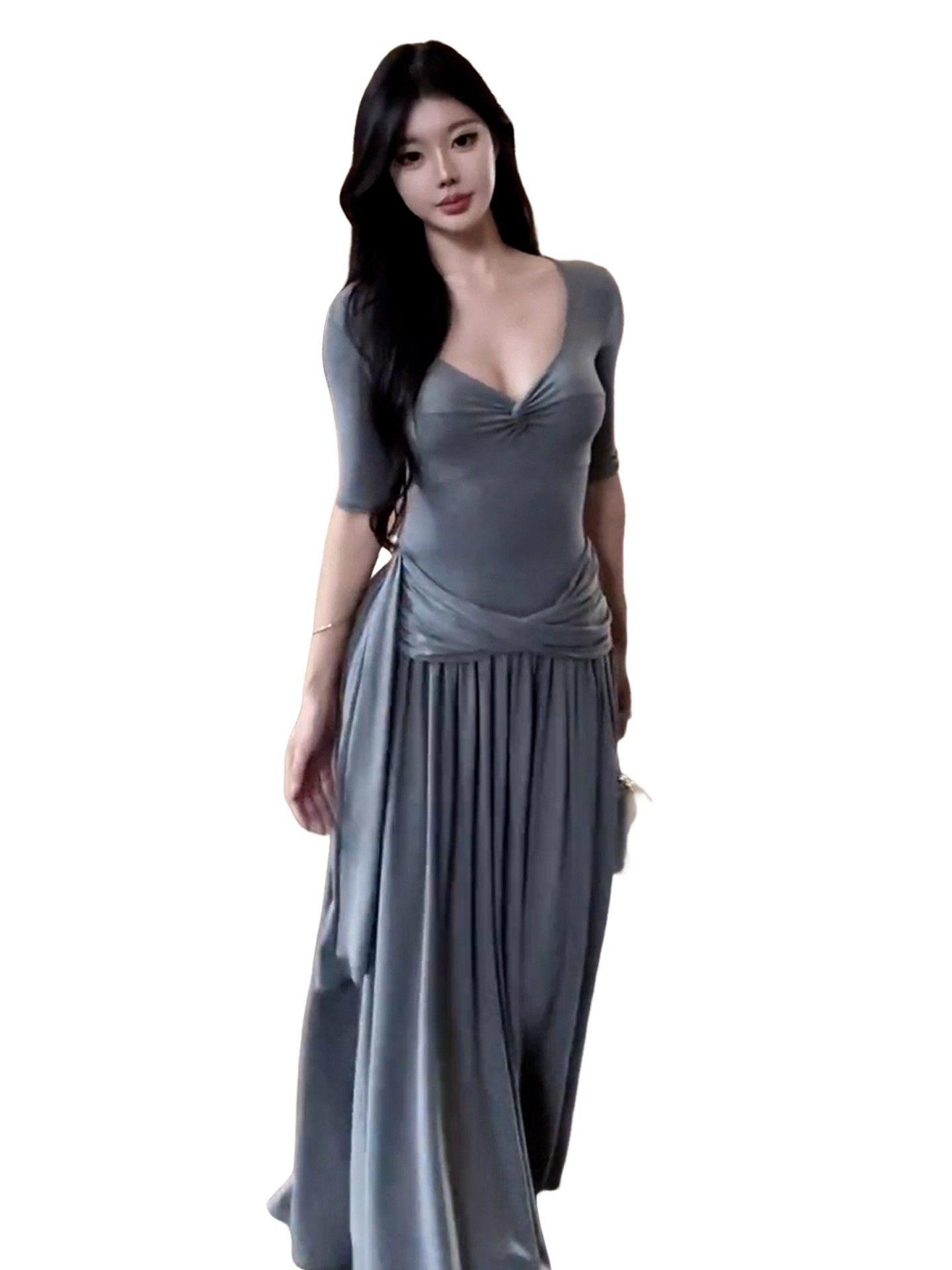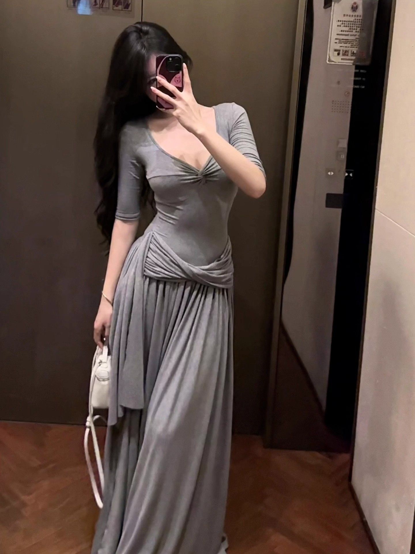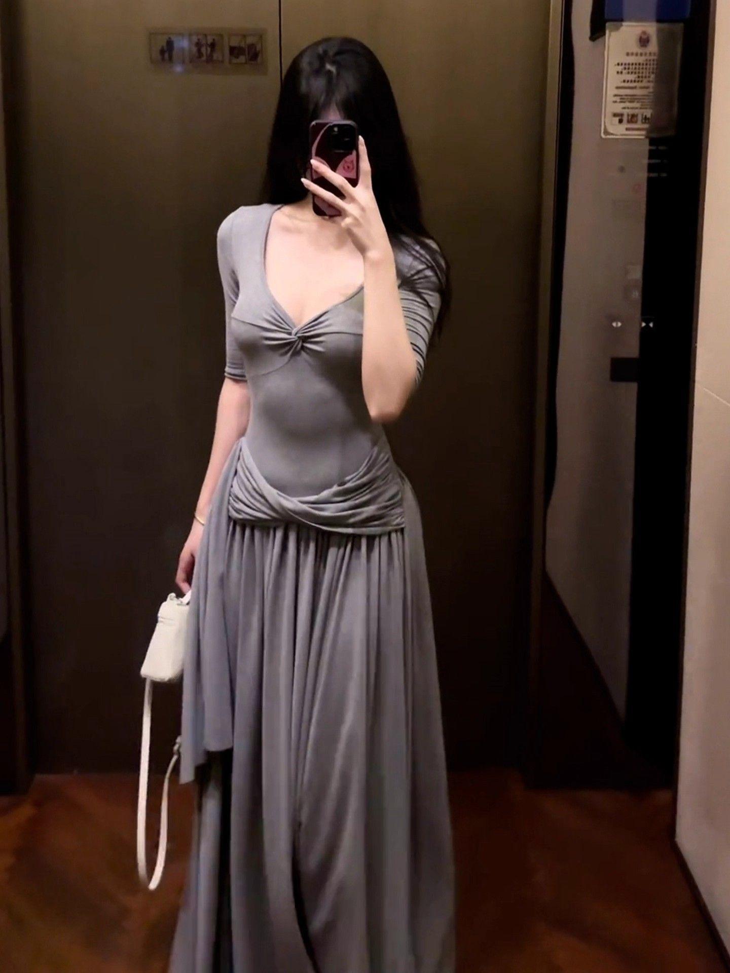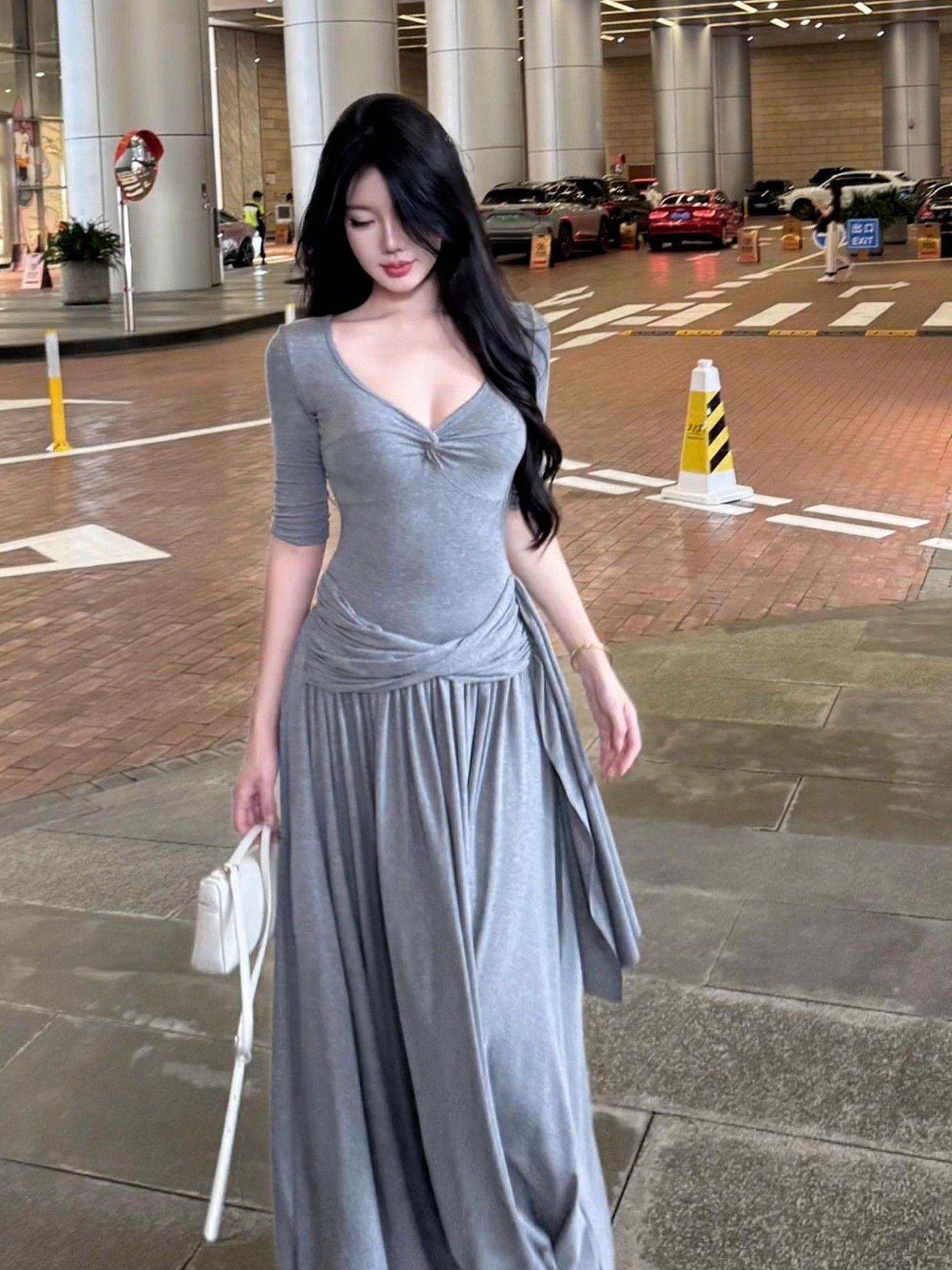 Vestido francés puro y sexy de cuello en V gris 2025 verano nuevo de alta gama ceñido a la cintura adelgazante bodycon vestido largo