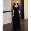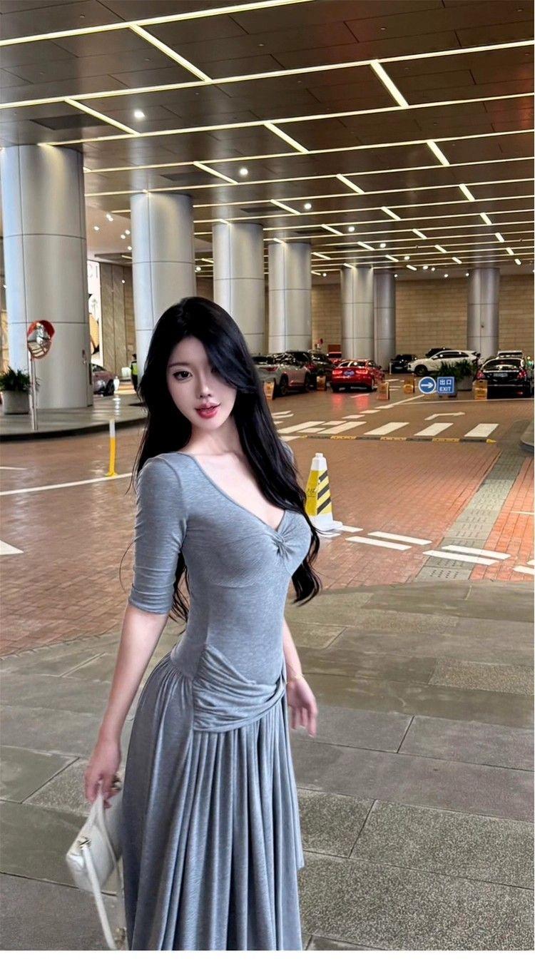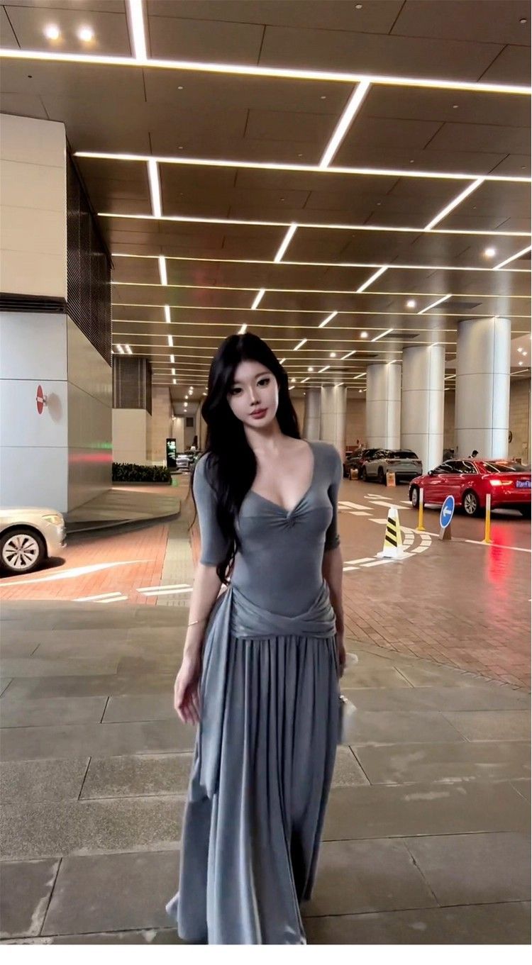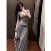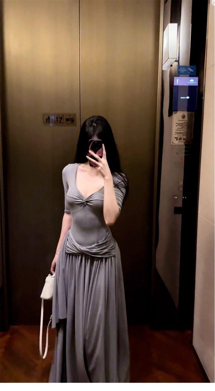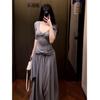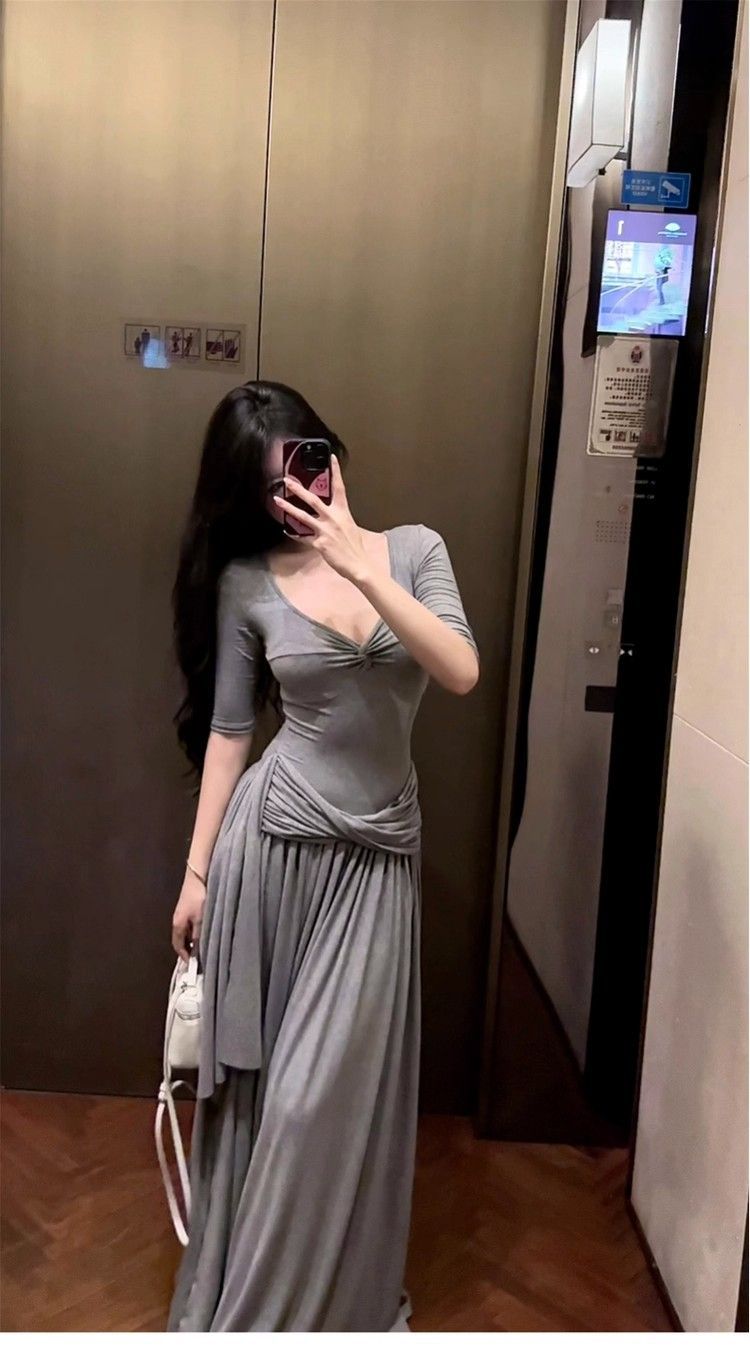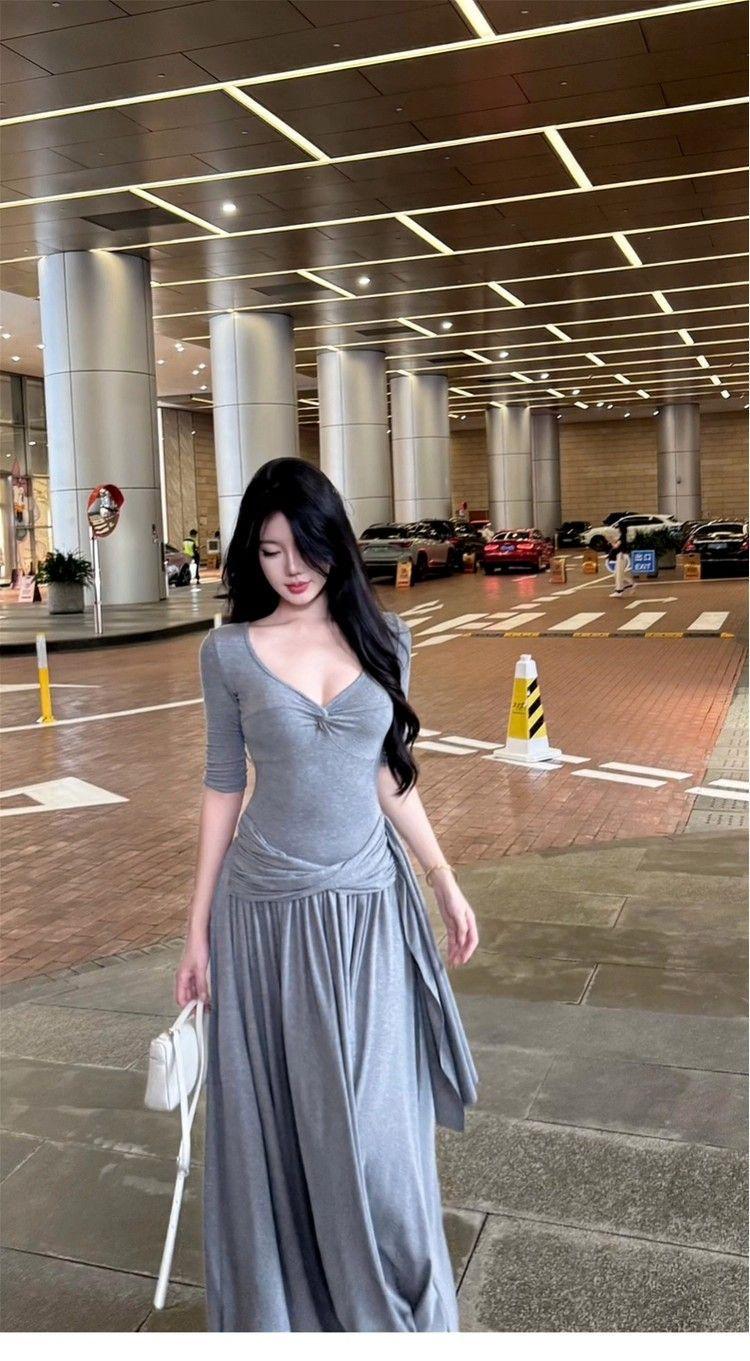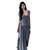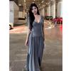 Vestido francés puro y sexy de cuello en V gris 2025 verano nuevo de alta gama ceñido a la cintura adelgazante bodycon vestido largo