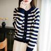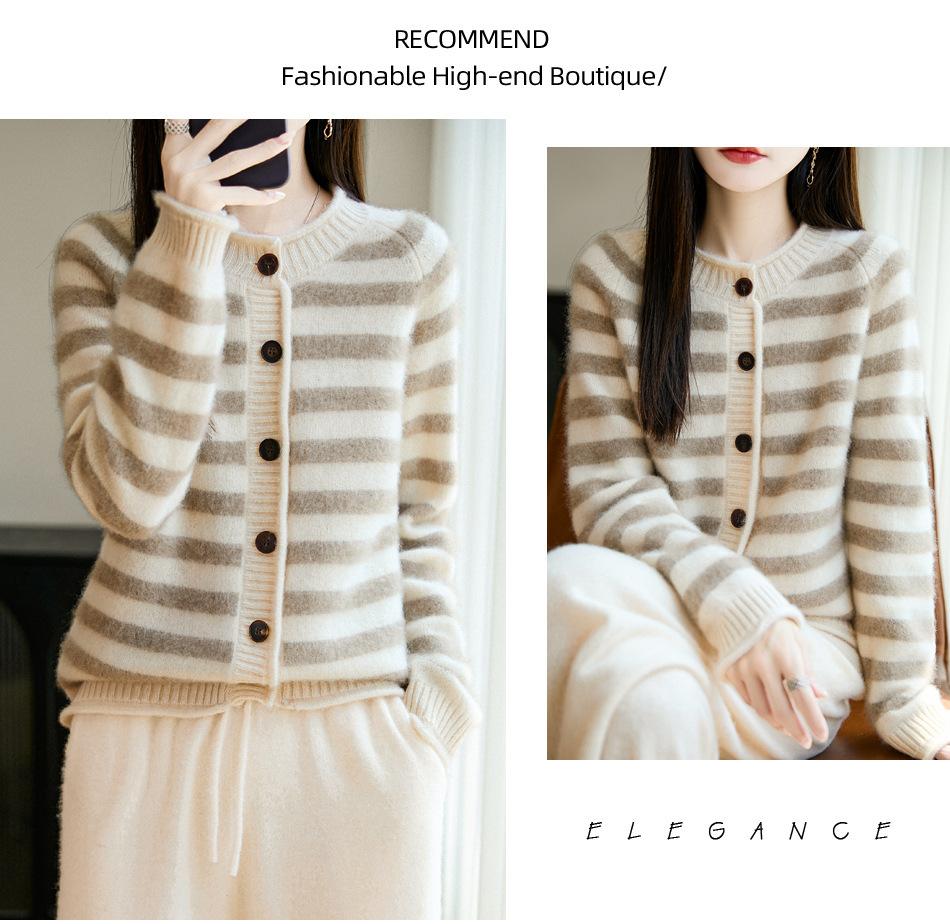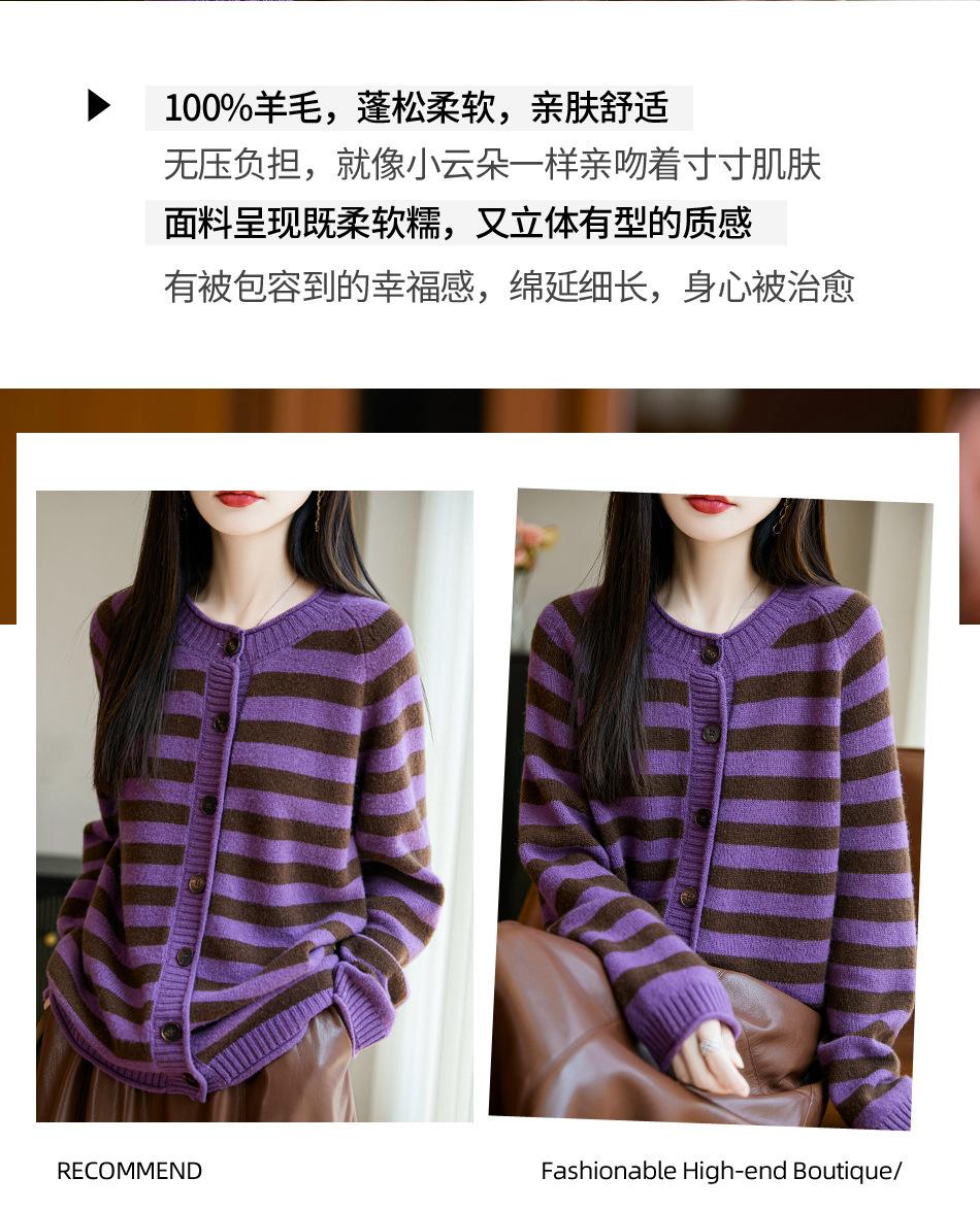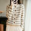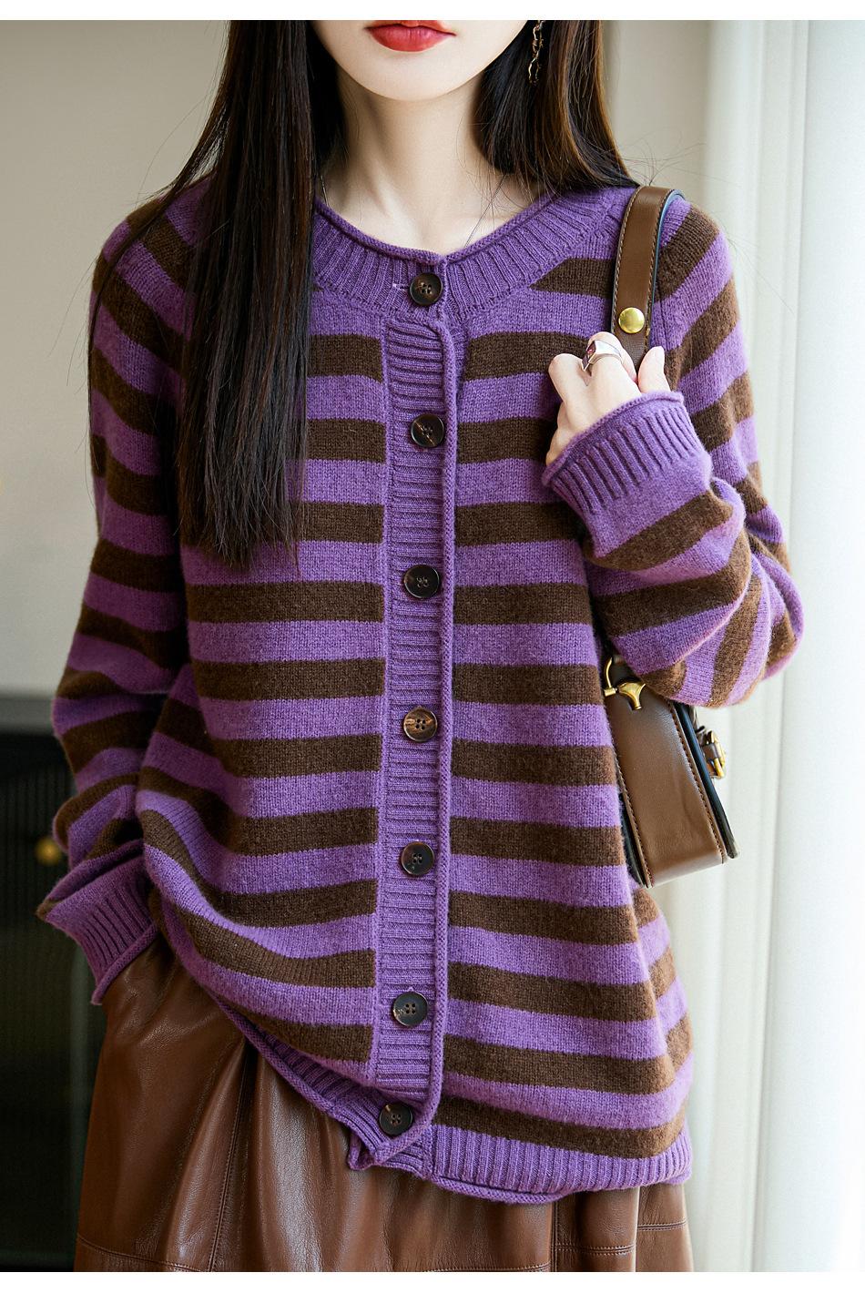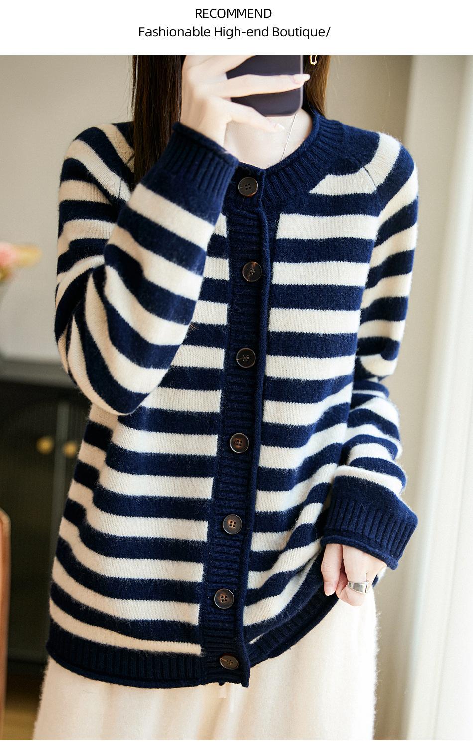 Suéter 100% Lana Pura Tejido Grueso de Siete Agujas Cuello Redondo Cárdigan de Punto Suéter de Bloques de Color a Rayas para Mujer Marea