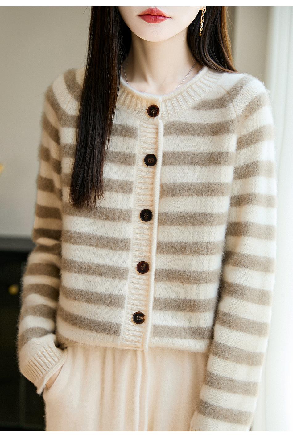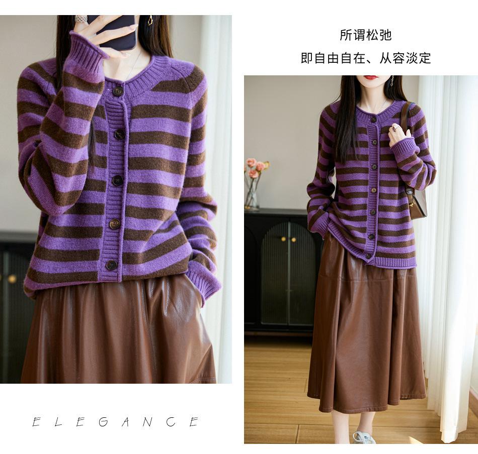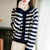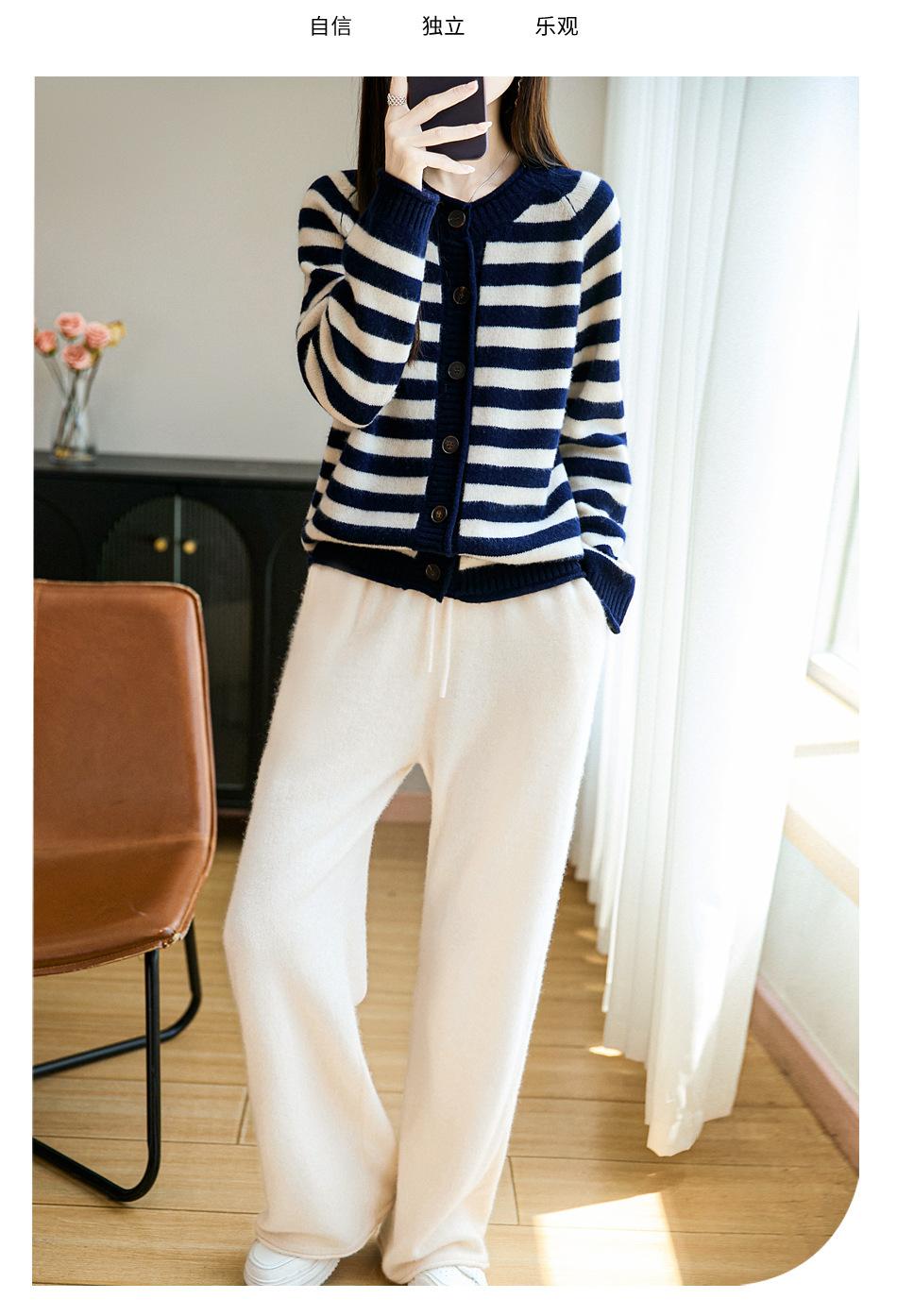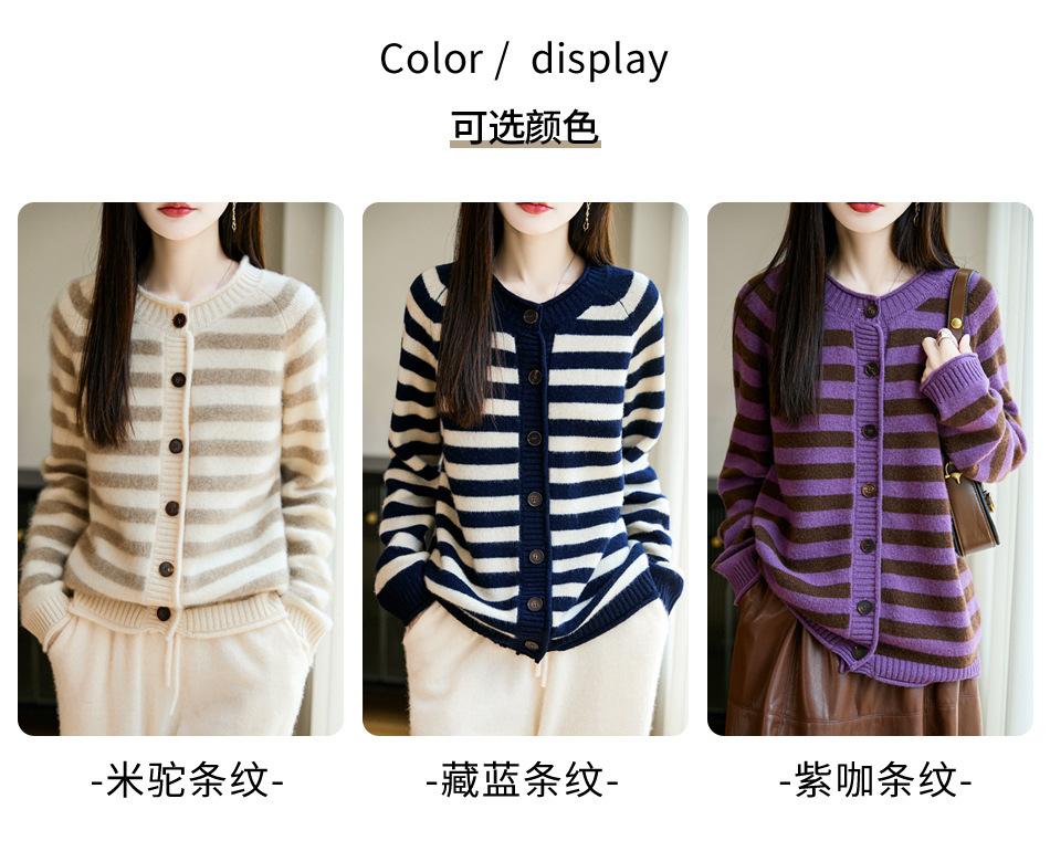 Suéter 100% Lana Pura Tejido Grueso de Siete Agujas Cuello Redondo Cárdigan de Punto Suéter de Bloques de Color a Rayas para Mujer Marea