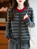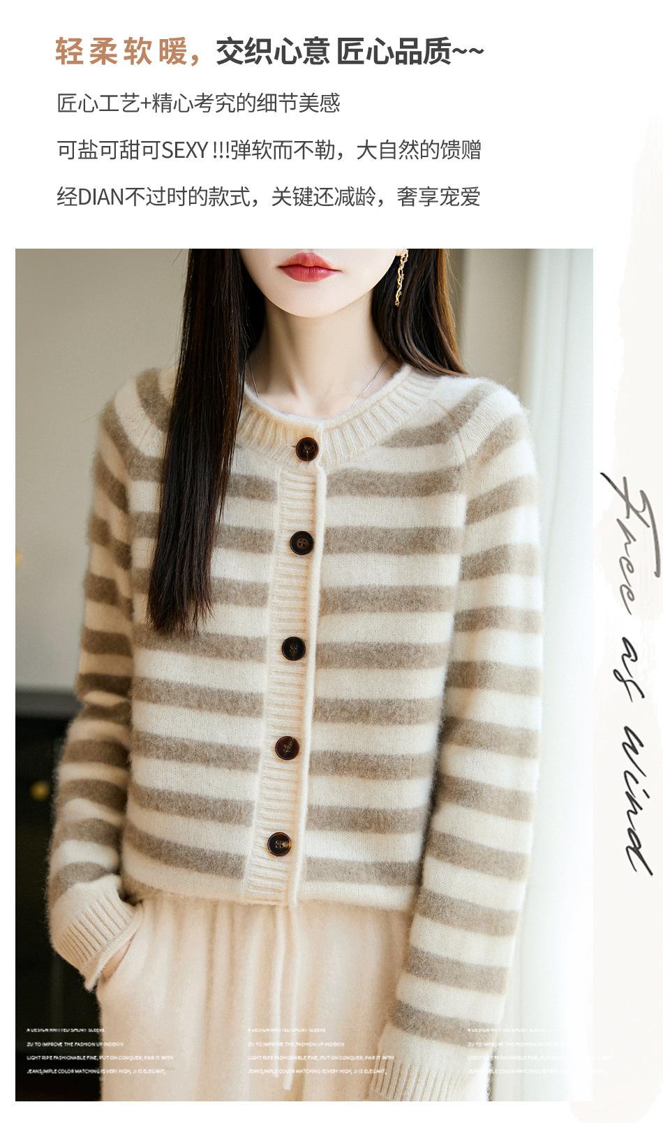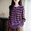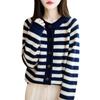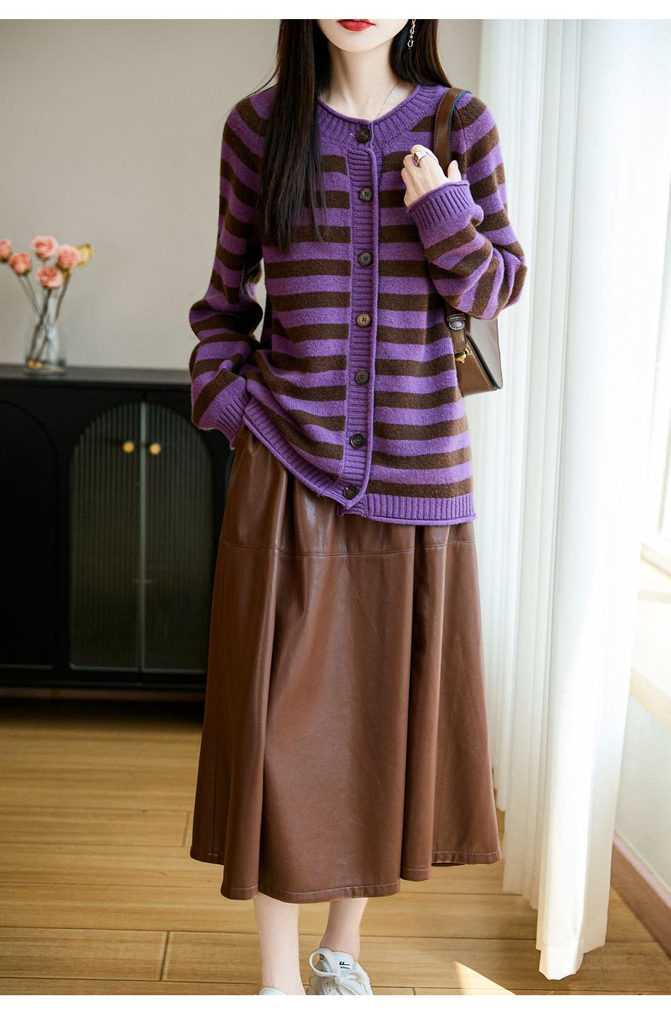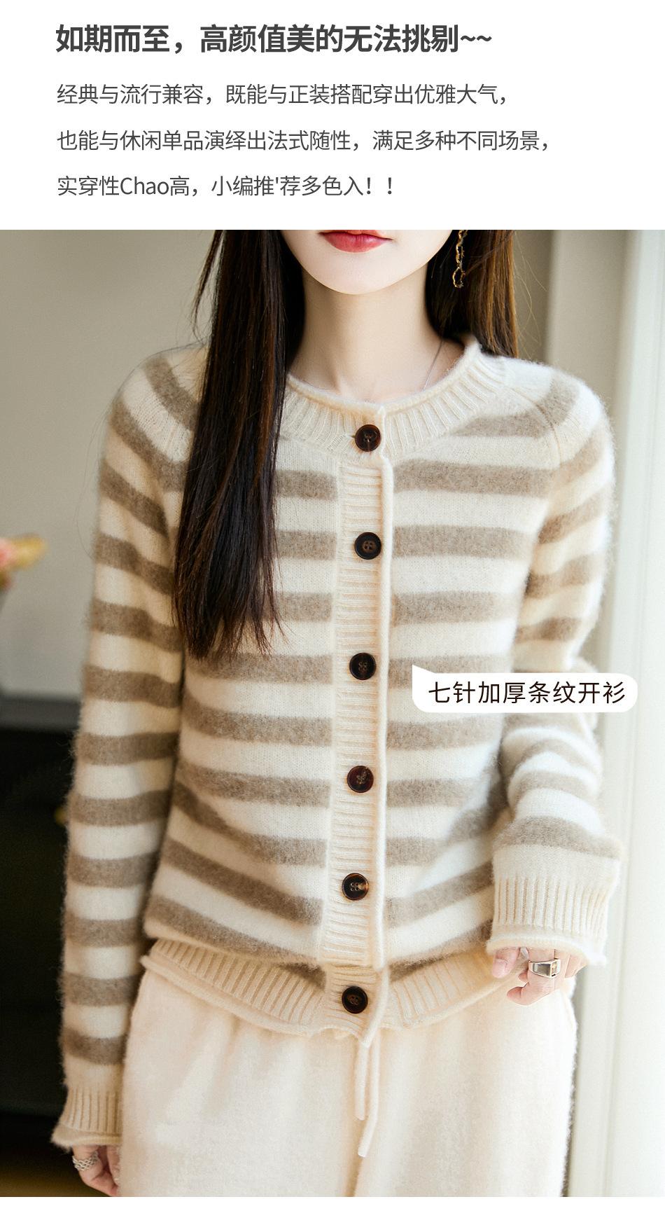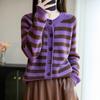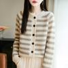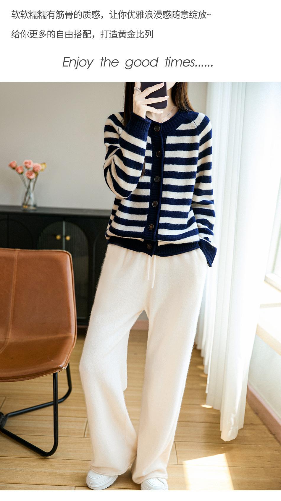 Suéter 100% Lana Pura Tejido Grueso de Siete Agujas Cuello Redondo Cárdigan de Punto Suéter de Bloques de Color a Rayas para Mujer Marea
