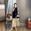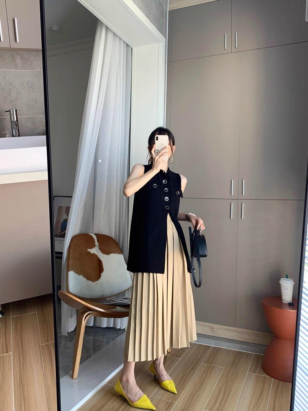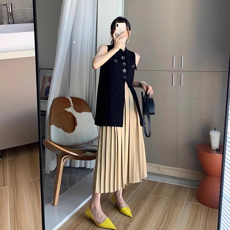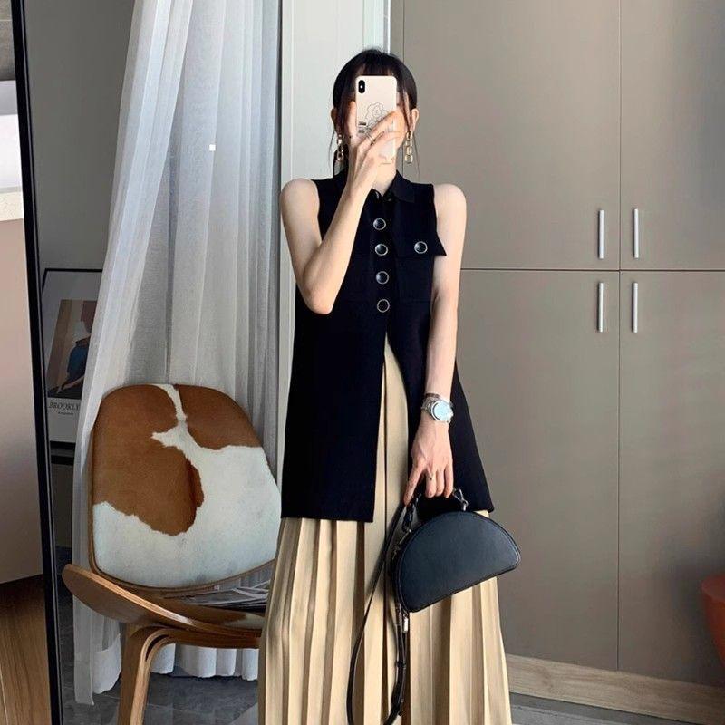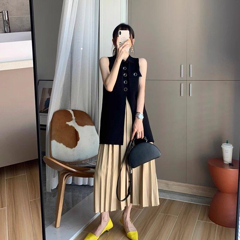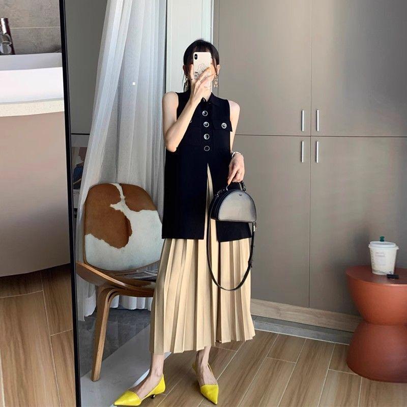 Conjunto de dos piezas sin mangas de alta gama para mujer, estilo Hepburn de verano 2025, top chaleco holgado y falda midi plisada.