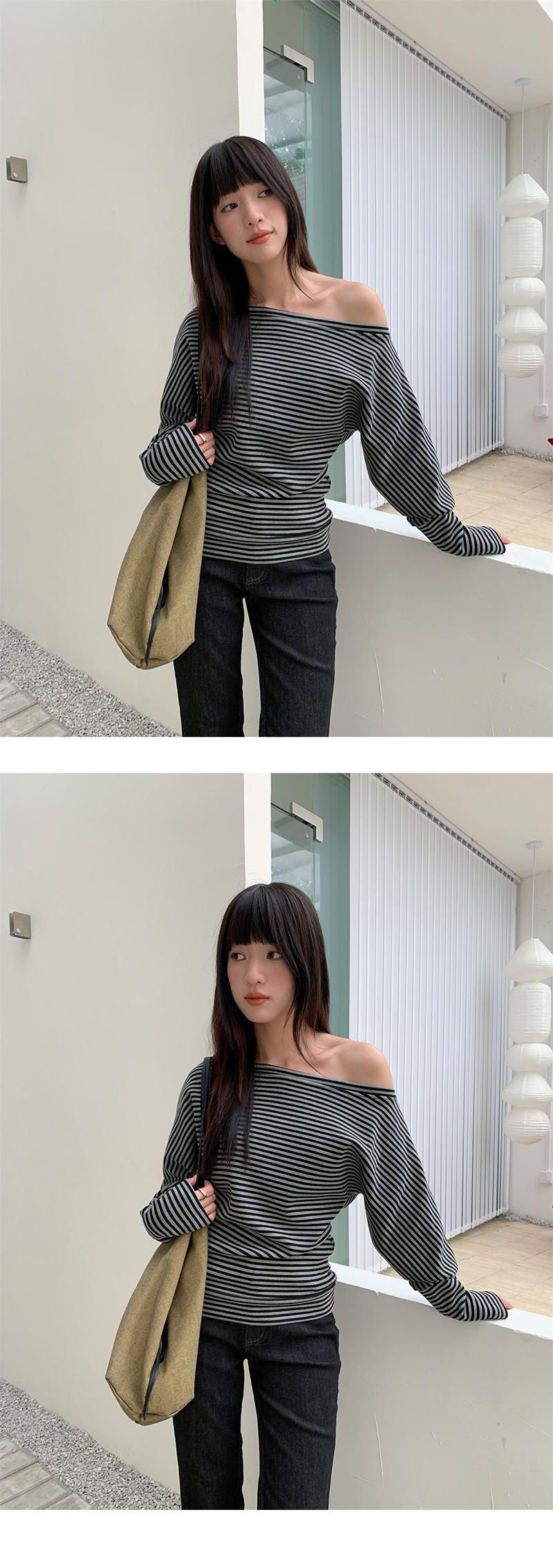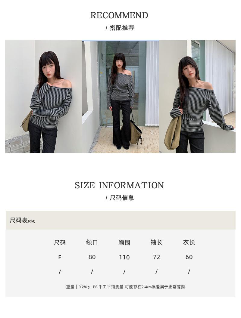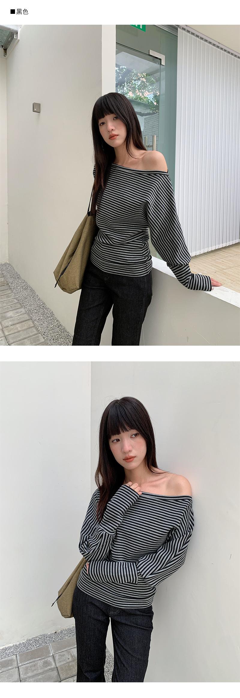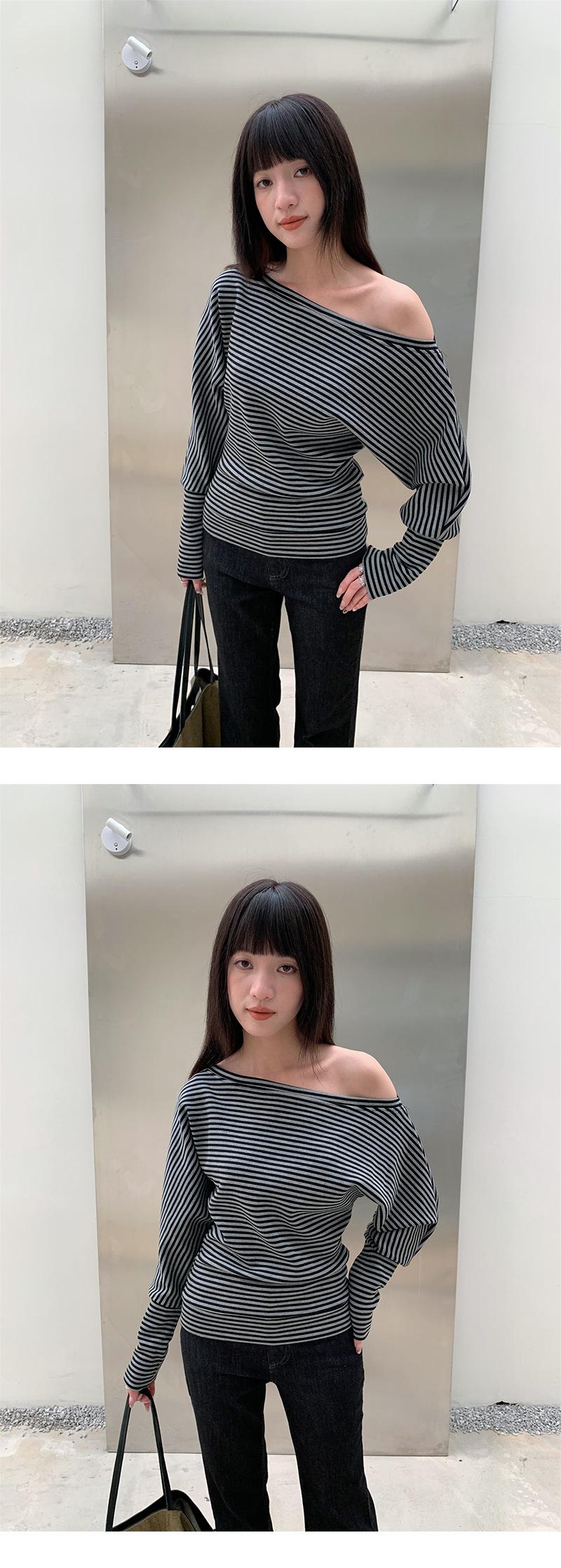 Yu Yi Nuevo Otoño 2025 Camiseta de Manga Larga a Rayas con un Hombro Descubierto para Mujer, Suelta, Versátil, Top Irregular para Mujer c250786