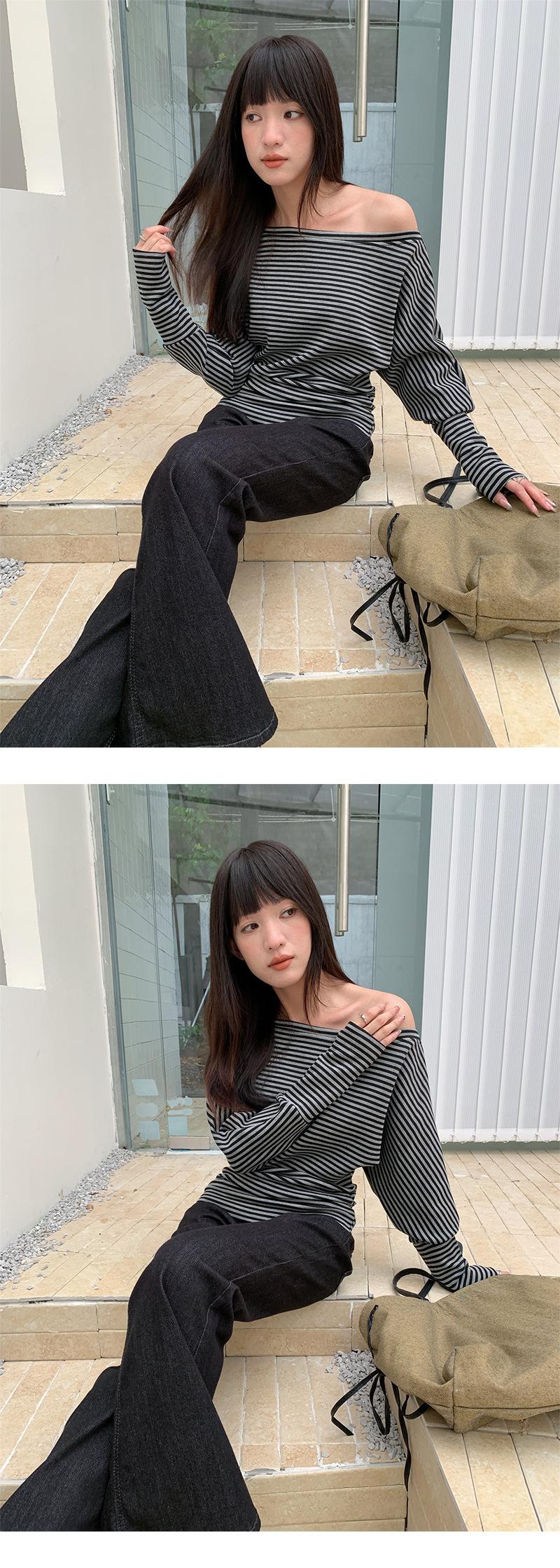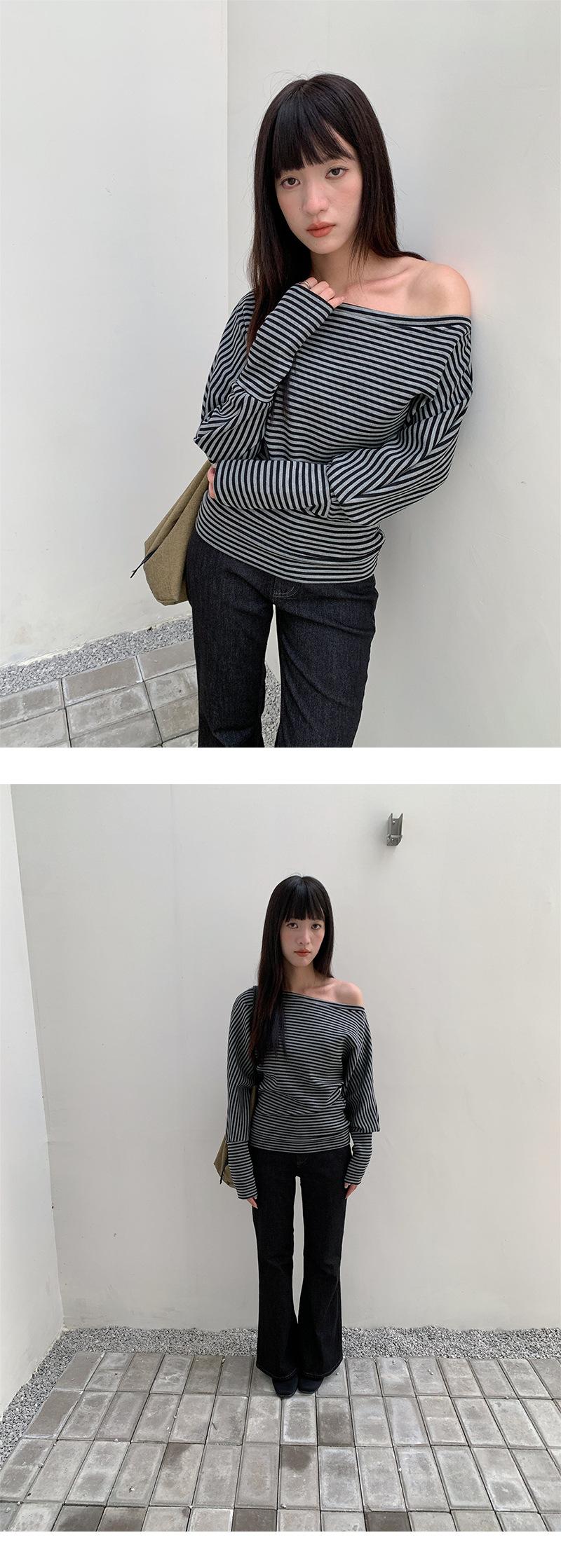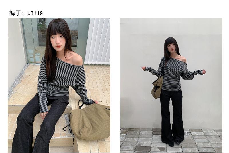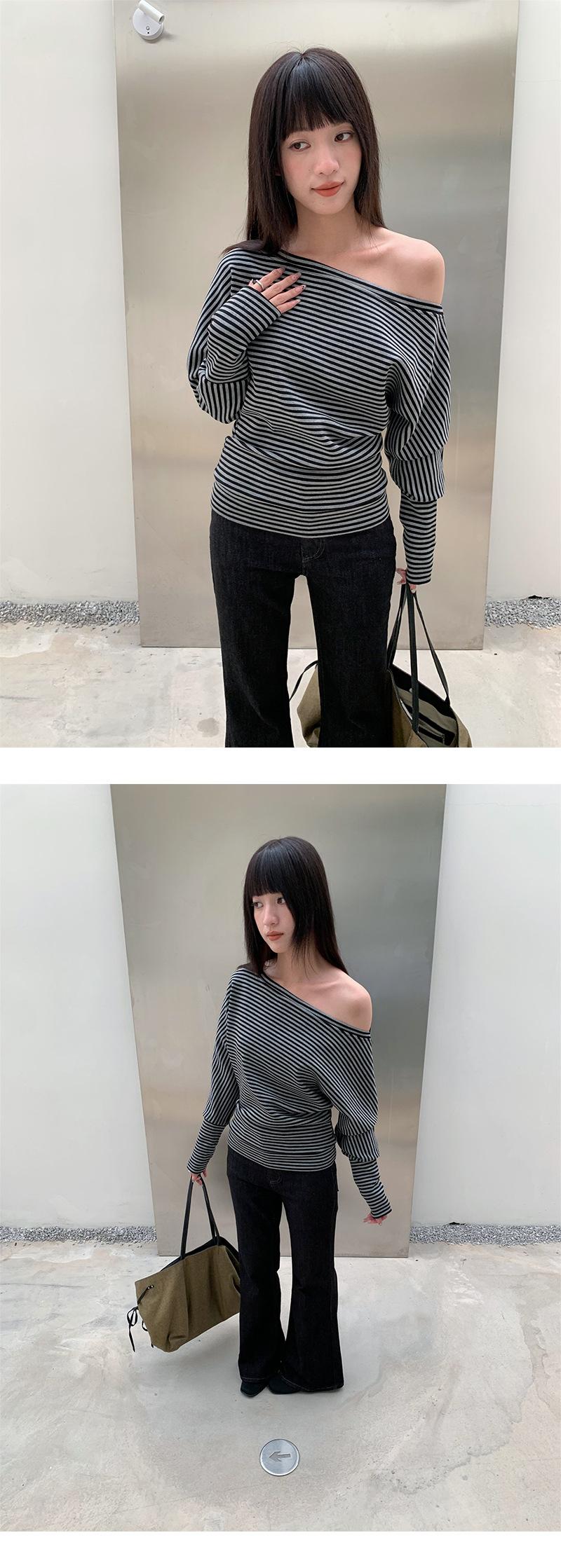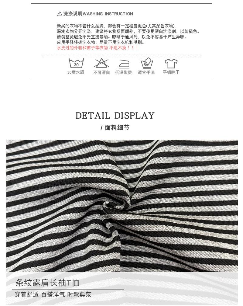 Yu Yi Nuevo Otoño 2025 Camiseta de Manga Larga a Rayas con un Hombro Descubierto para Mujer, Suelta, Versátil, Top Irregular para Mujer c250786