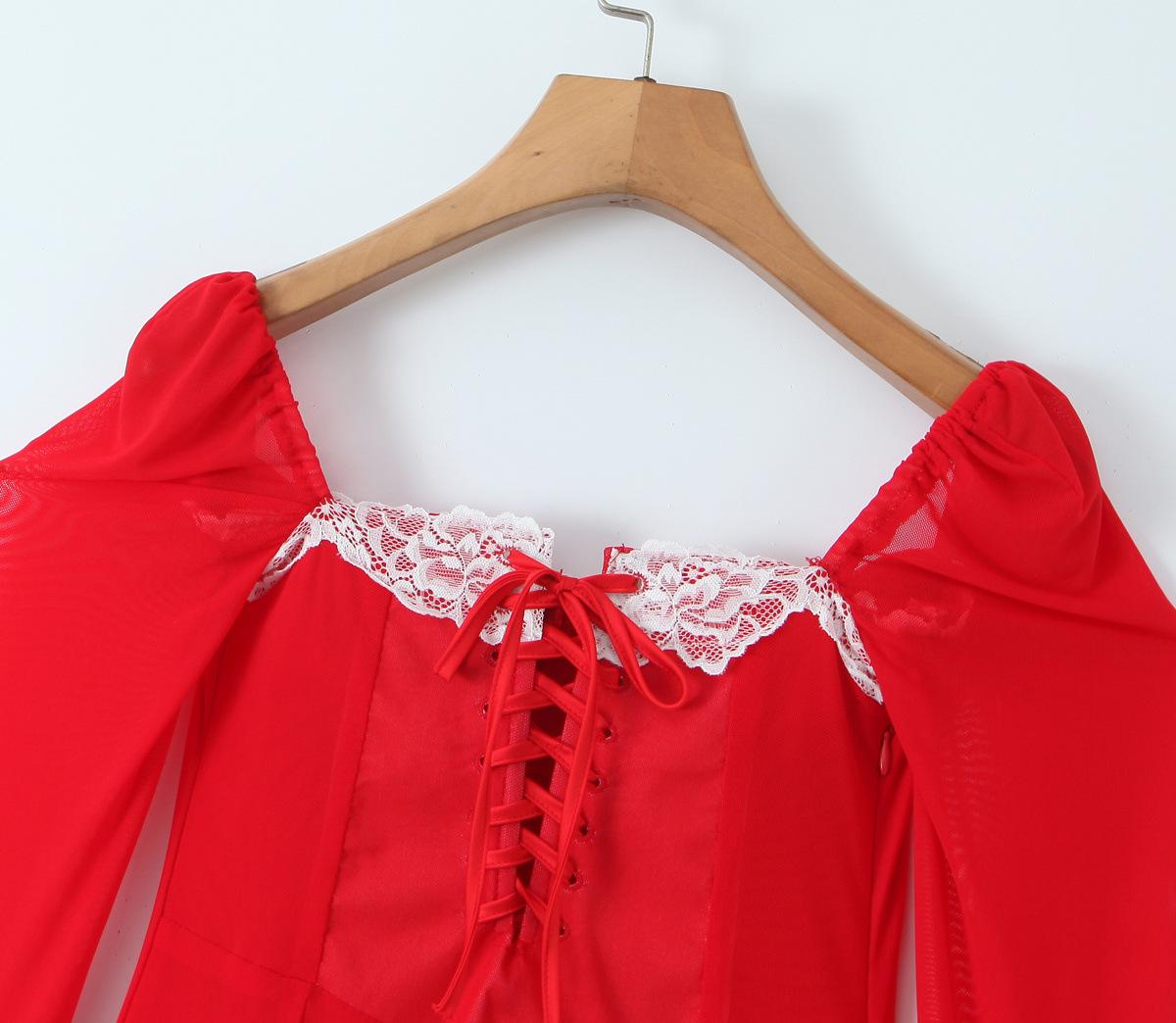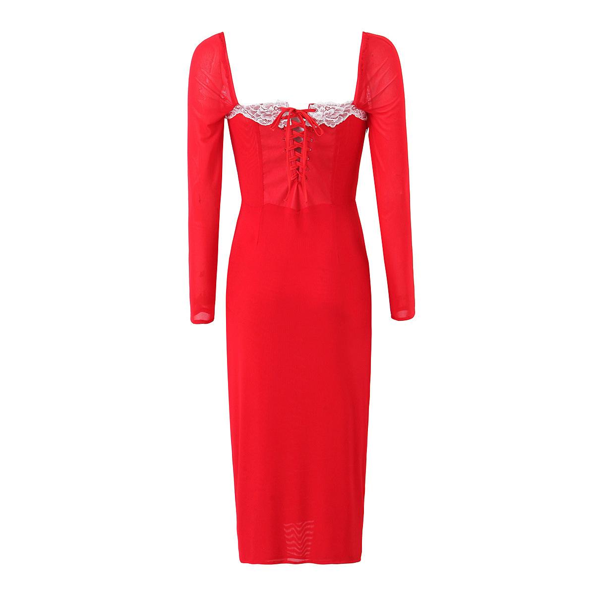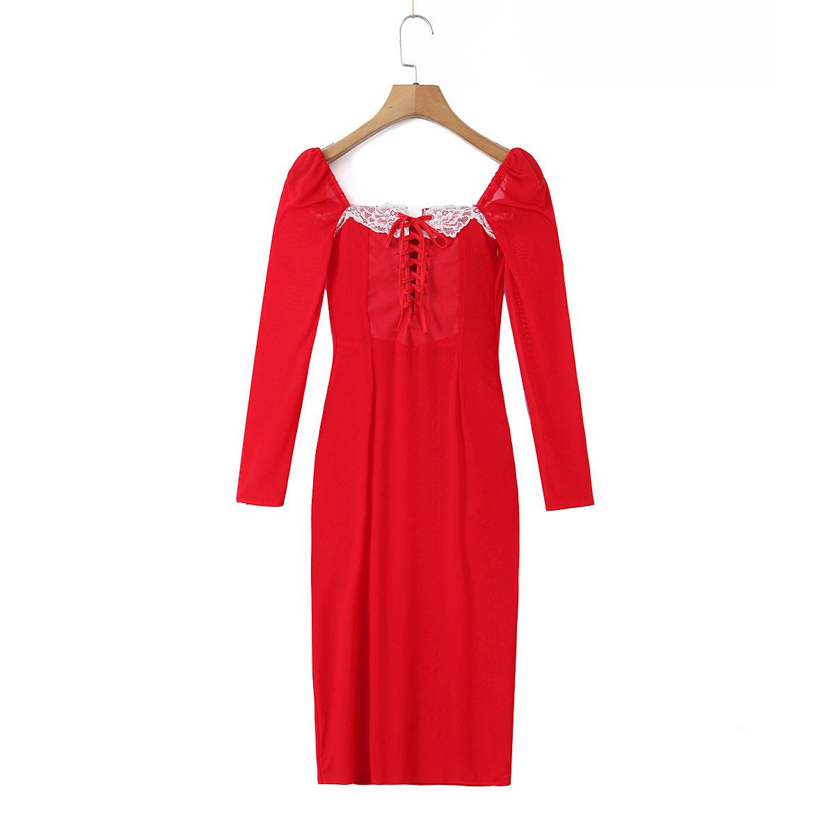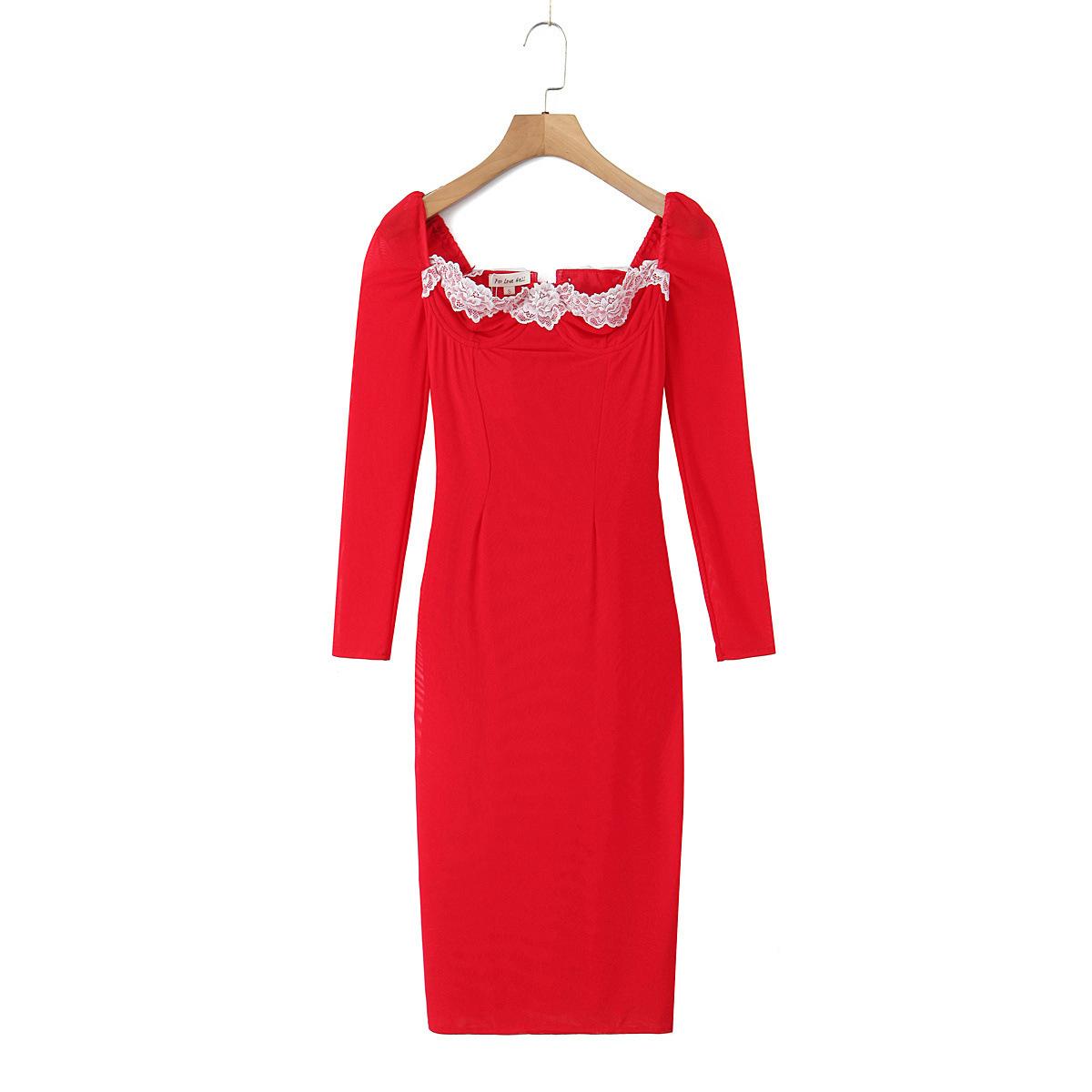 Estilo europeo y americano viento puro 2024 primavera y otoño nuevo alta elasticidad delgado encaje costuras encaje cadera vestido sexy mujer
