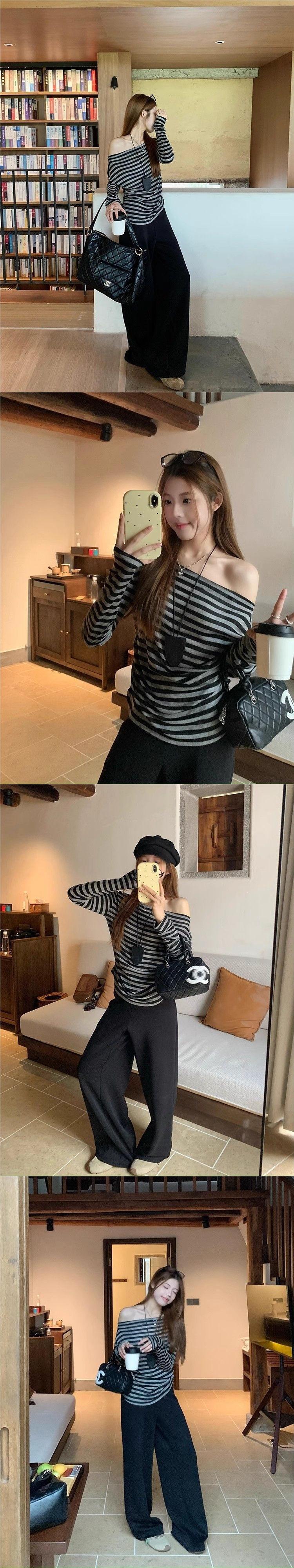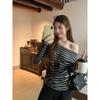 Camiseta de Manga Larga a Rayas de Moda para Chica Hot con un Hombro Descubierto para Mujer Otoño 2025 Nuevo Top Chic Ajustado con Hombro Descubierto Inclinado