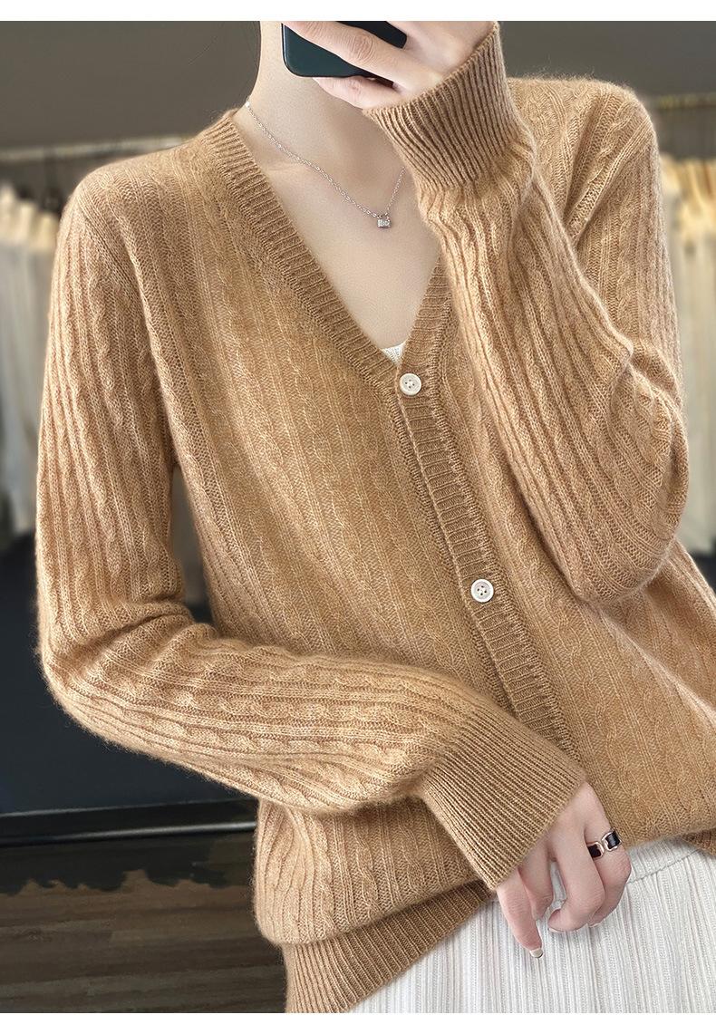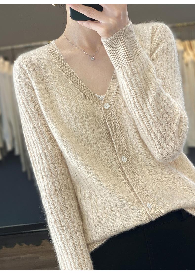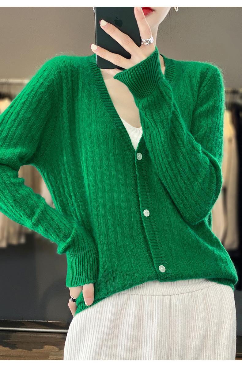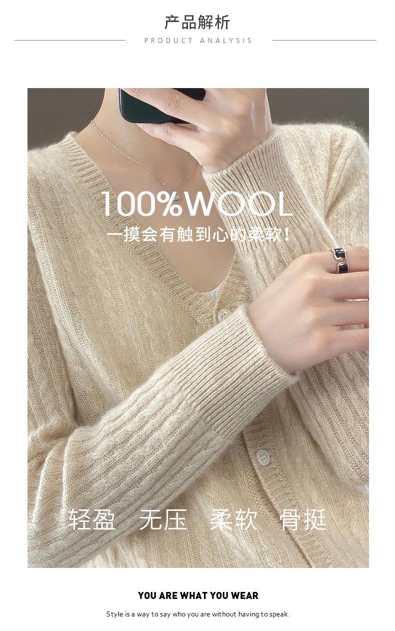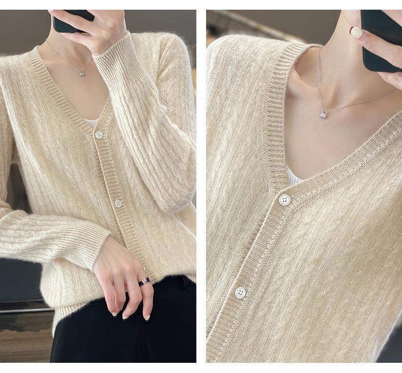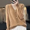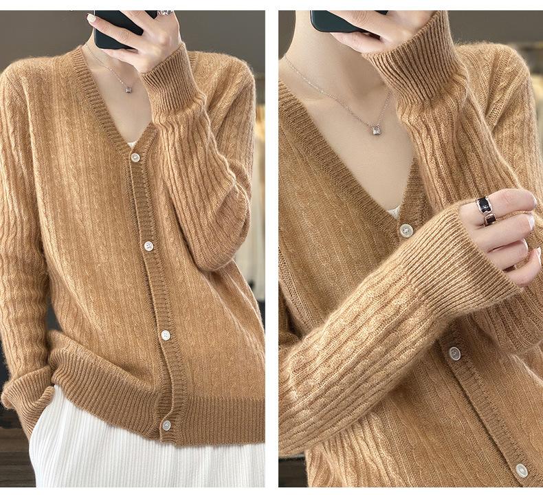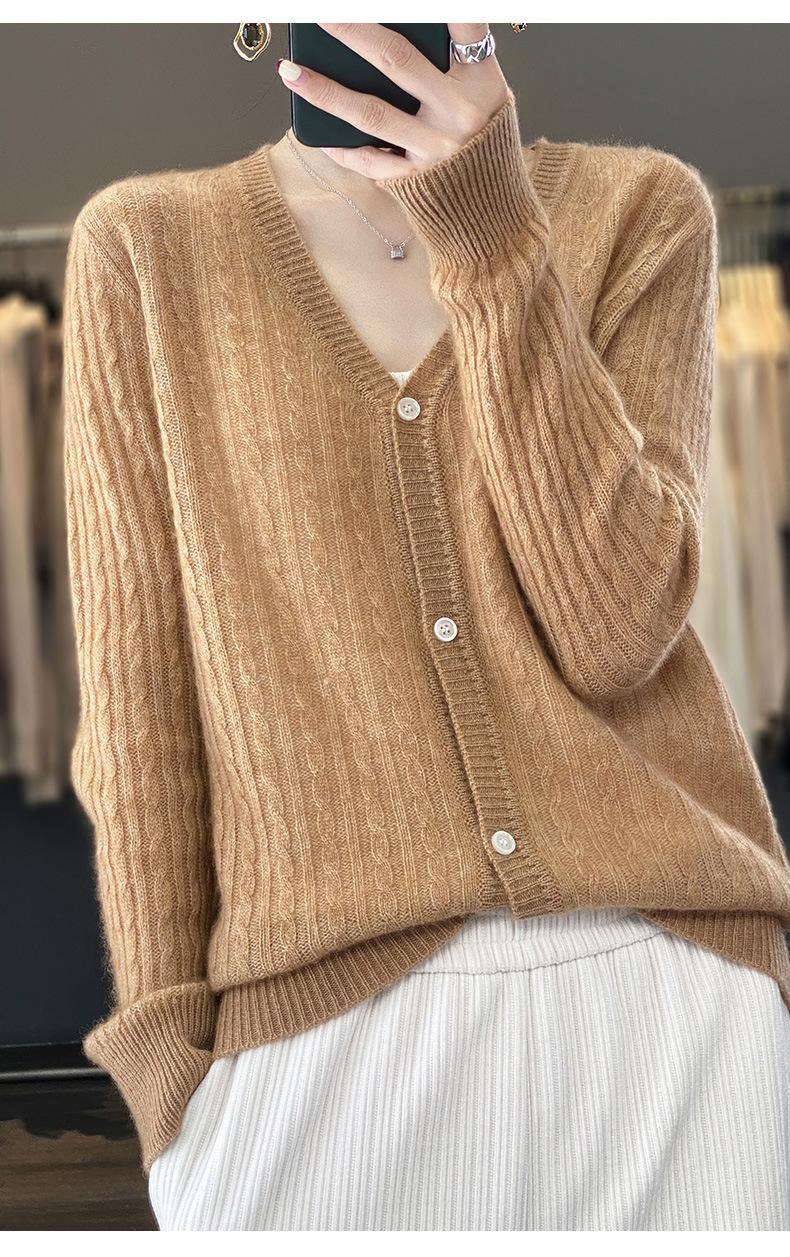 Cárdigan de Punto Trenzado de Lana Pura con Cuello en V para Mujer, Color Sólido, Manga Larga Suelta Versátil con Botones, Ropa Exterior Nueva Otoño/Invierno 2025