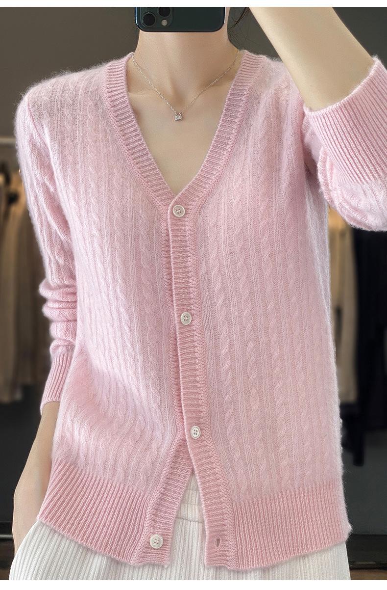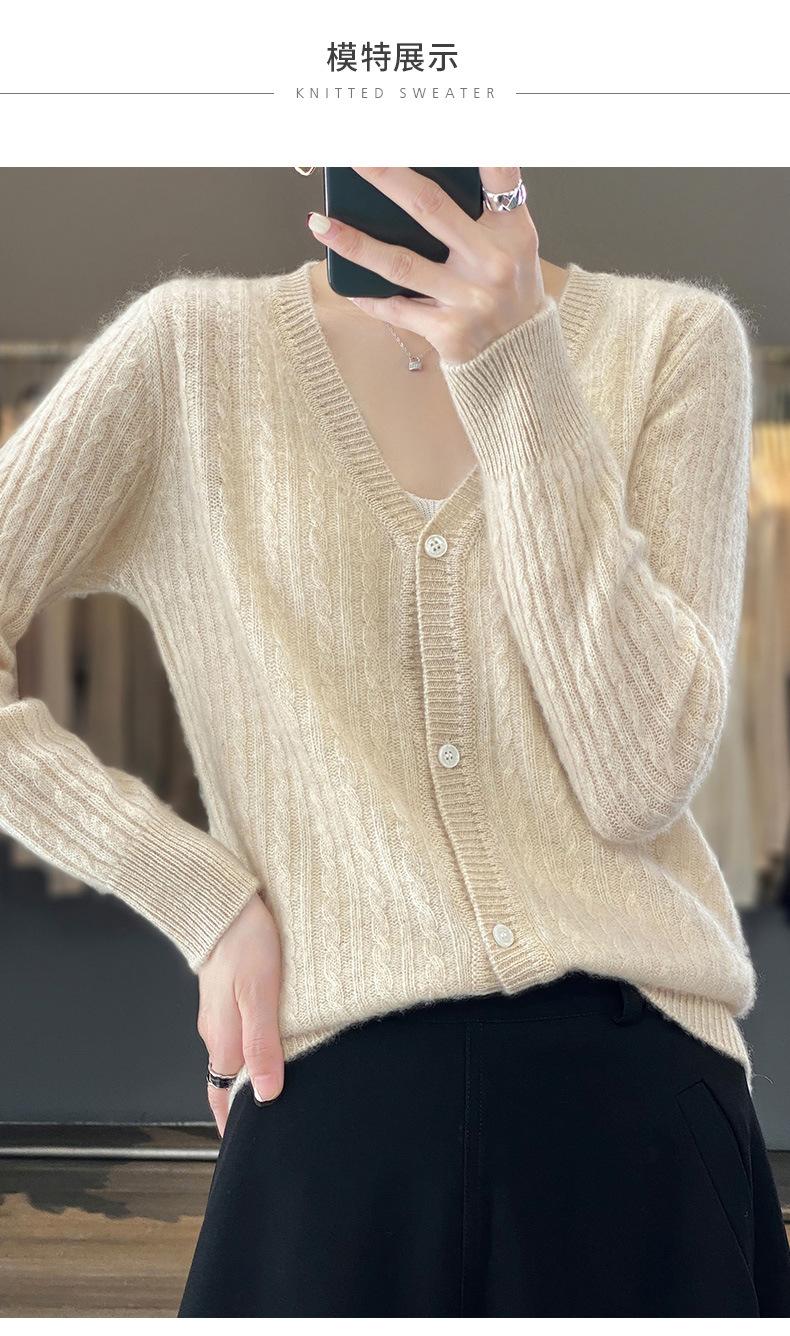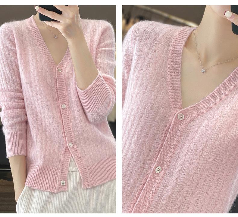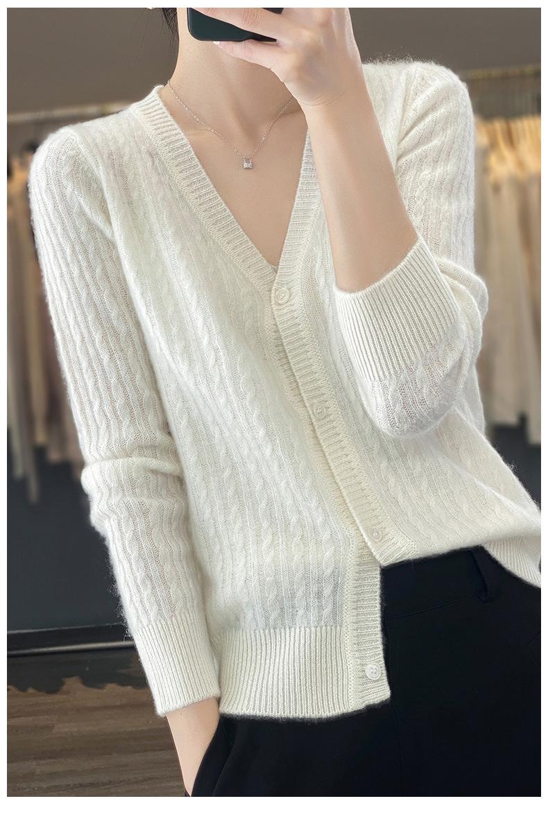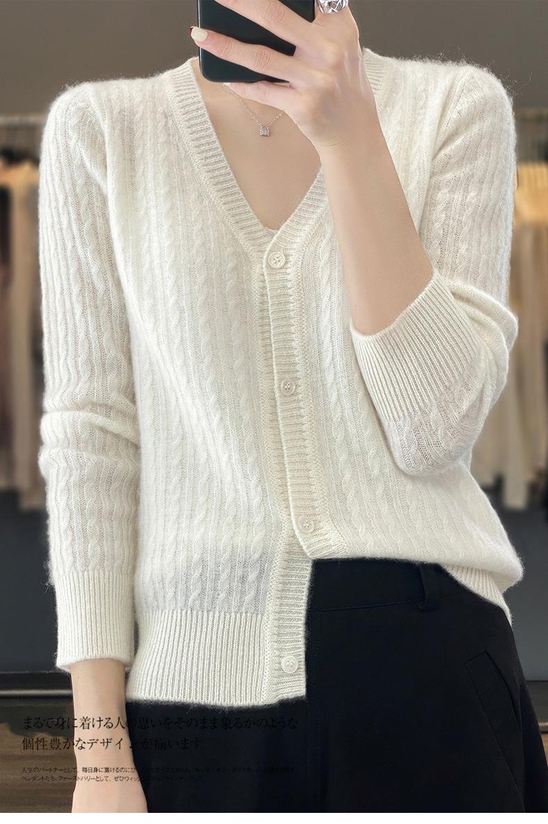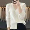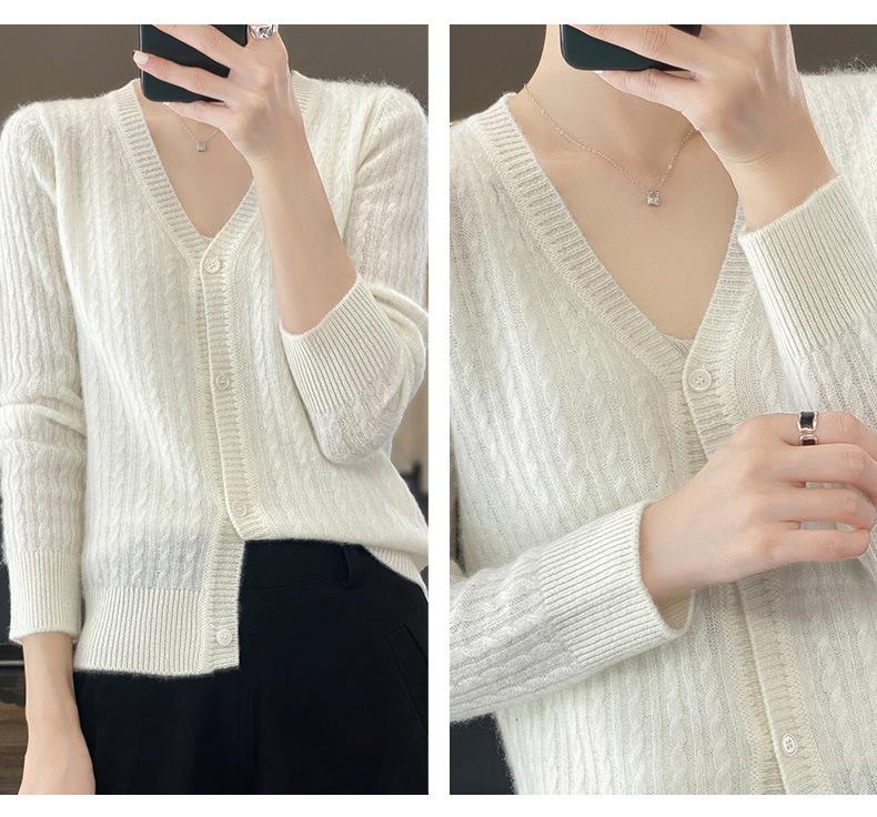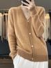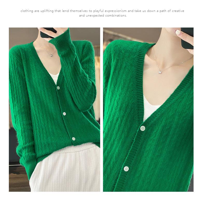 Cárdigan de Punto Trenzado de Lana Pura con Cuello en V para Mujer, Color Sólido, Manga Larga Suelta Versátil con Botones, Ropa Exterior Nueva Otoño/Invierno 2025