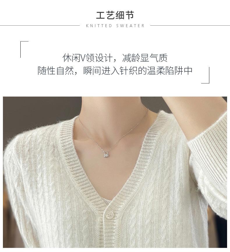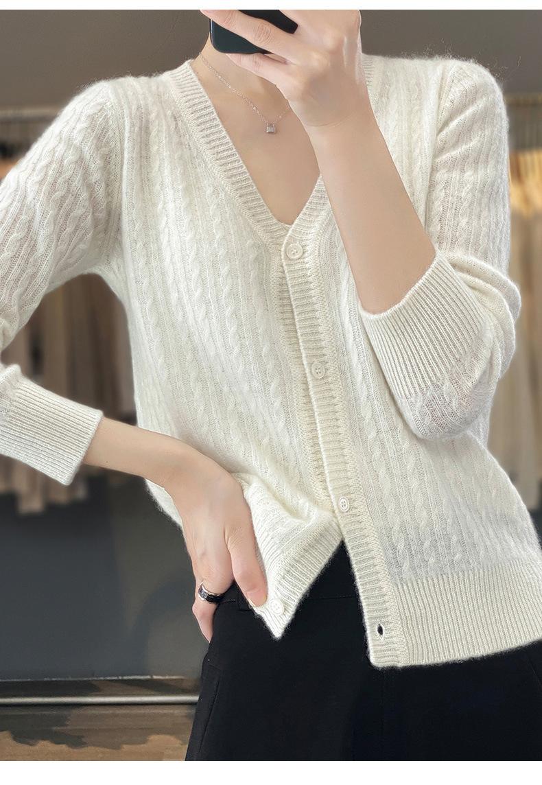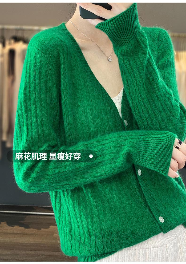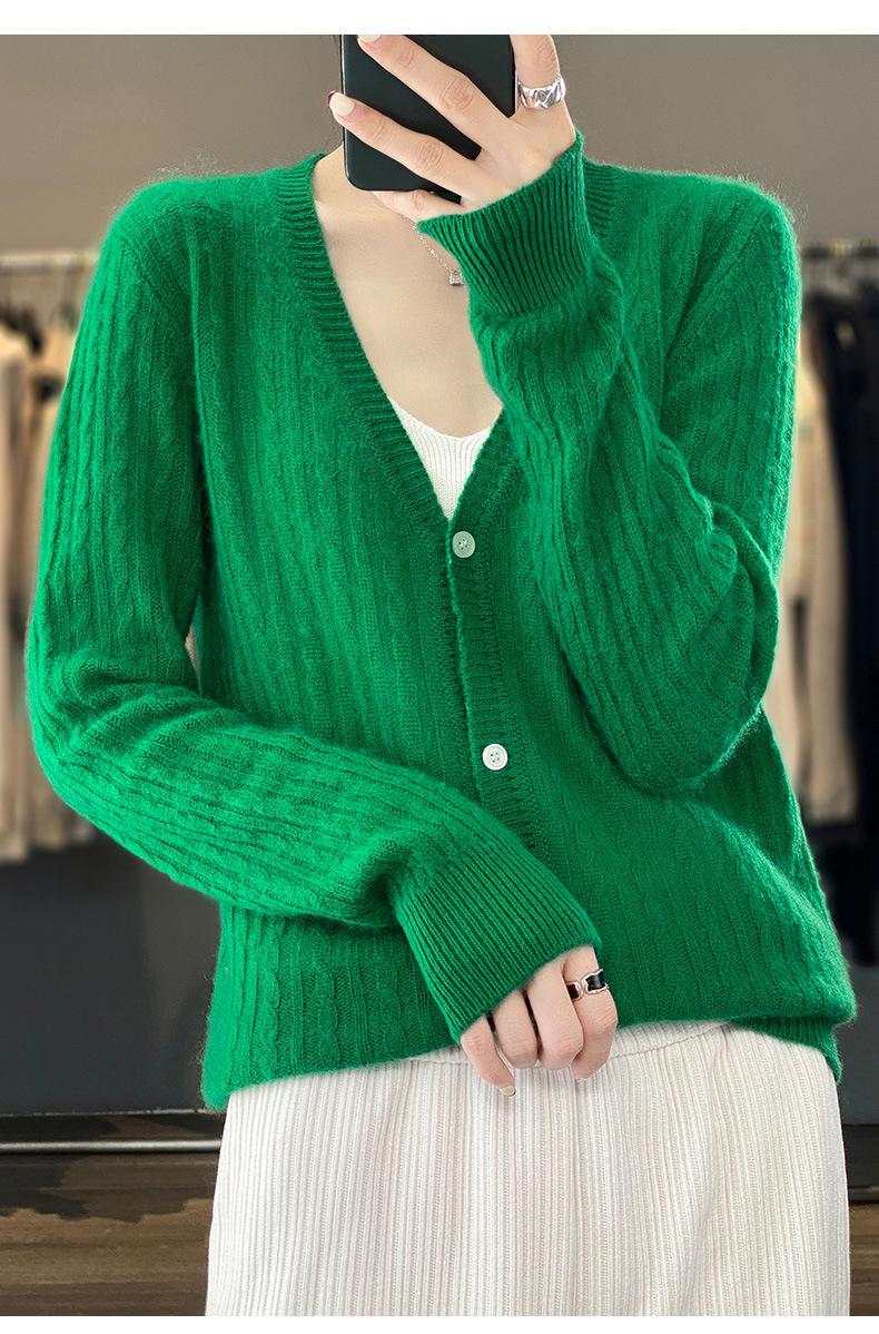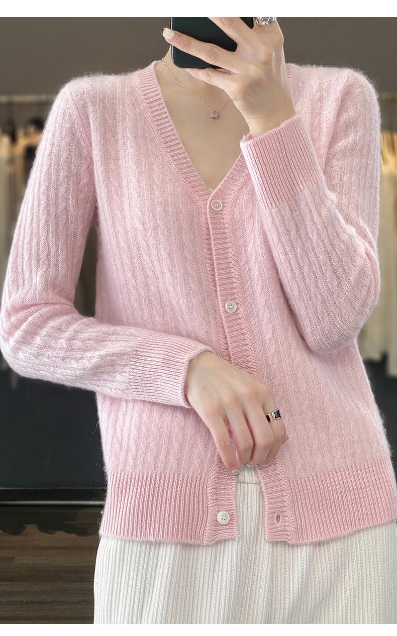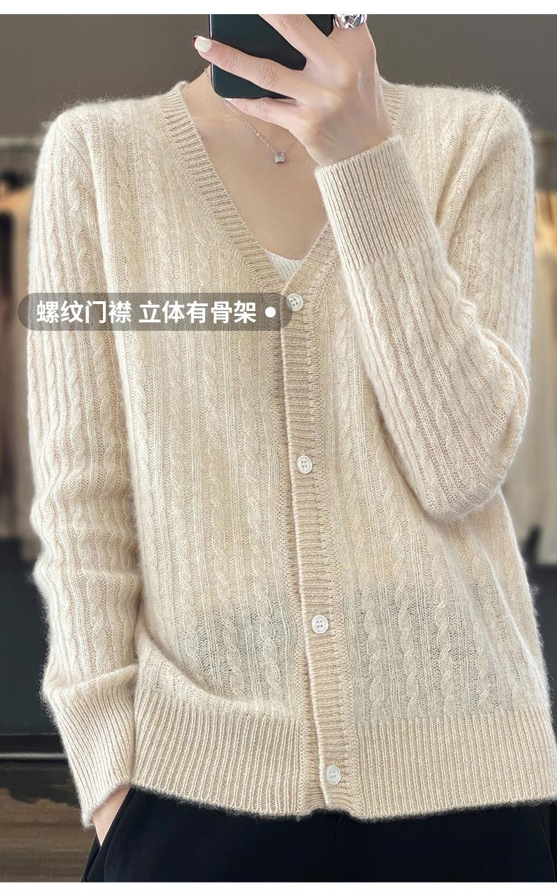 Cárdigan de Punto Trenzado de Lana Pura con Cuello en V para Mujer, Color Sólido, Manga Larga Suelta Versátil con Botones, Ropa Exterior Nueva Otoño/Invierno 2025