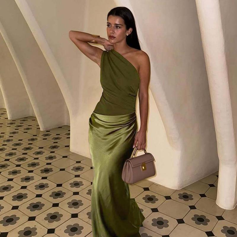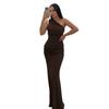 2025 Moda nueva transfronteriza europea y americana para mujer, vestido largo sexy de un hombro con parches, corte ajustado que realza la figura, al por mayor
