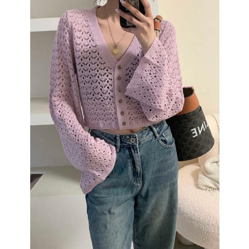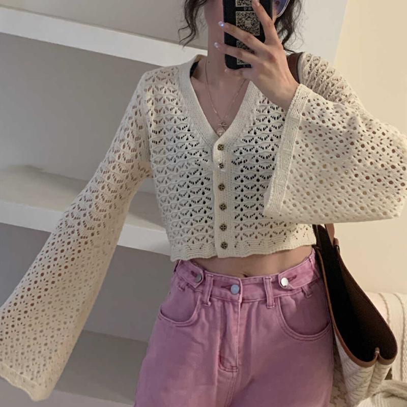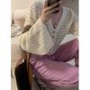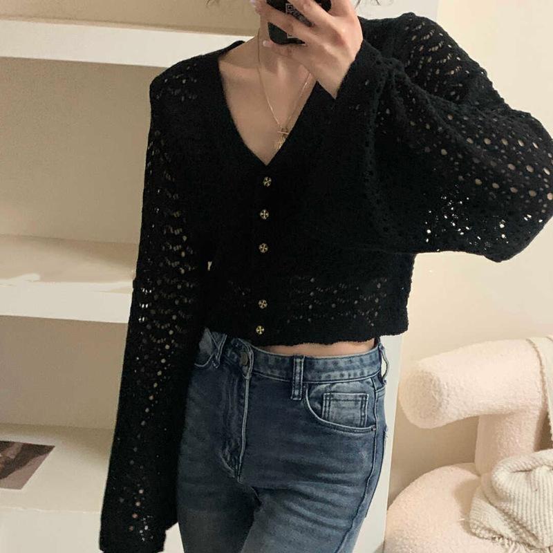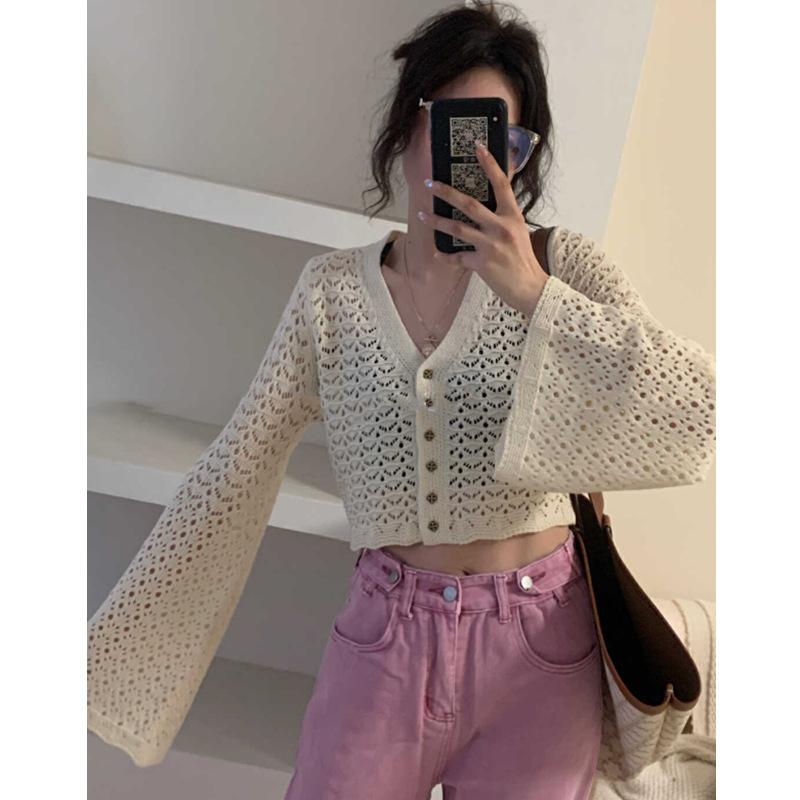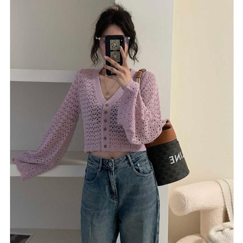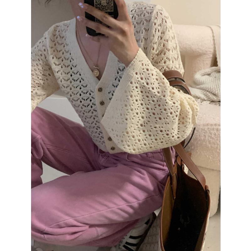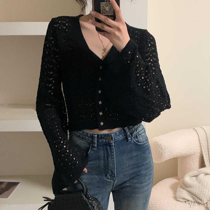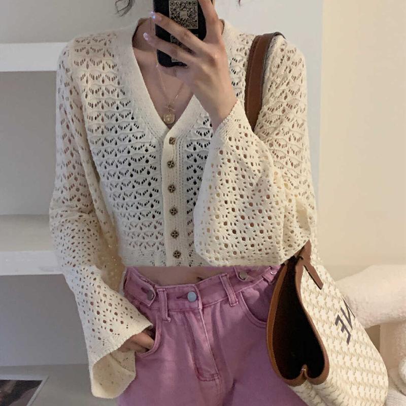 Cárdigan de punto calado de estilo francés de manga larga con protección solar para mujer, verano, suelto, para exterior, blusa top para aire acondicionado