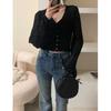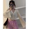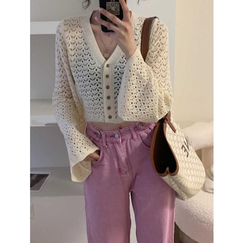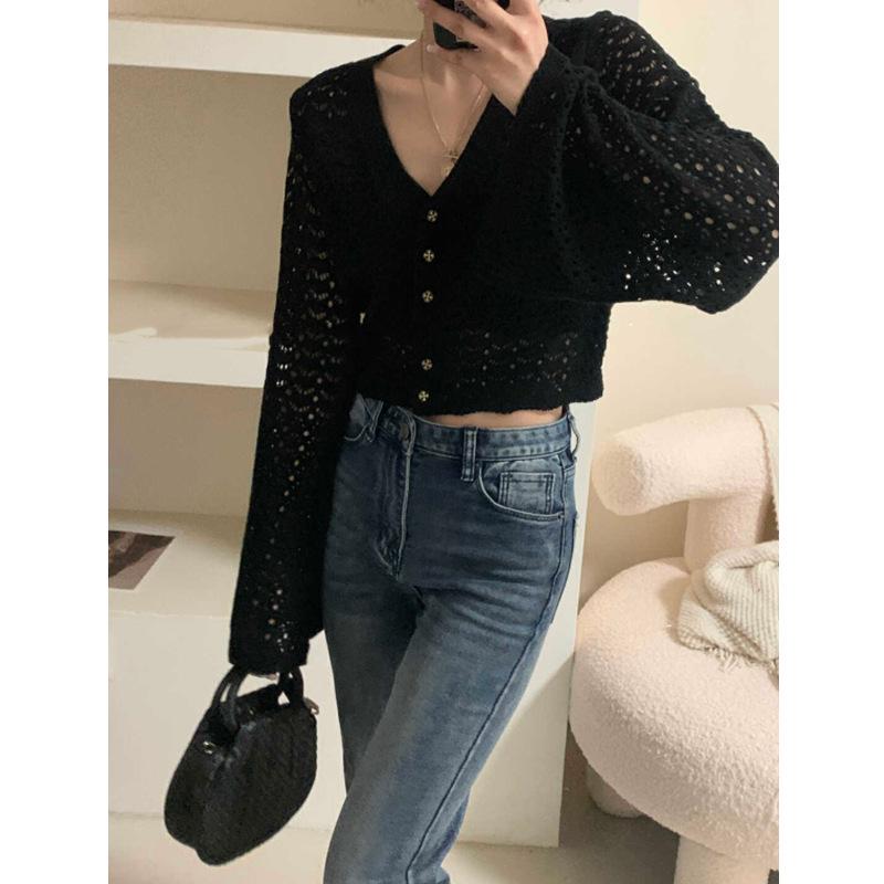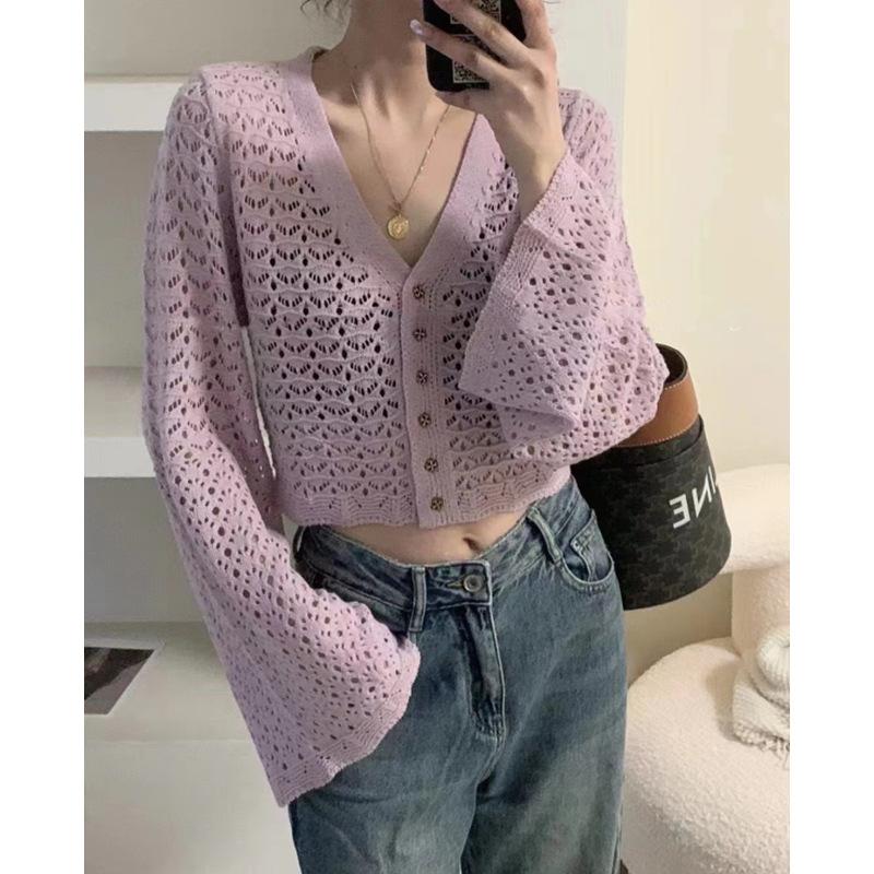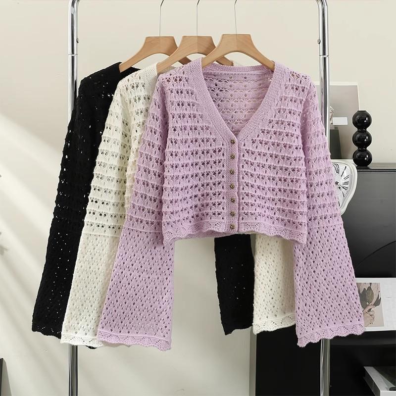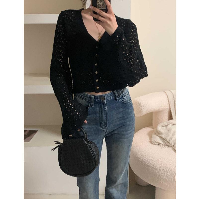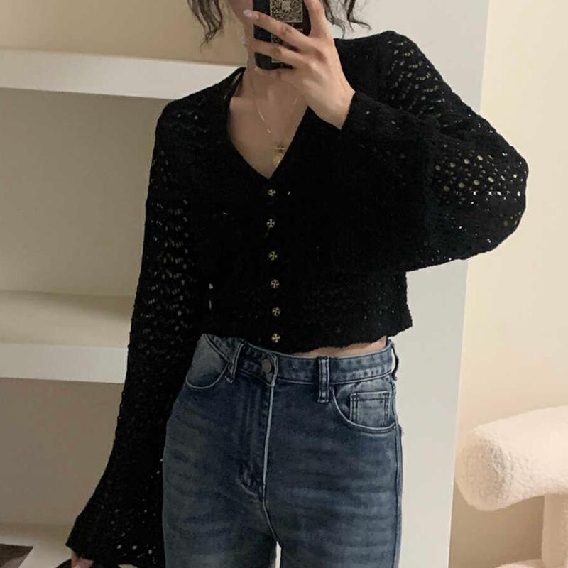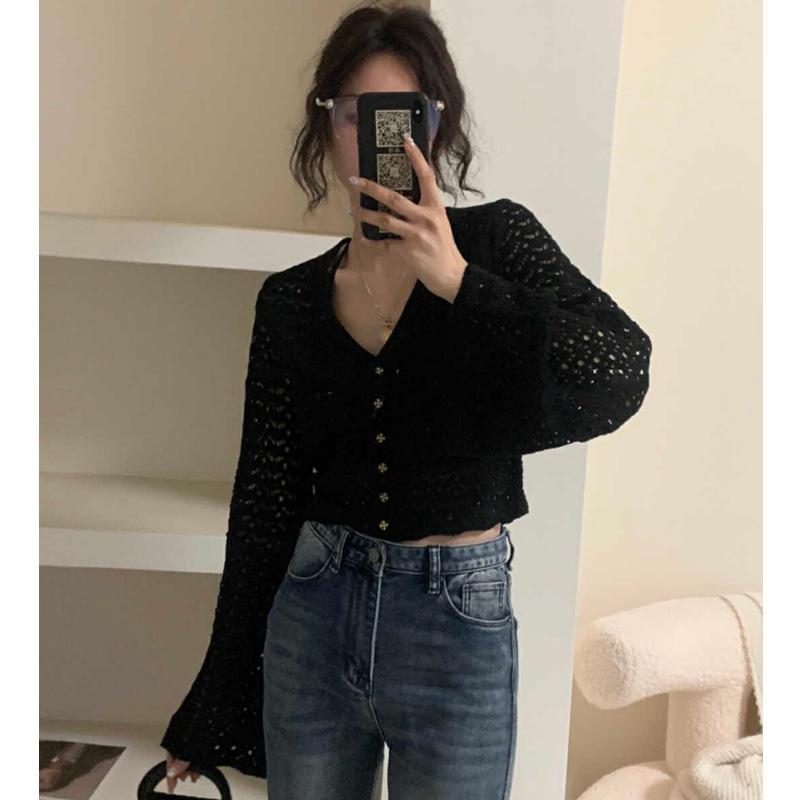 Cárdigan de punto calado de estilo francés de manga larga con protección solar para mujer, verano, suelto, para exterior, blusa top para aire acondicionado
