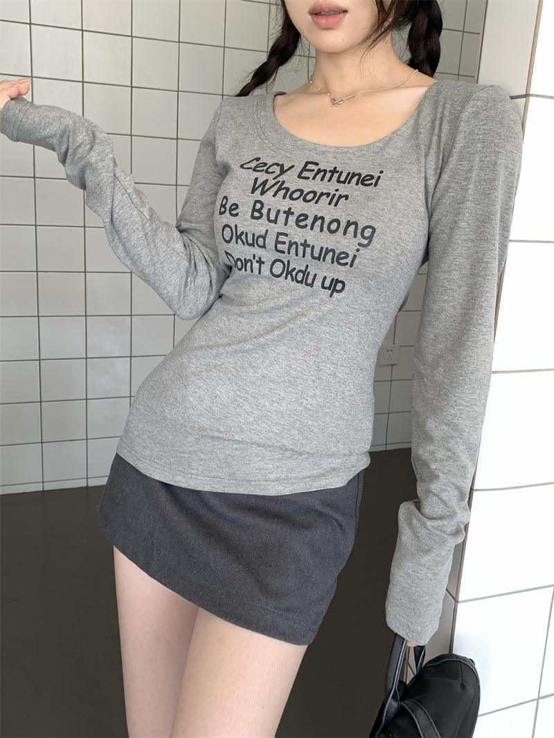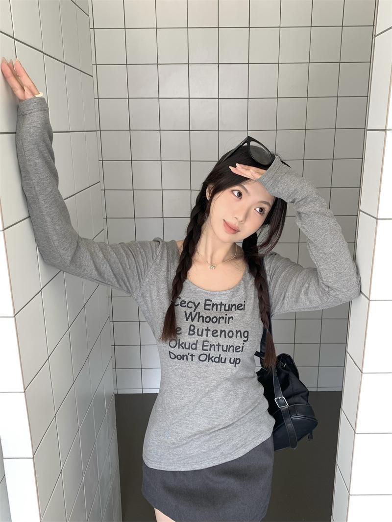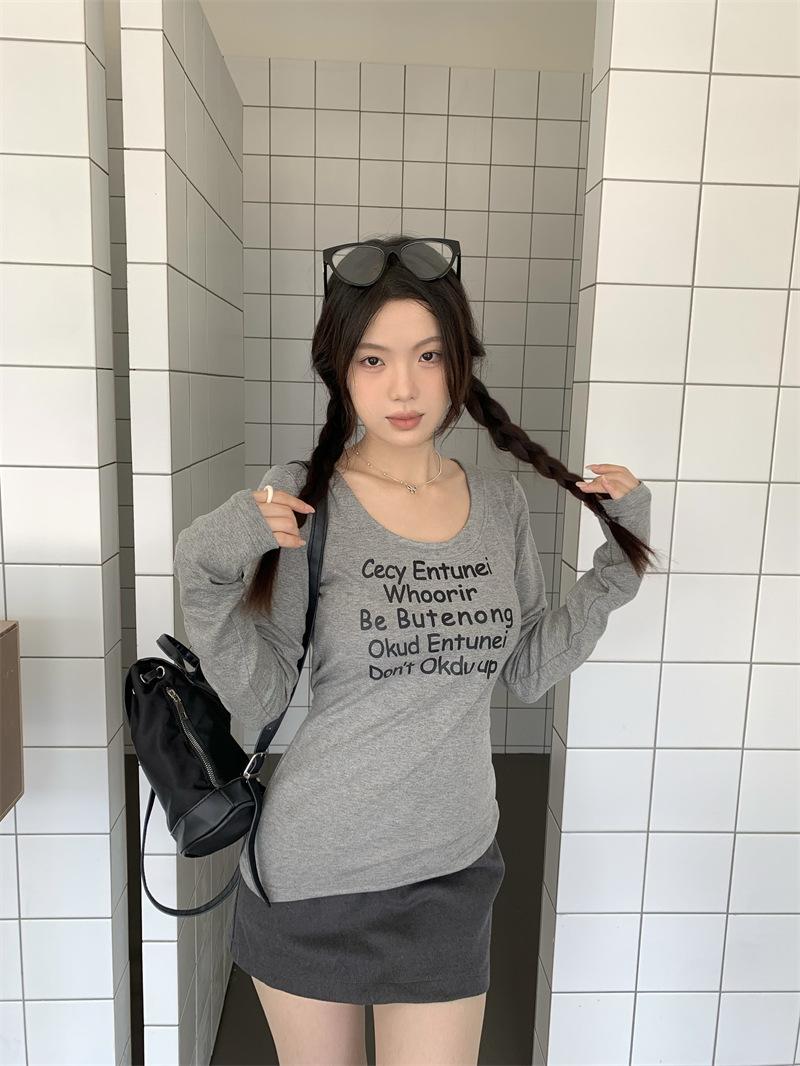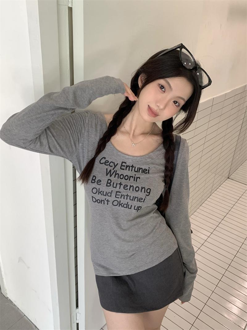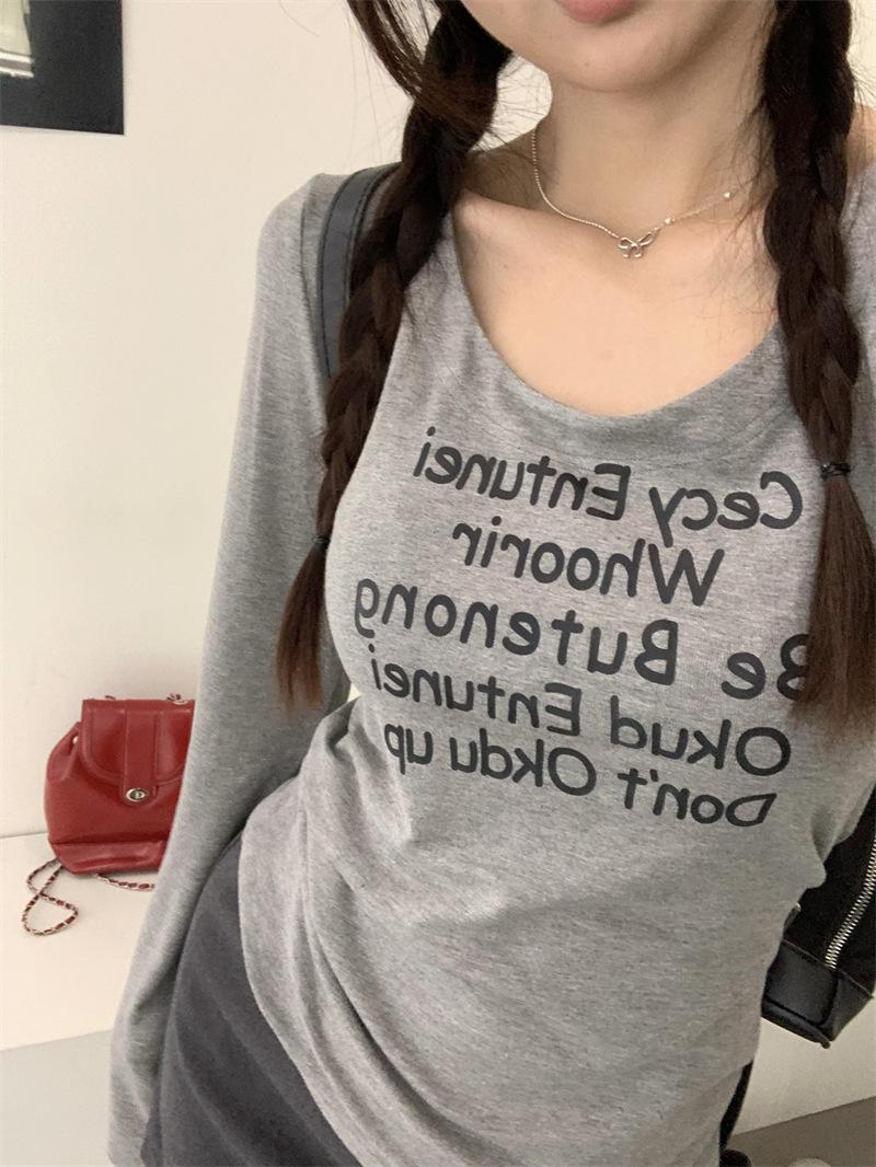 Foto en vivo~ Camiseta de manga larga con estampado de hombro recto de chica picante retro americana para mujer, top base ajustado y adelgazante, otoño 89369