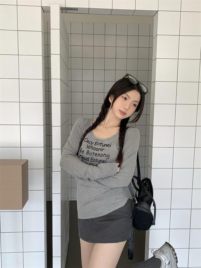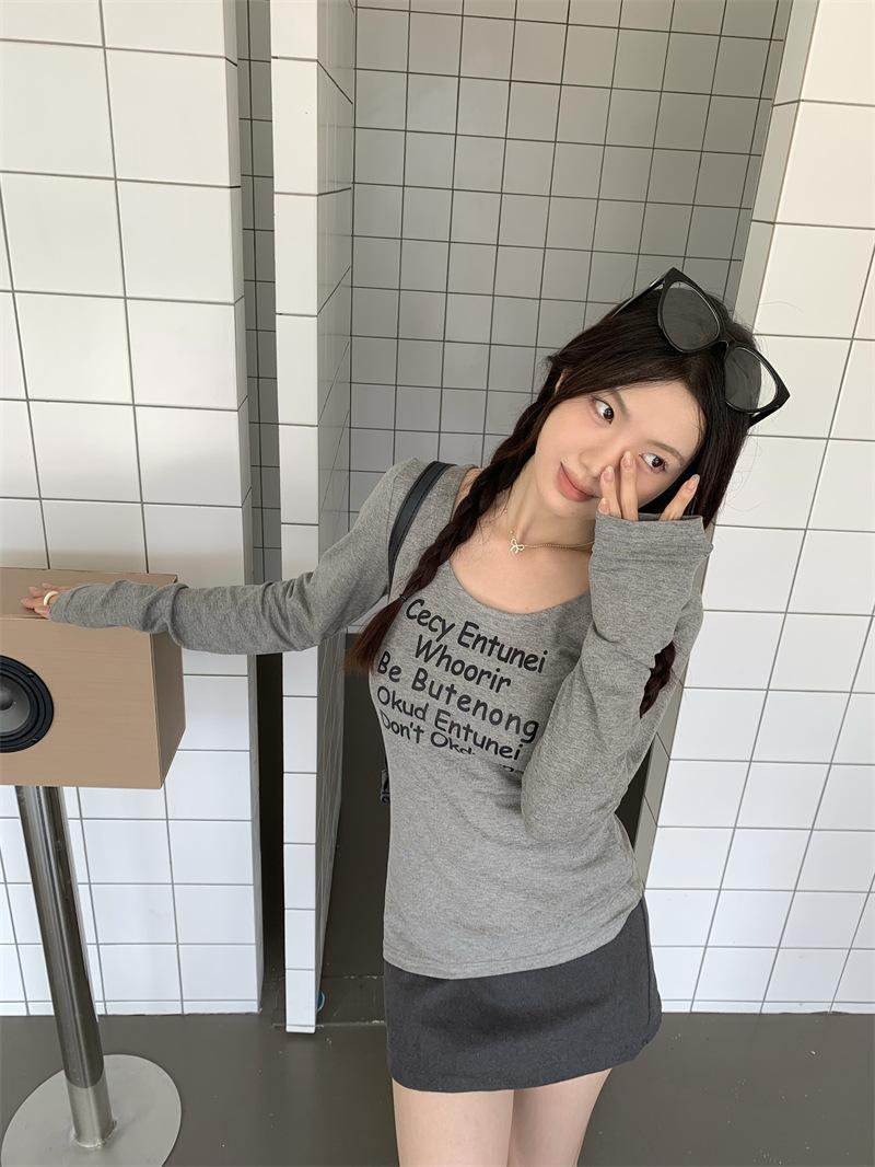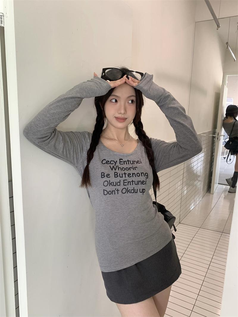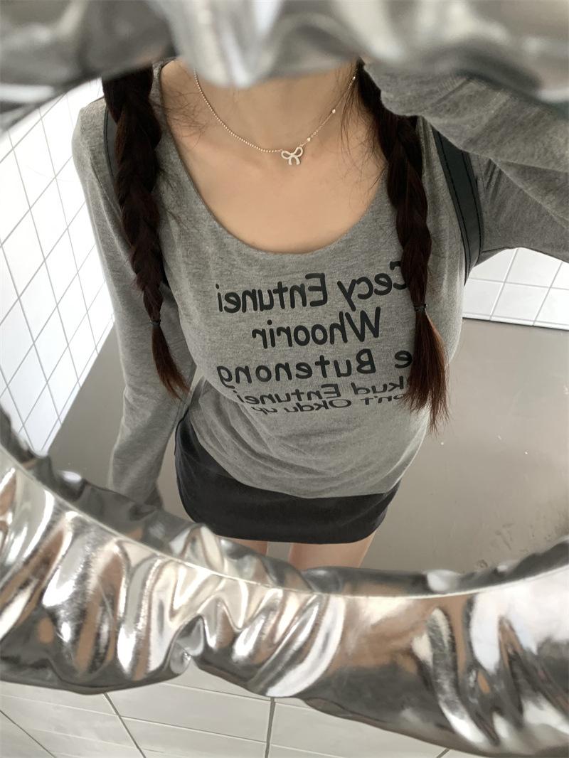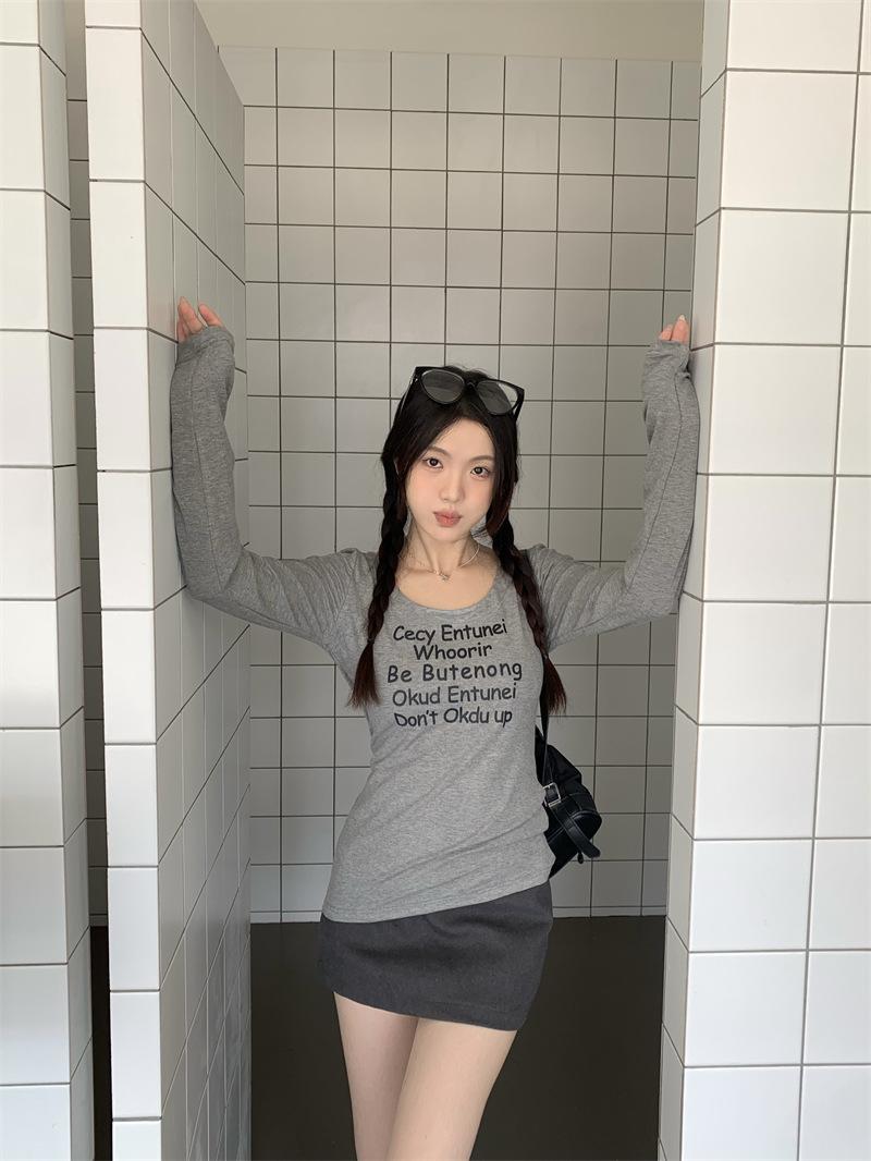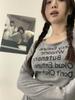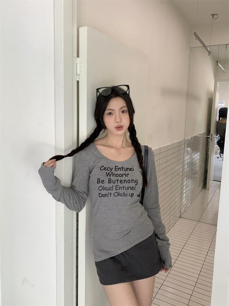 Foto en vivo~ Camiseta de manga larga con estampado de hombro recto de chica picante retro americana para mujer, top base ajustado y adelgazante, otoño 89369