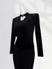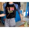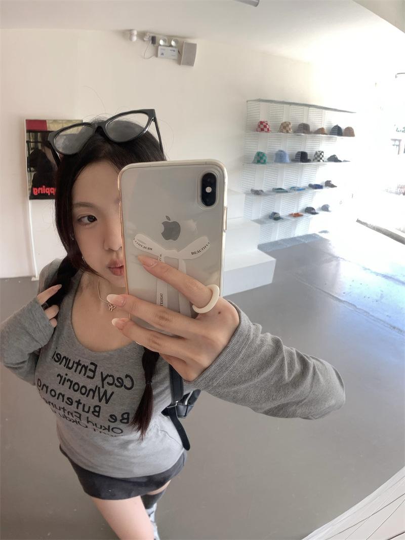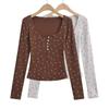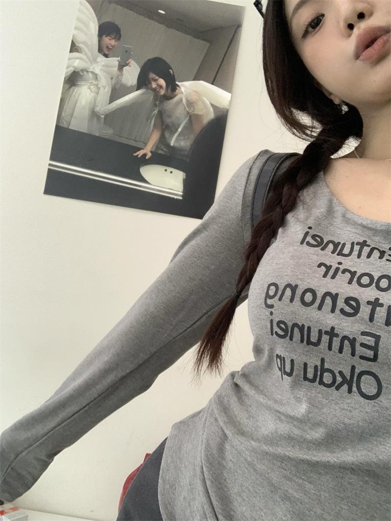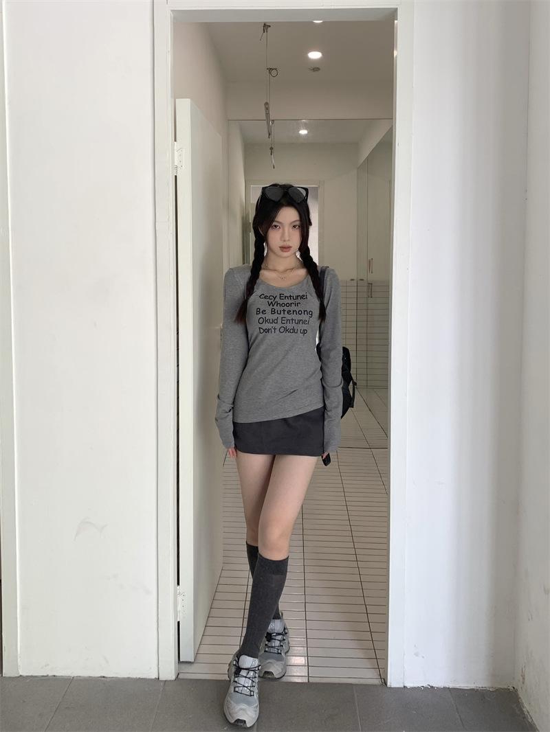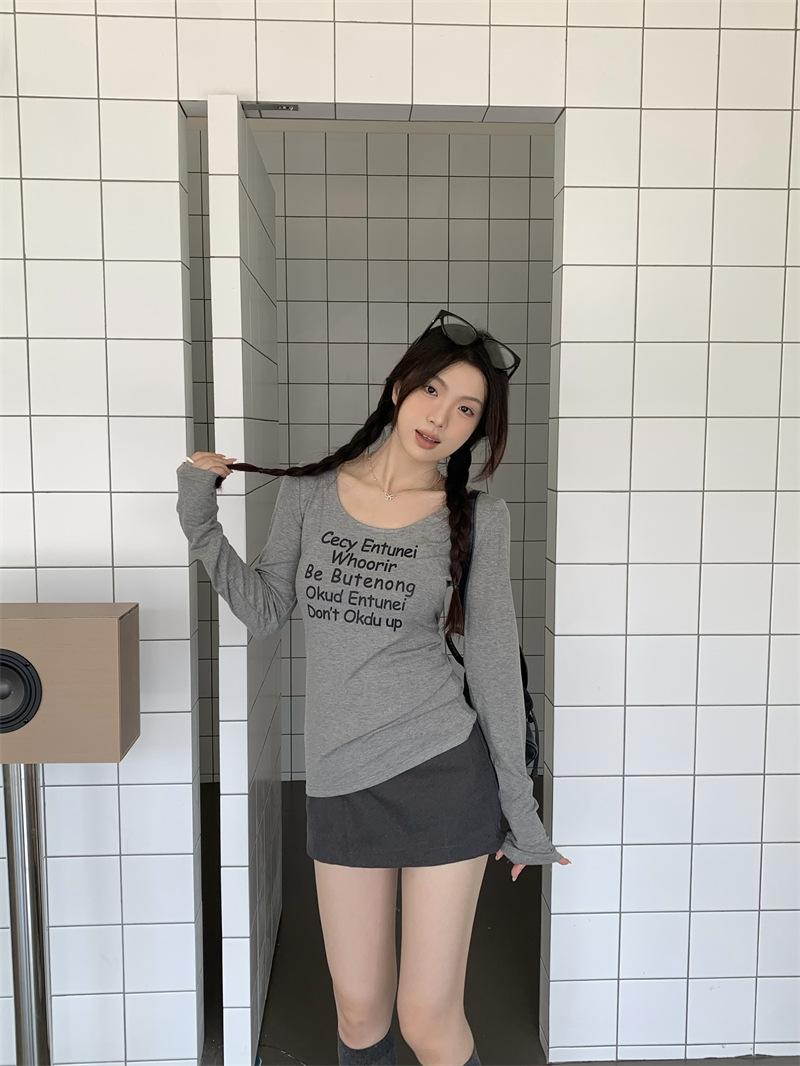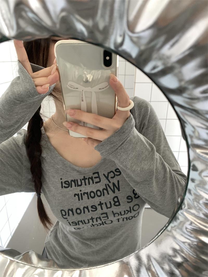 Foto en vivo~ Camiseta de manga larga con estampado de hombro recto de chica picante retro americana para mujer, top base ajustado y adelgazante, otoño 89369