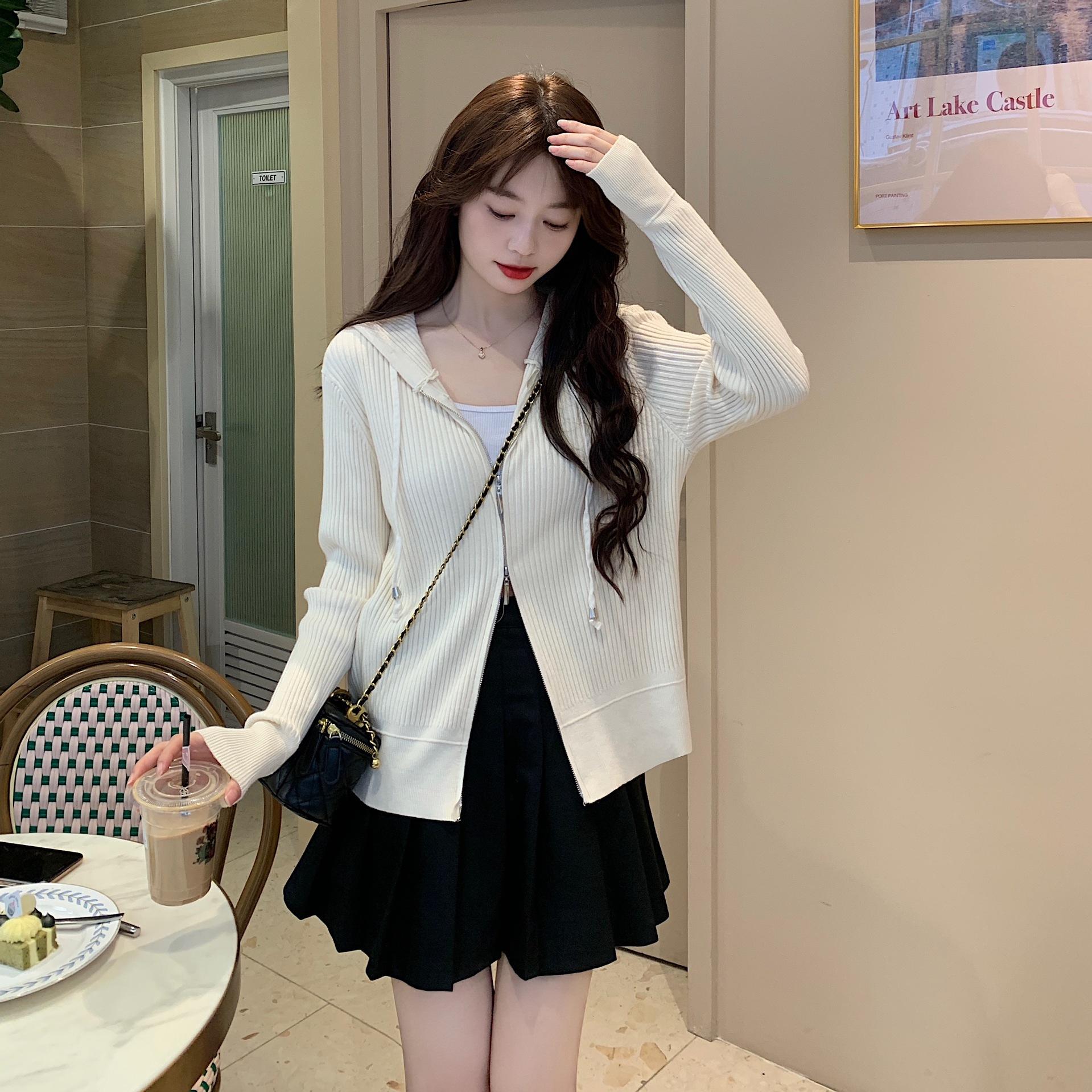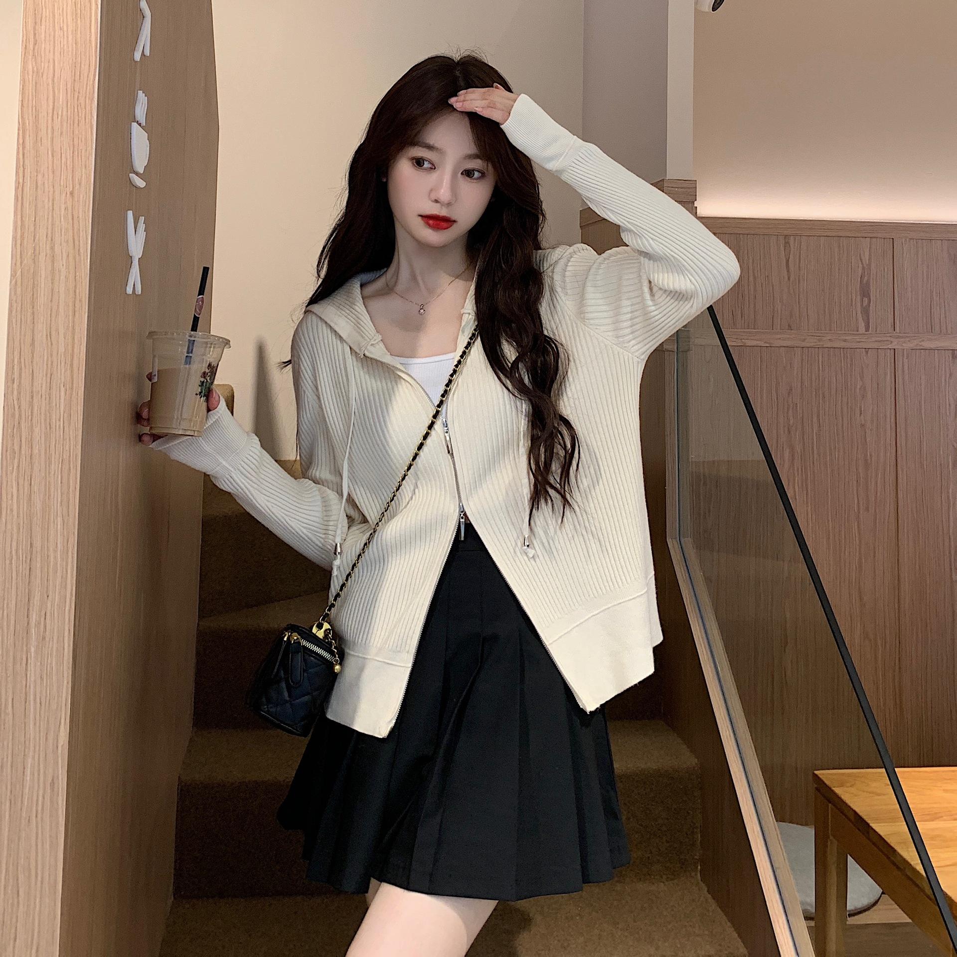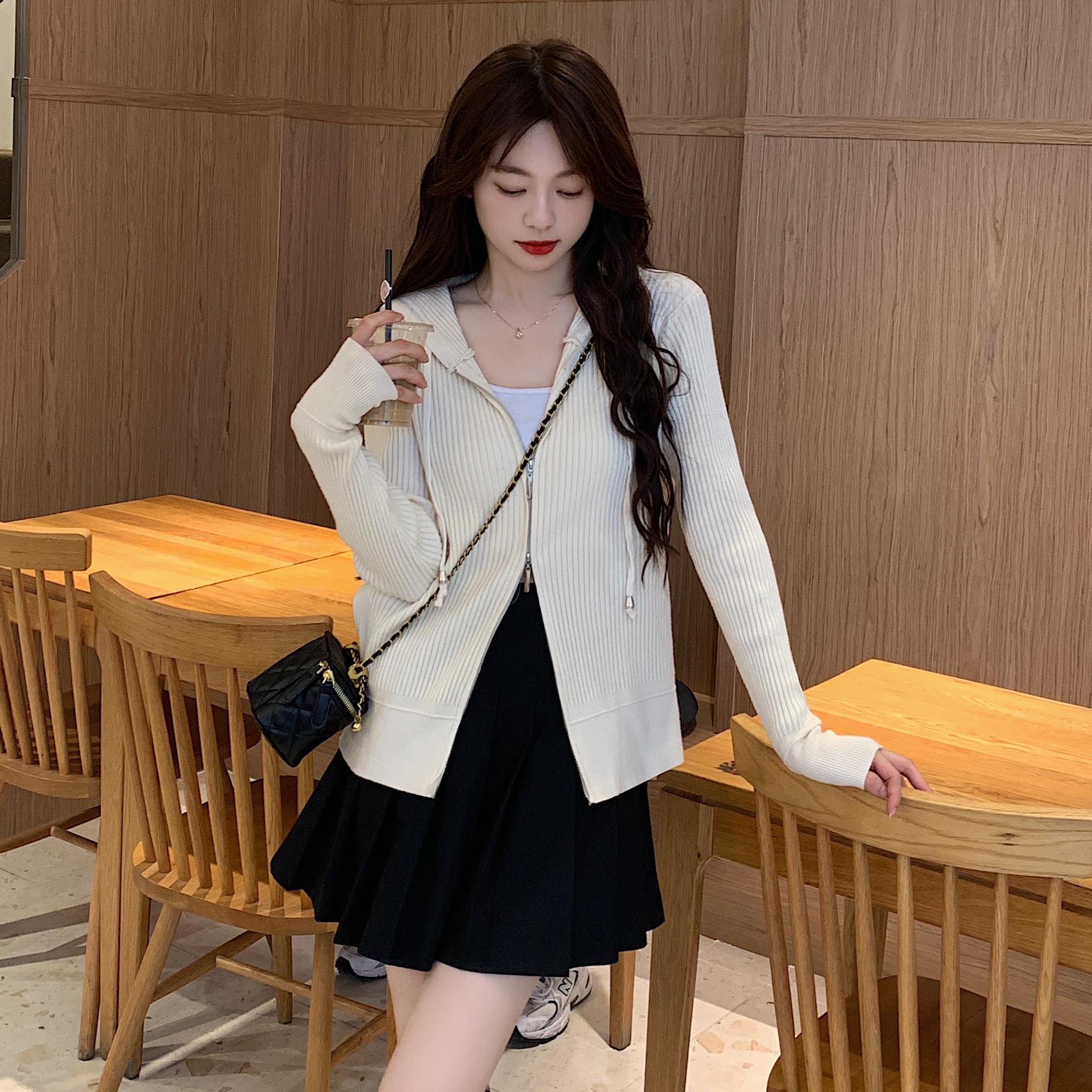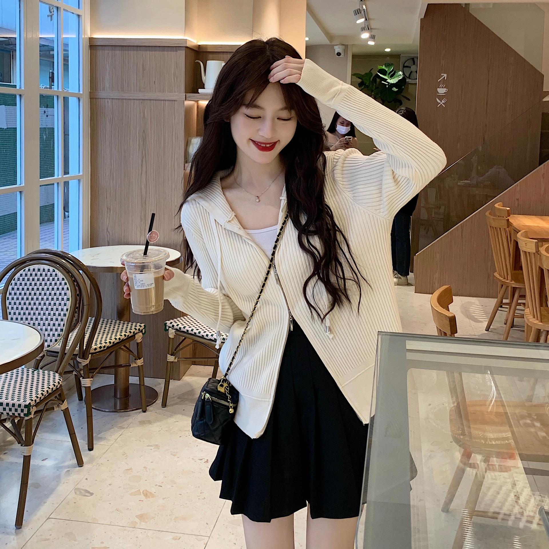 Cárdigan de punto con capucha para mujer, ropa exterior de primavera y otoño, talla grande, gorda mm, estilo holgado y perezoso, cremallera de doble cabeza, top corto con abertura.