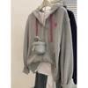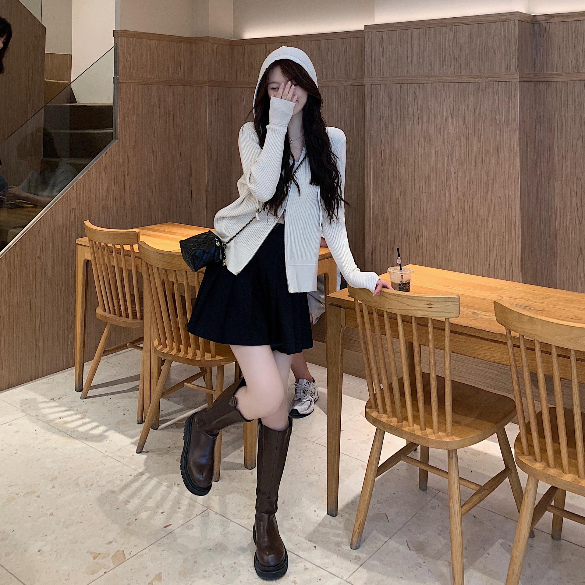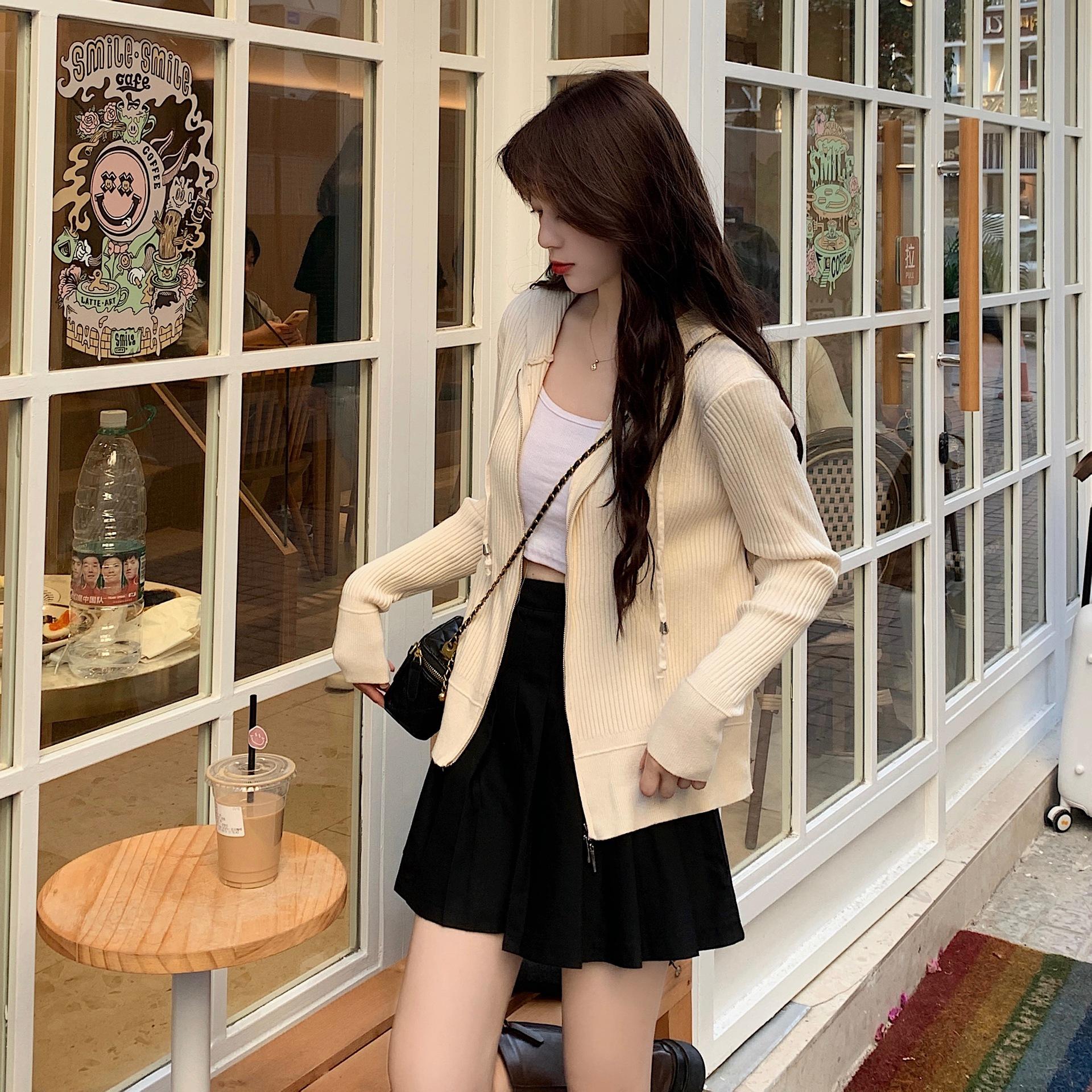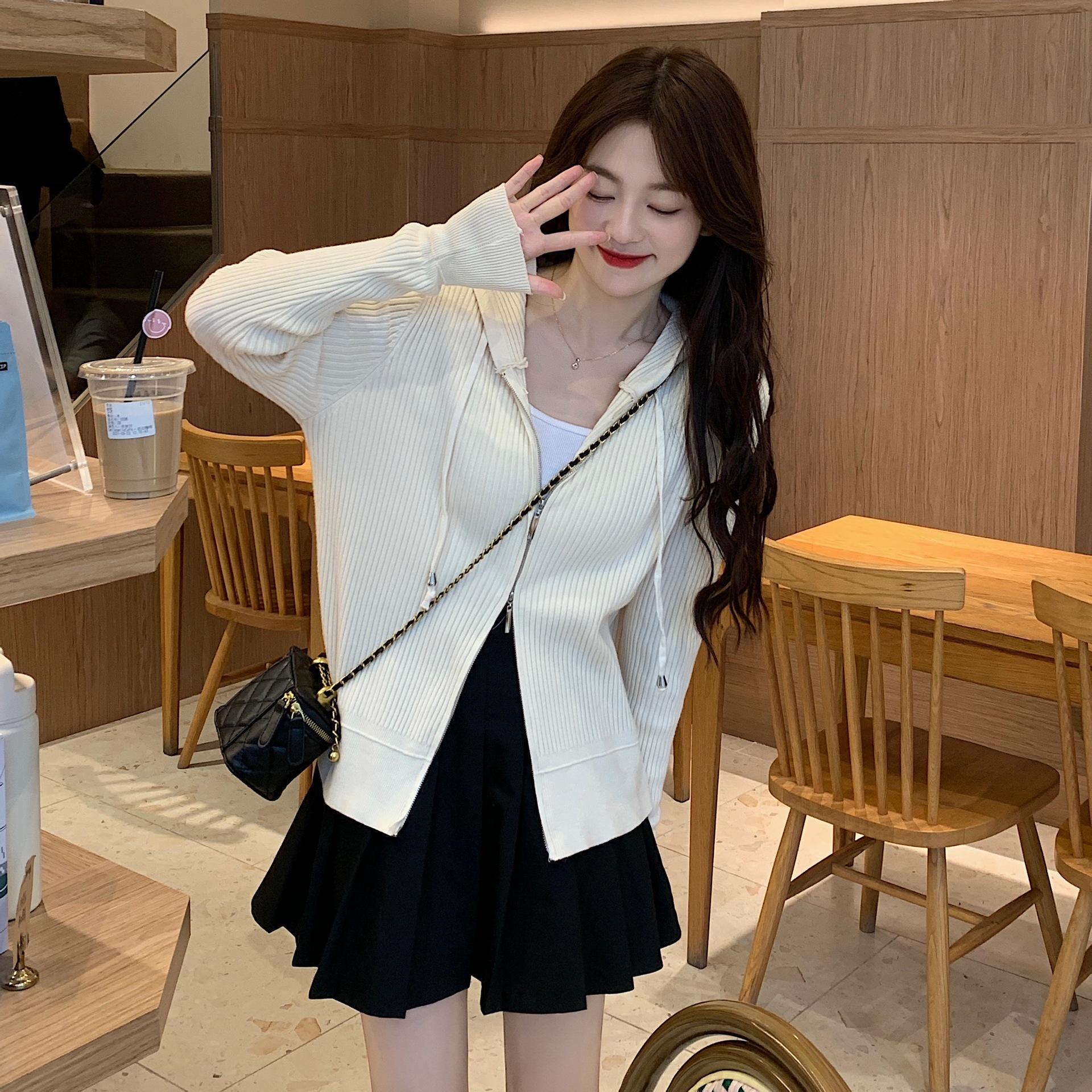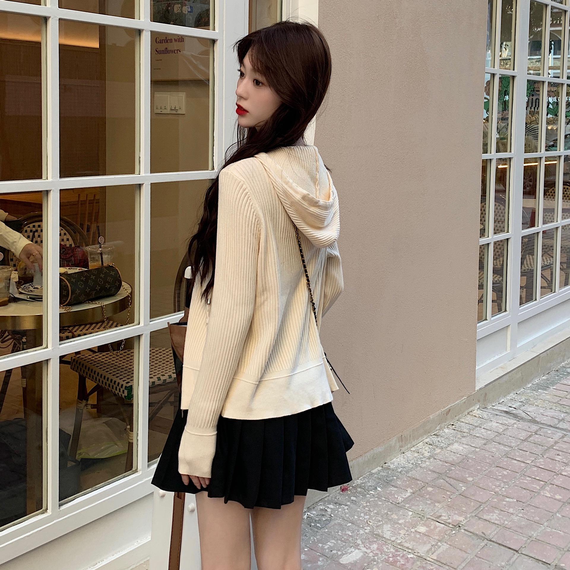 Cárdigan de punto con capucha para mujer, ropa exterior de primavera y otoño, talla grande, gorda mm, estilo holgado y perezoso, cremallera de doble cabeza, top corto con abertura.