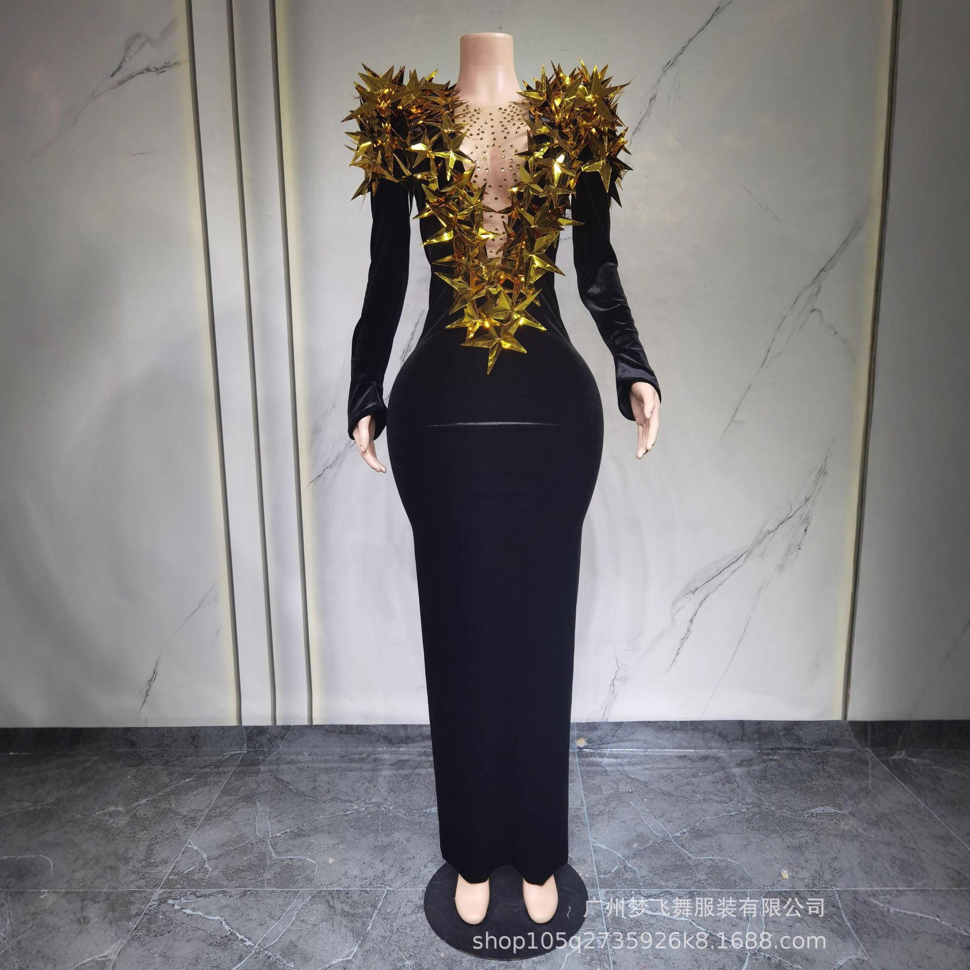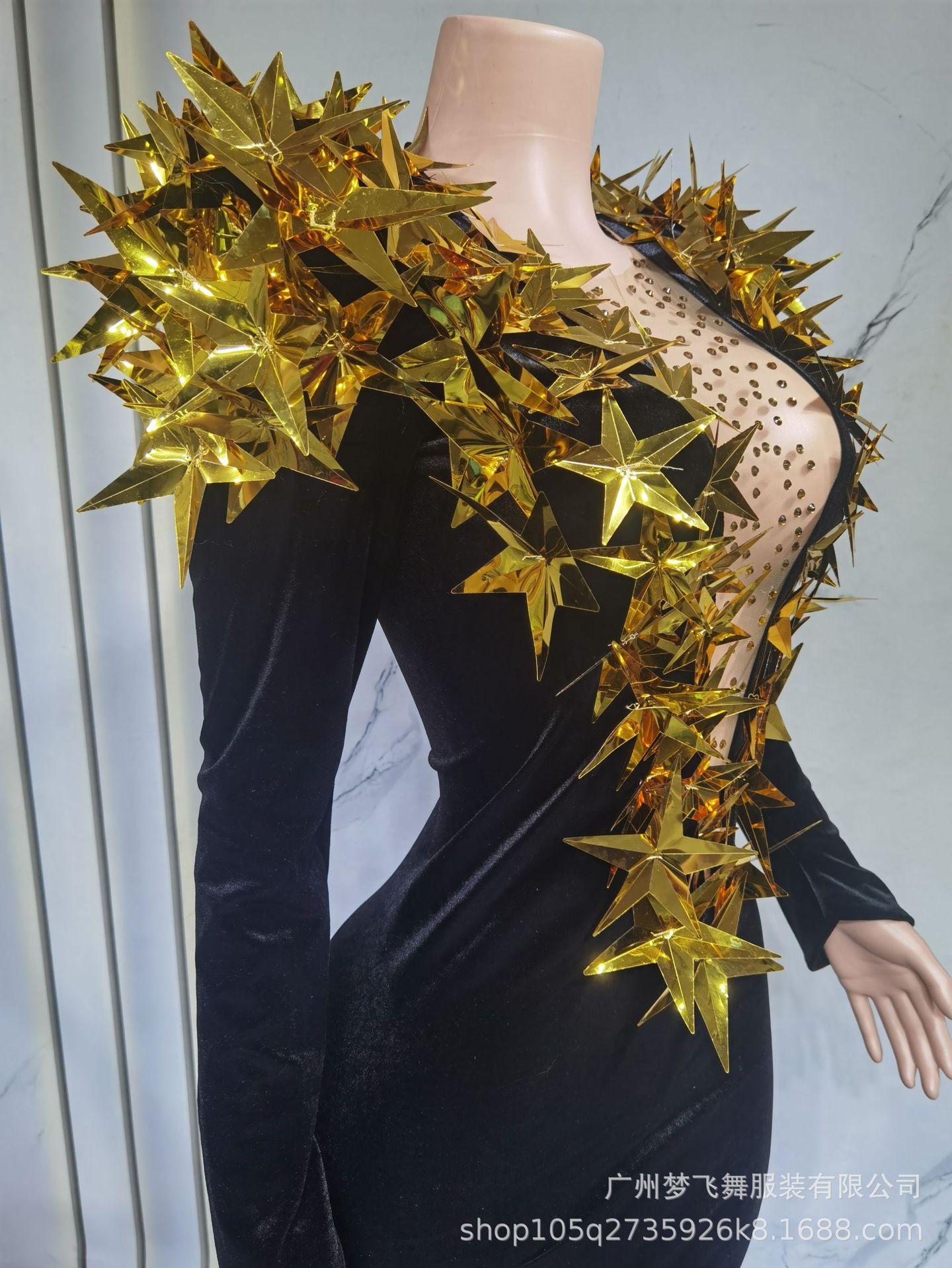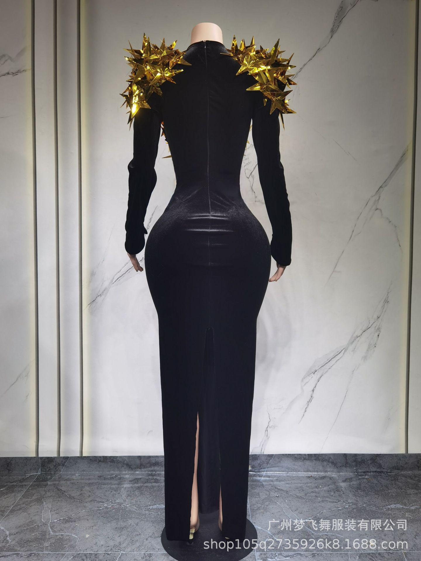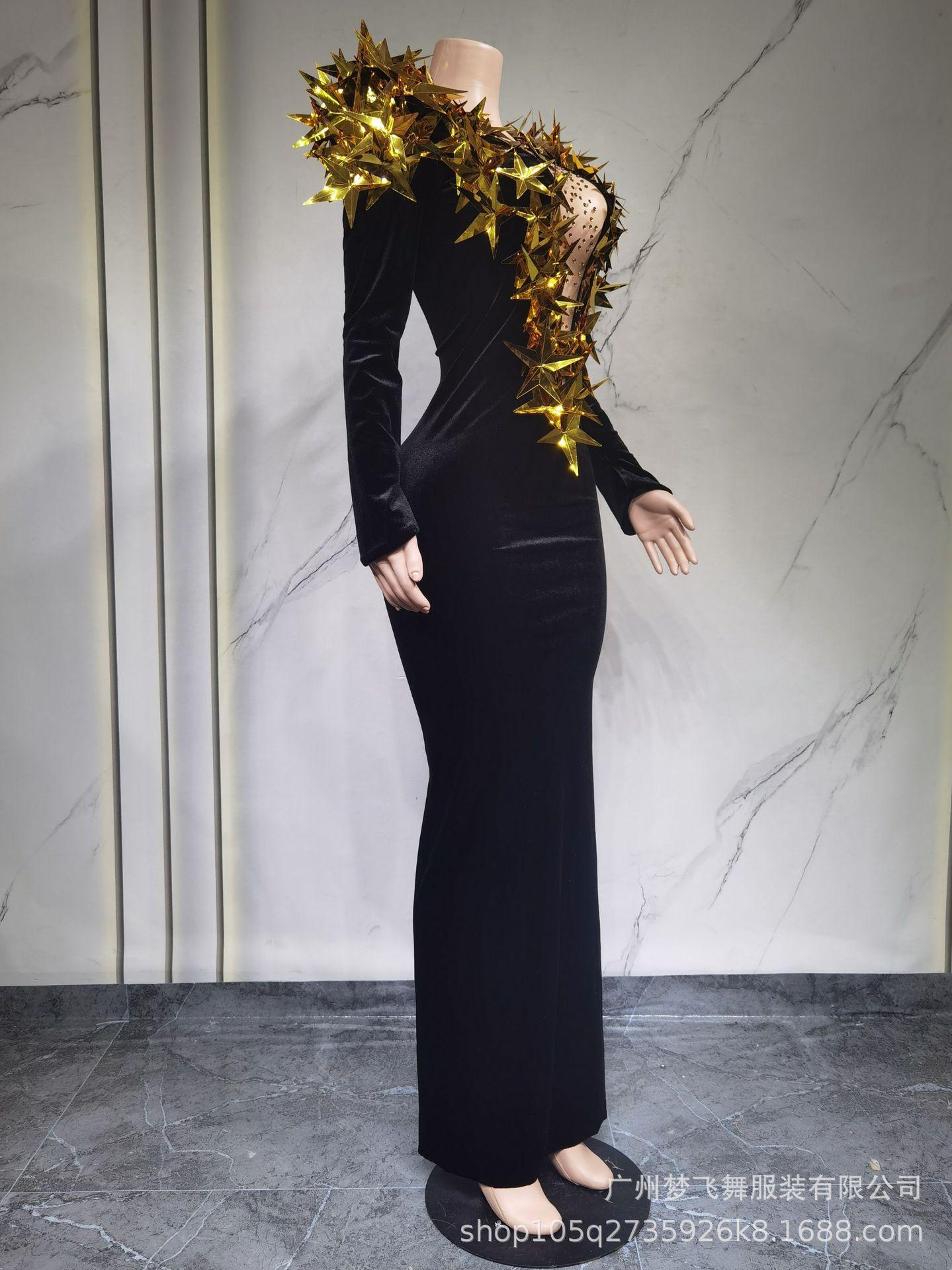Vestido de Terciopelo Negro con Lentejuelas de Estrella Dorada Brillante Europeo y Americano Modelo Pasarela Moda para Mujer Vestido de Fiesta Nuevo