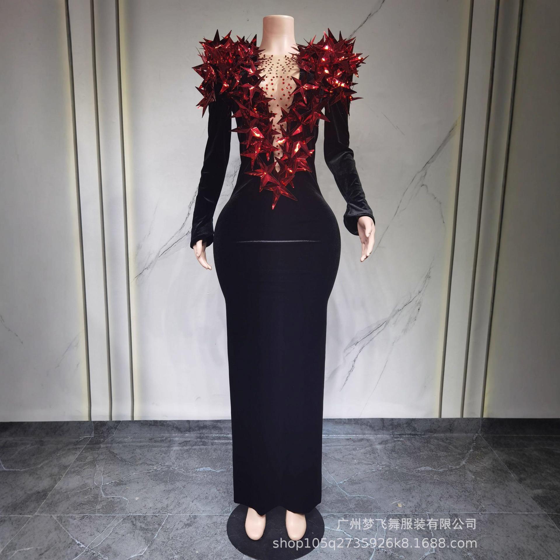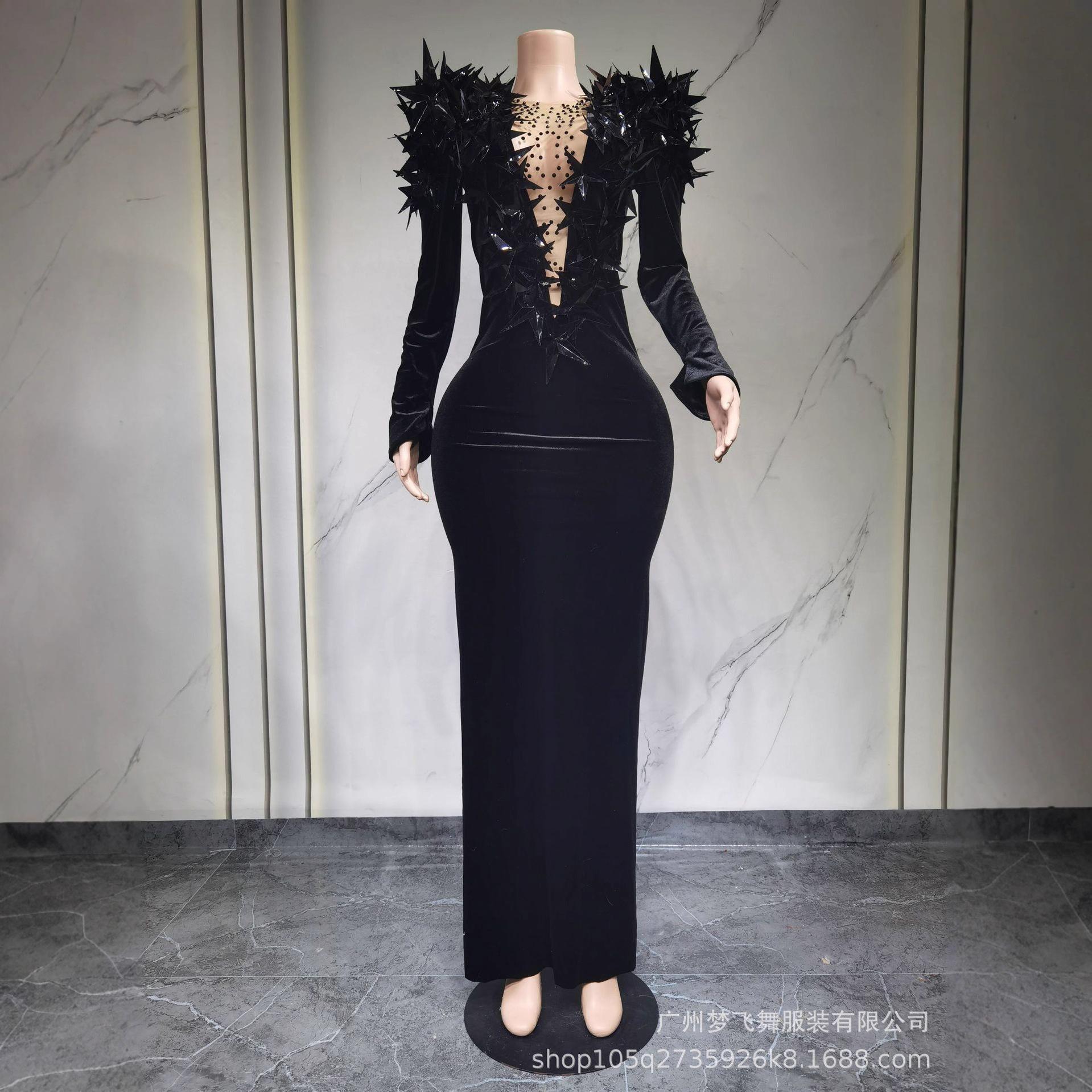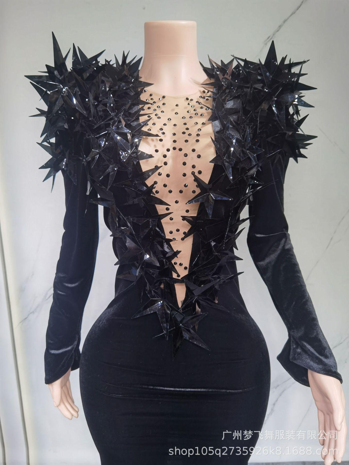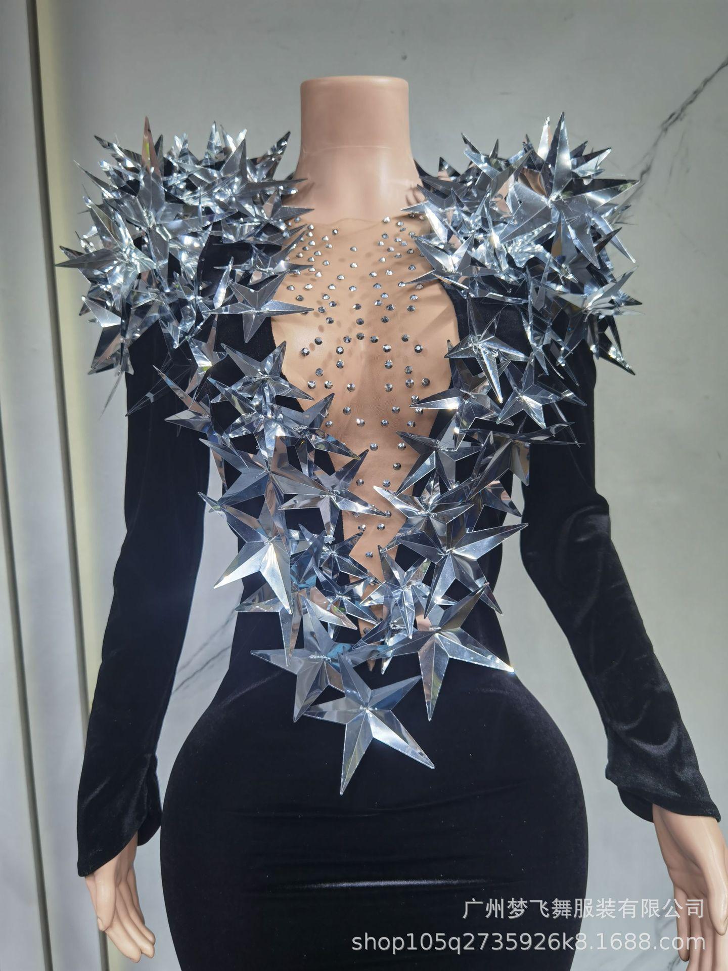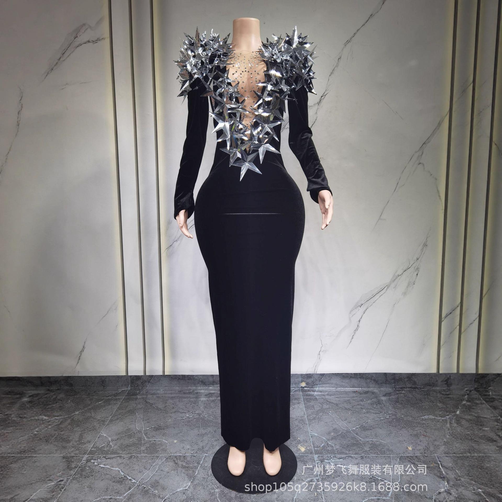Vestido de Terciopelo Negro con Lentejuelas de Estrella Dorada Brillante Europeo y Americano Modelo Pasarela Moda para Mujer Vestido de Fiesta Nuevo