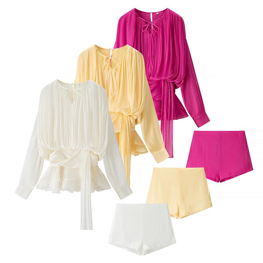 Rose red top, Rose red shorts, White top, White shorts, Yellow top, Yellow shorts, Off-white top, Off-white sh...