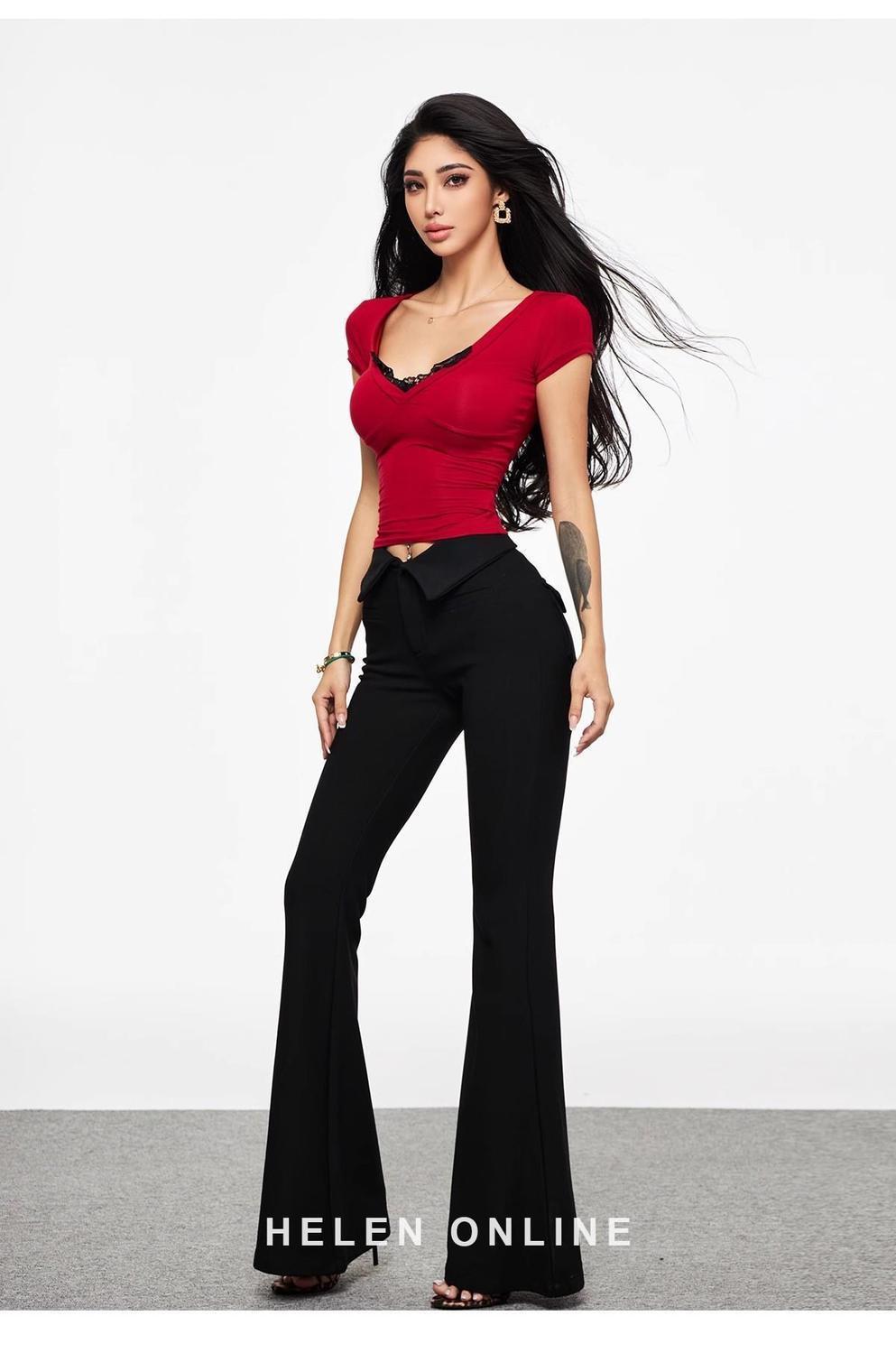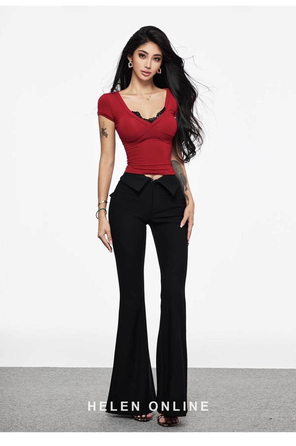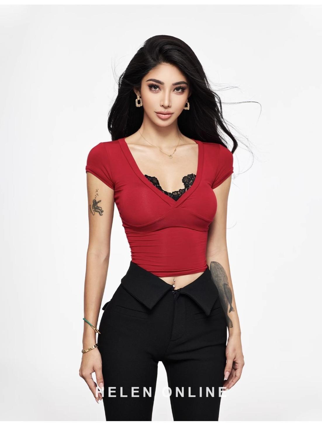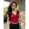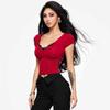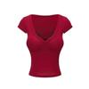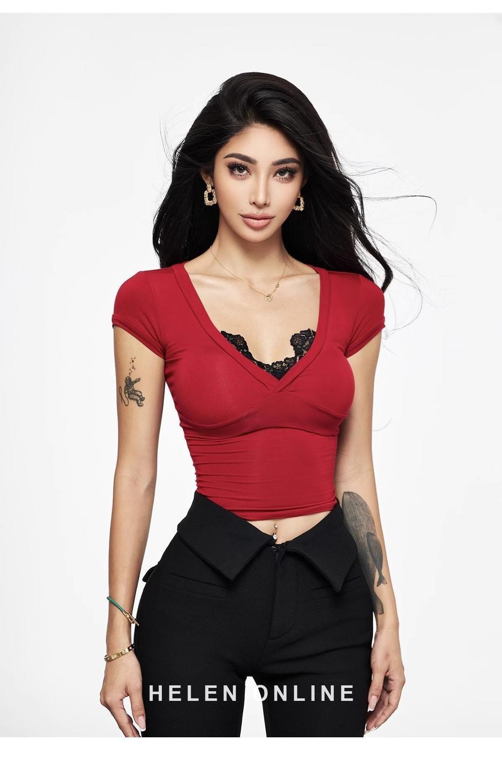 Algodón Puro Sexy Chica Caliente Moda Camiseta de Manga Corta con Cuello en V para Mujer Verano Nueva Adelgazante Costuras Hombro Recto Top Rojo