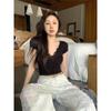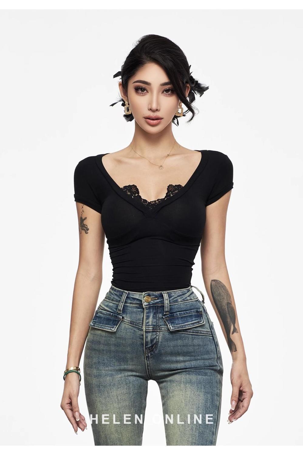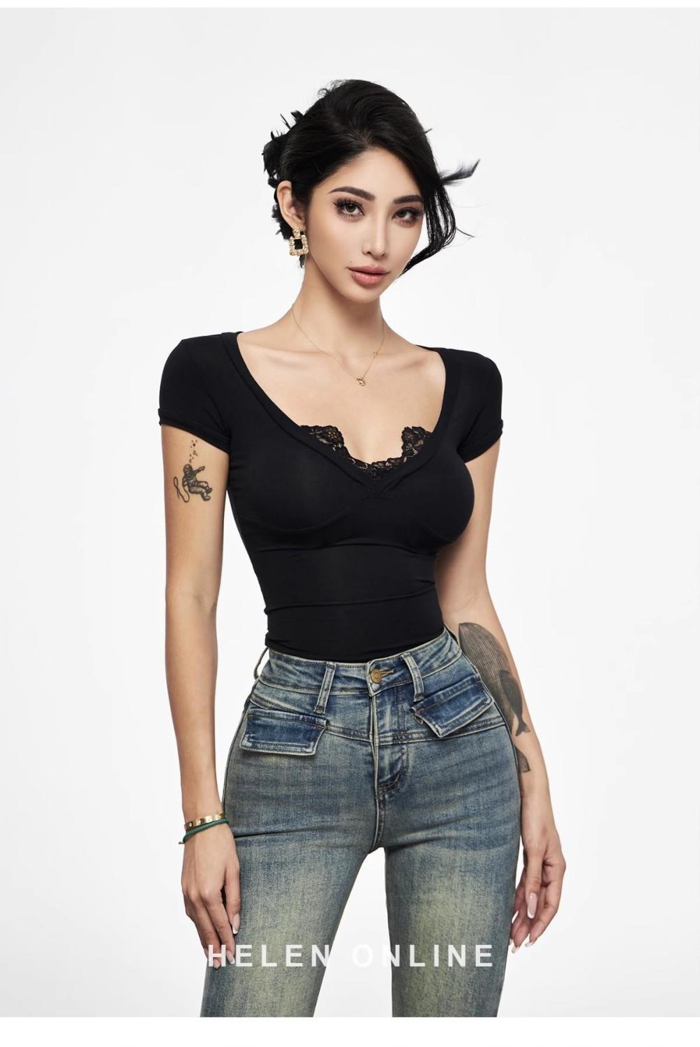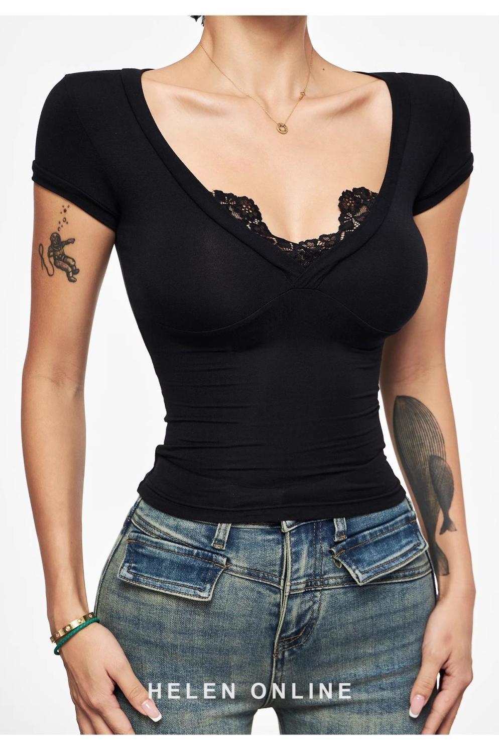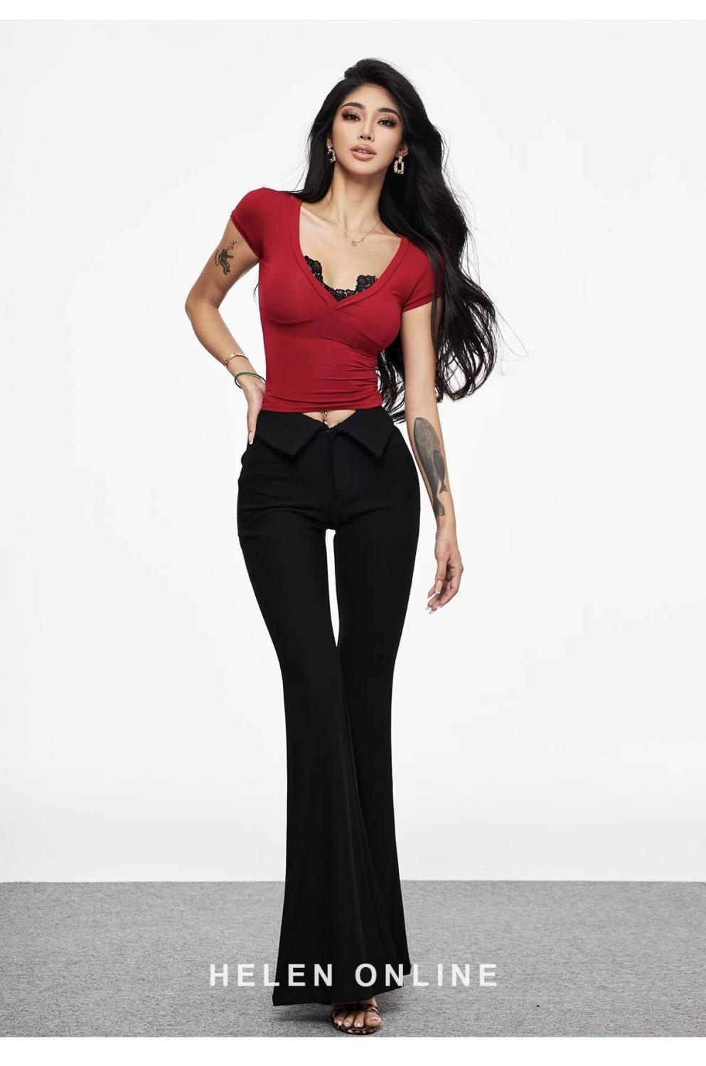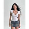 Algodón Puro Sexy Chica Caliente Moda Camiseta de Manga Corta con Cuello en V para Mujer Verano Nueva Adelgazante Costuras Hombro Recto Top Rojo