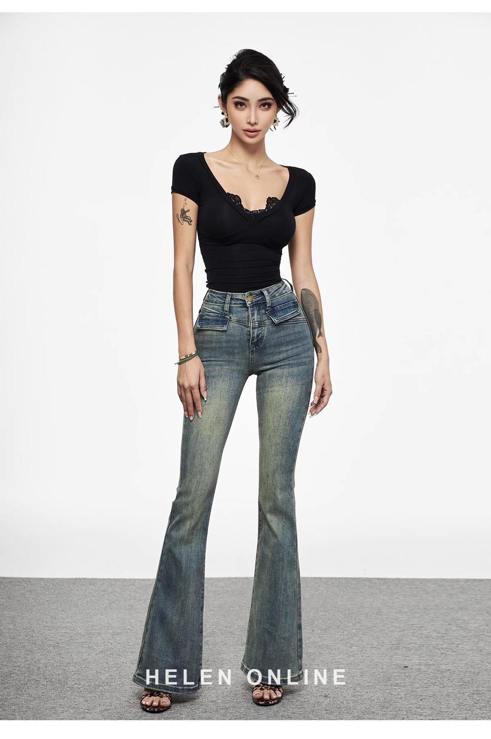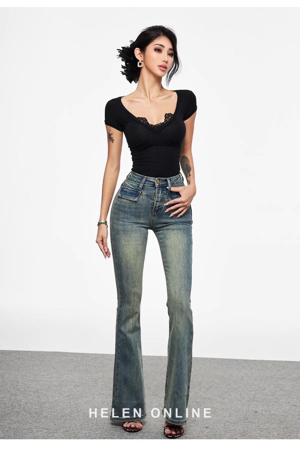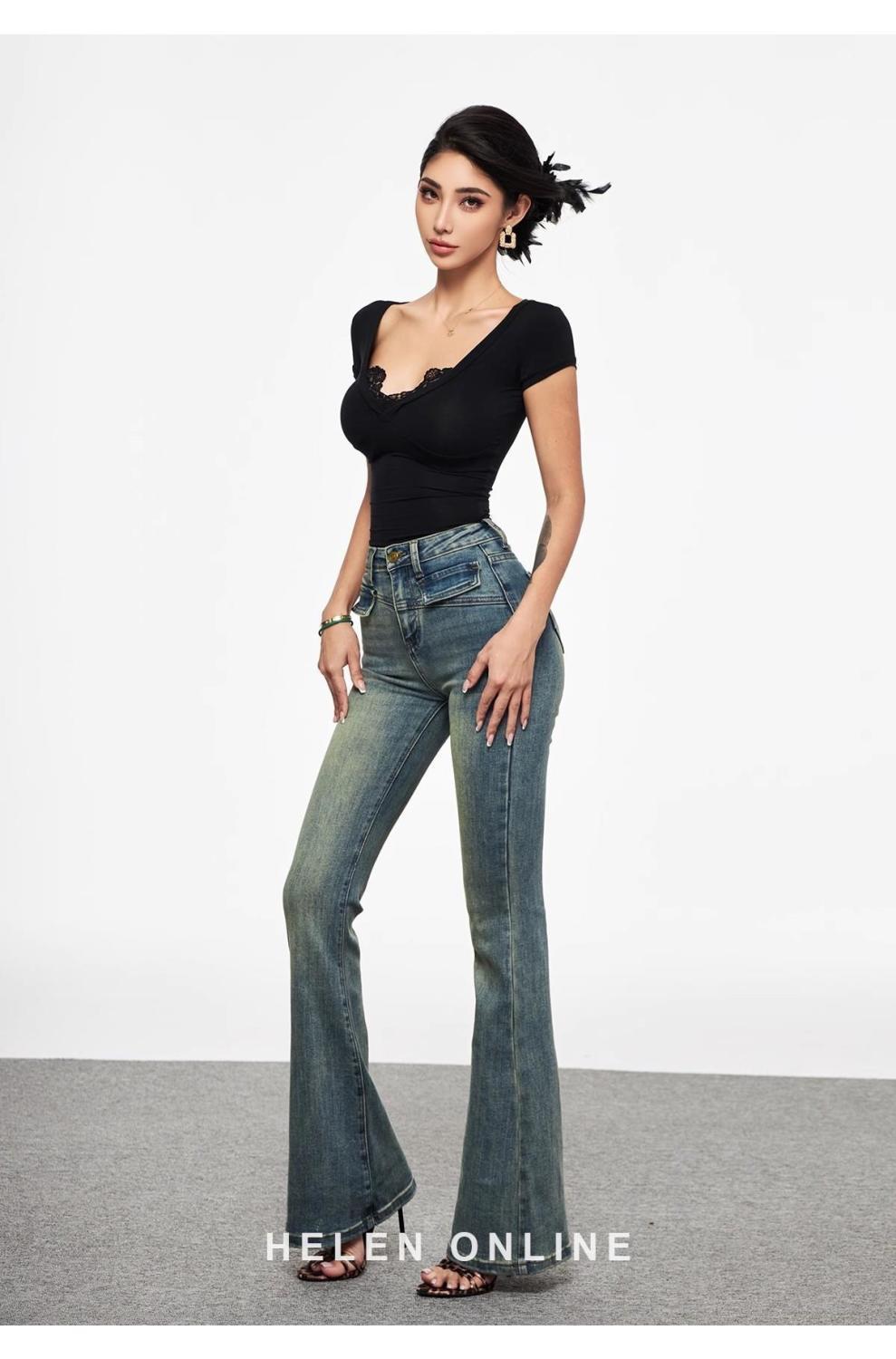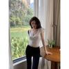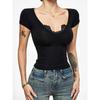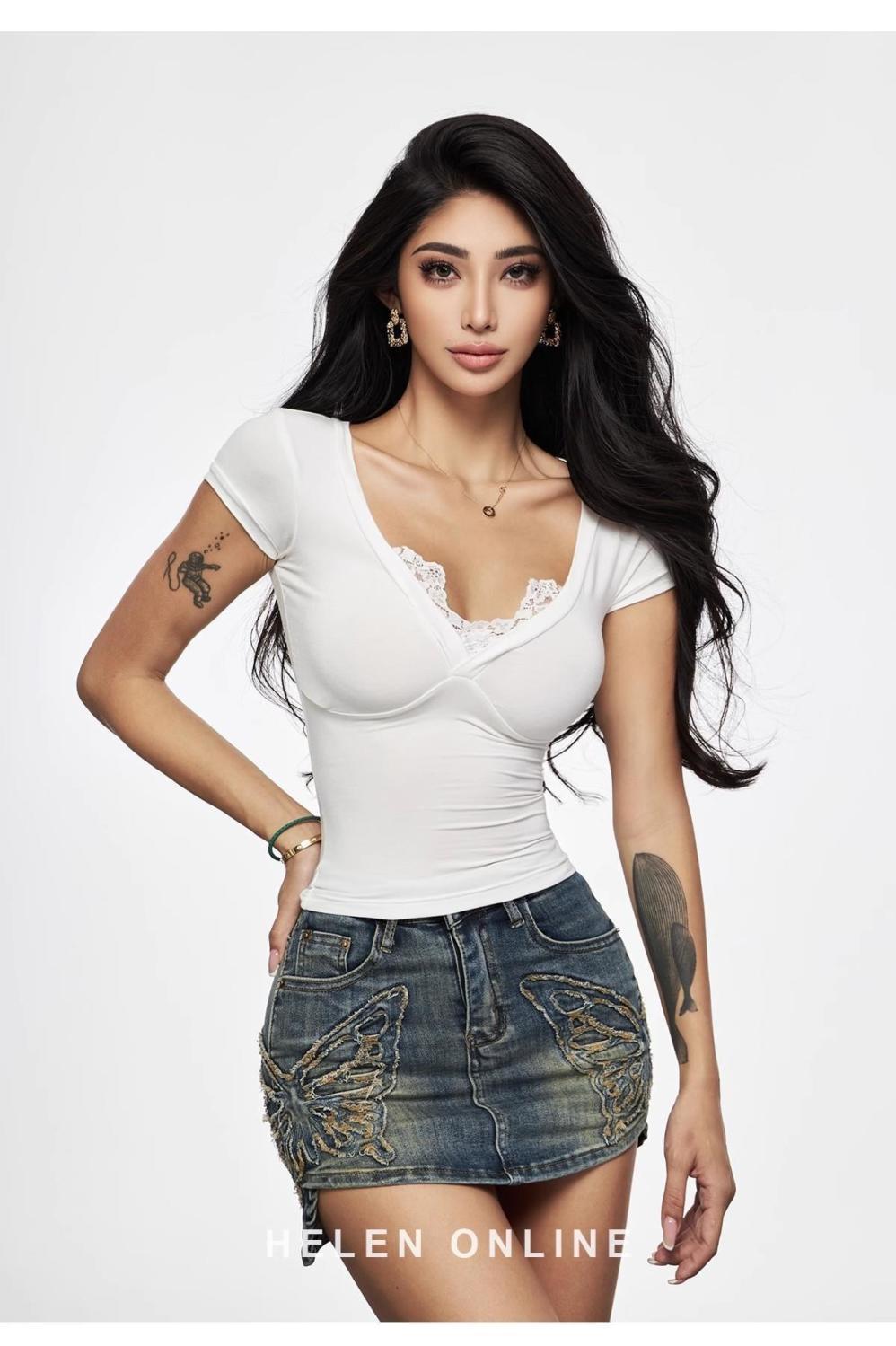 Algodón Puro Sexy Chica Caliente Moda Camiseta de Manga Corta con Cuello en V para Mujer Verano Nueva Adelgazante Costuras Hombro Recto Top Rojo