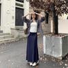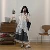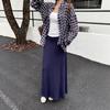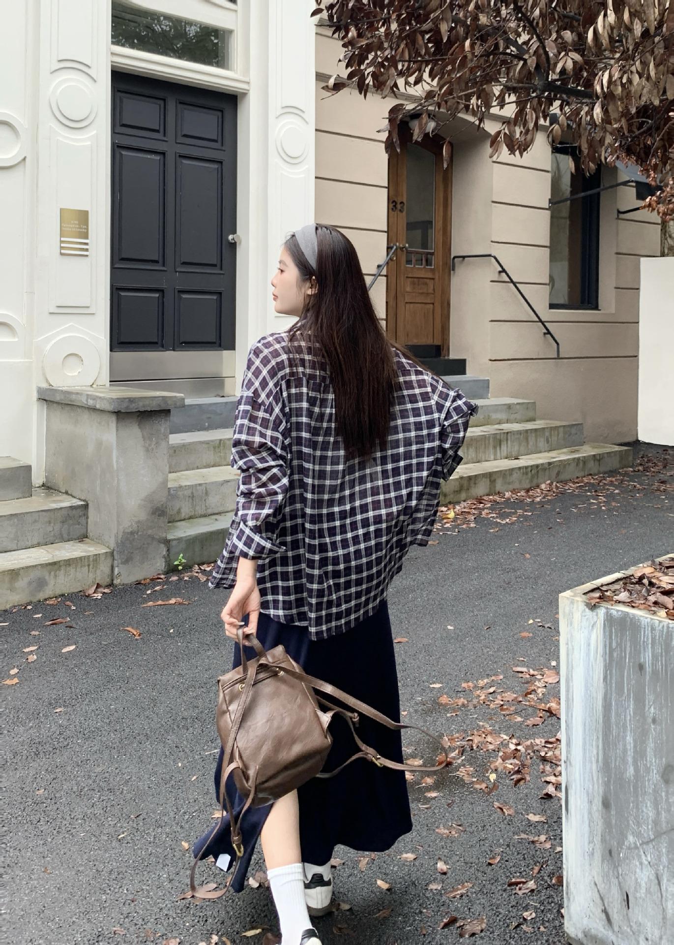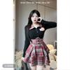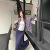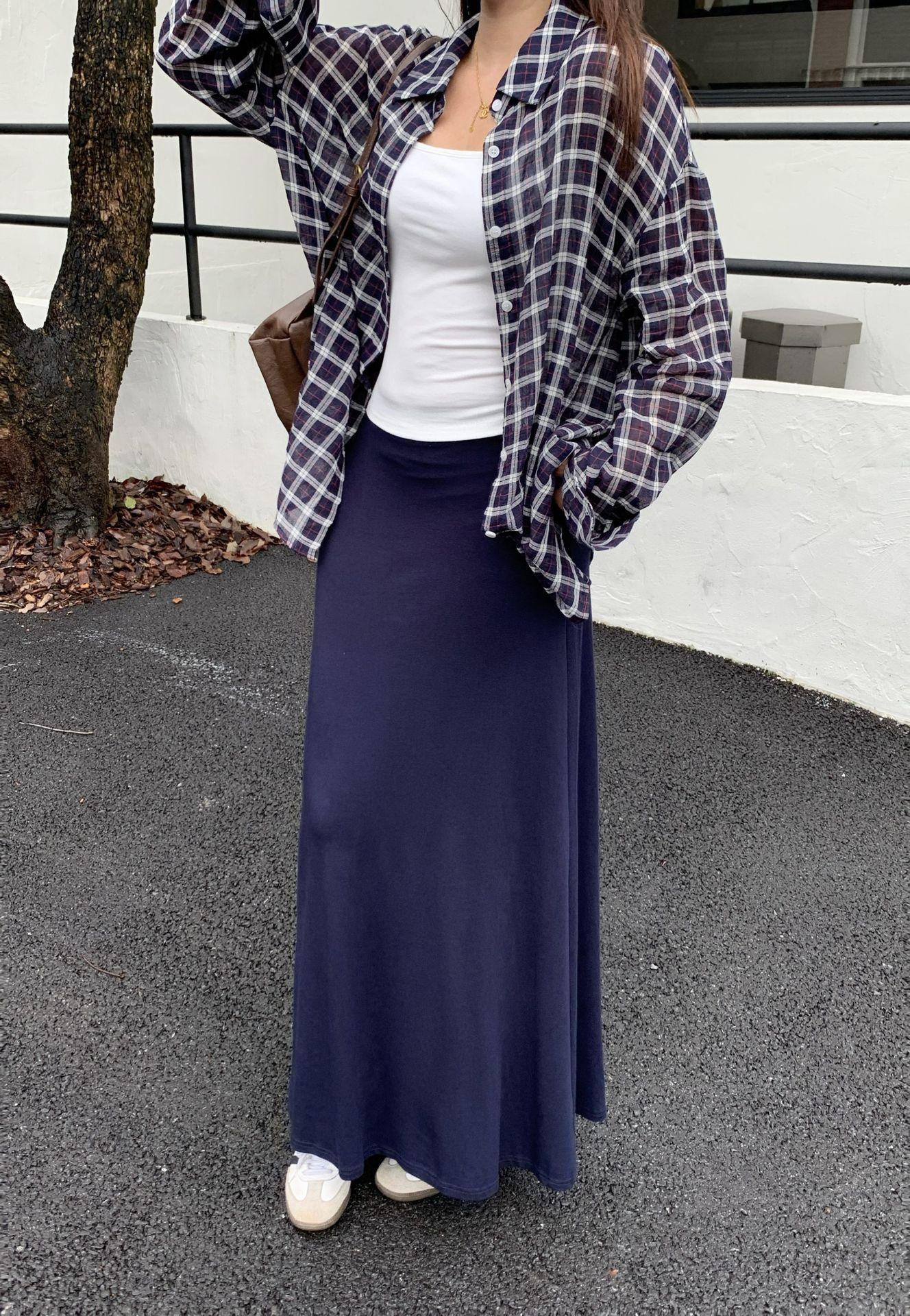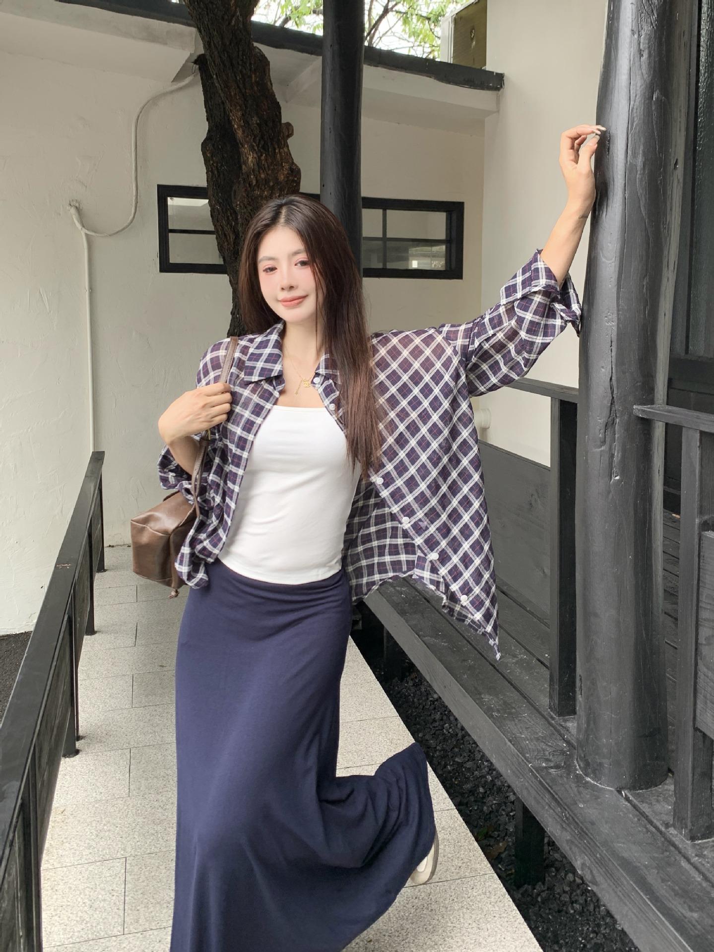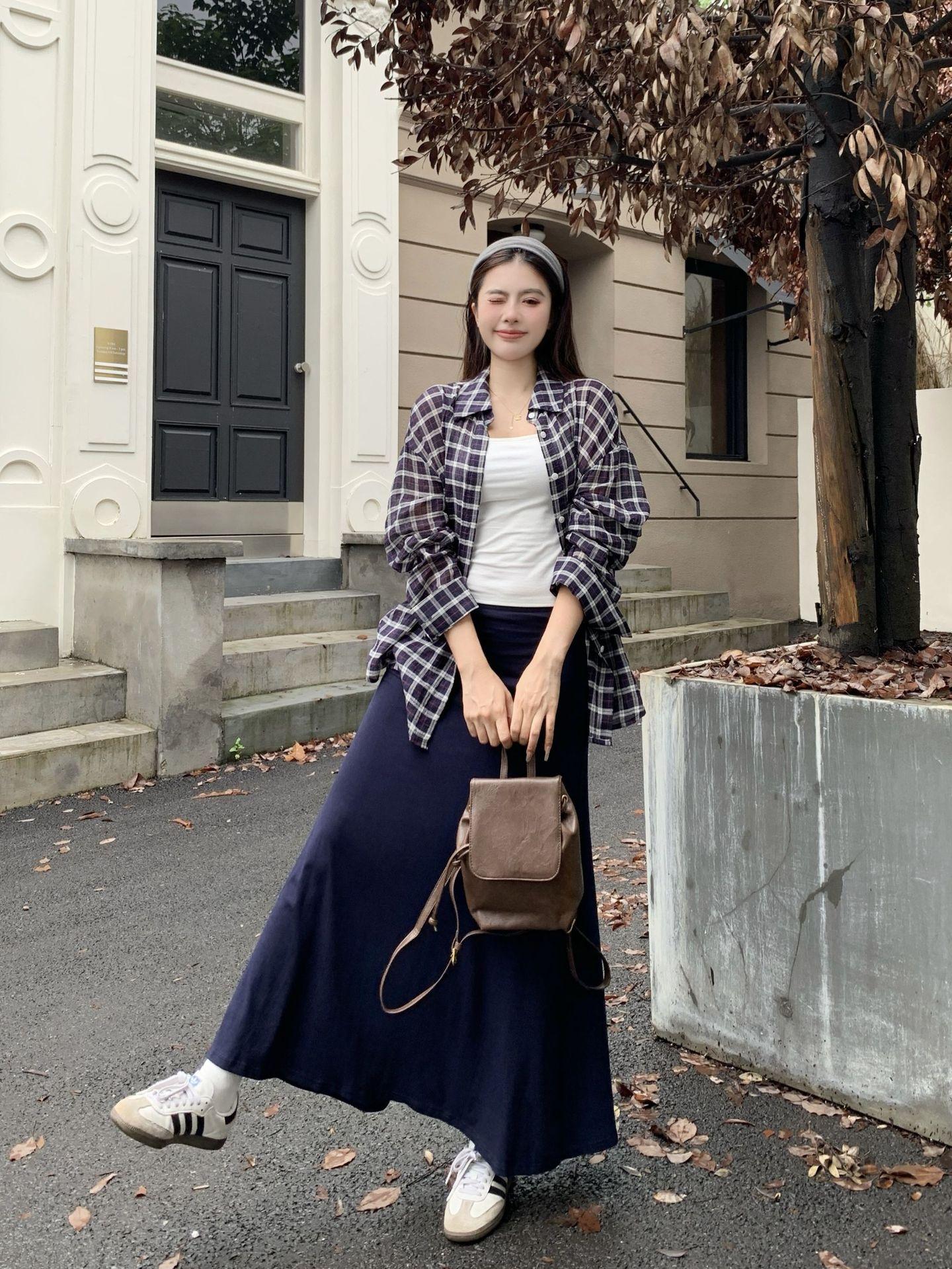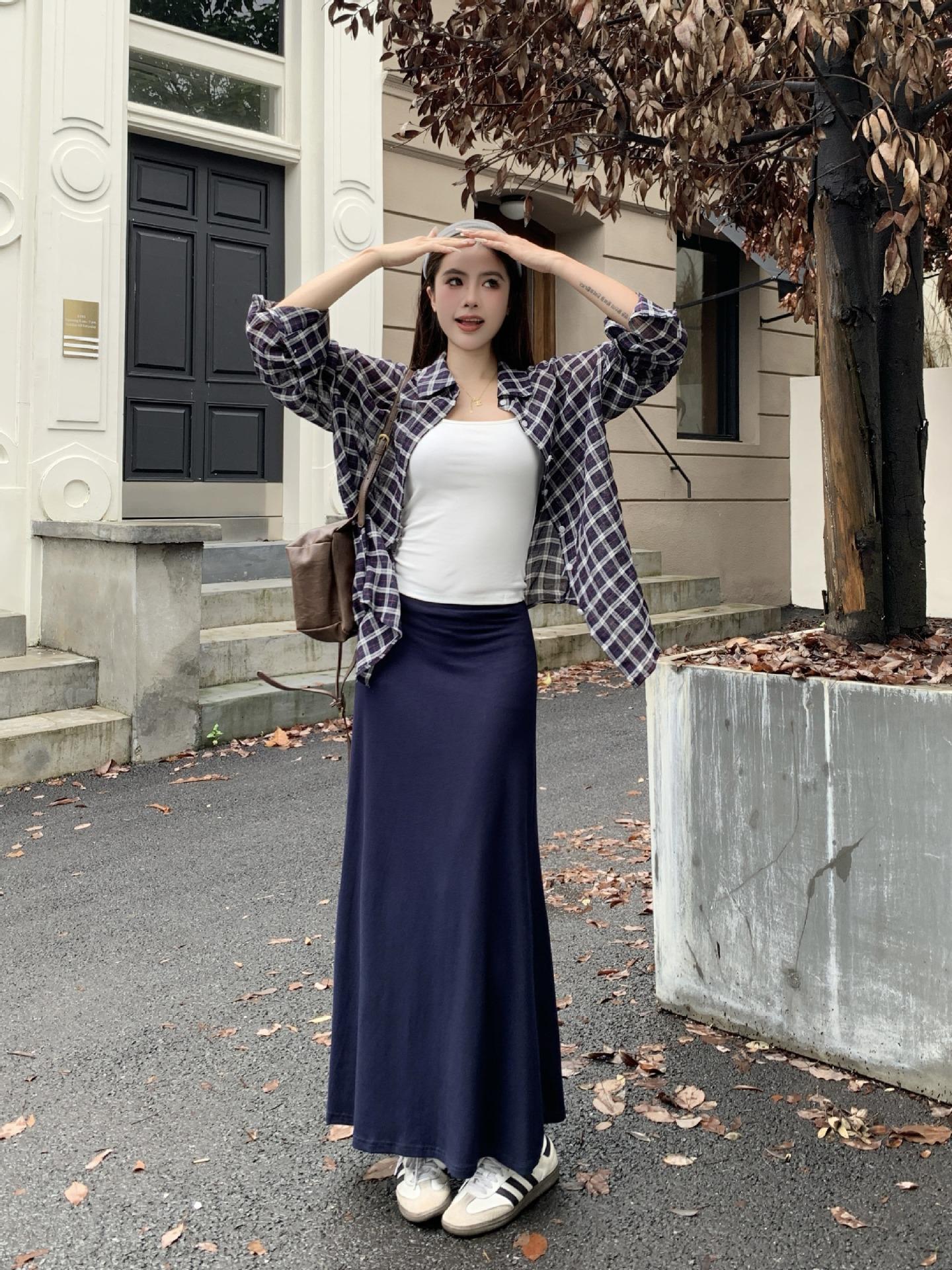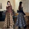 Otoño Nuevo Camisola Adelgazante + Camisa Holgada de Manga Larga a Cuadros + Falda Midi de Moda Talla Grande Set
