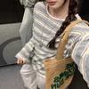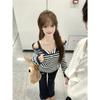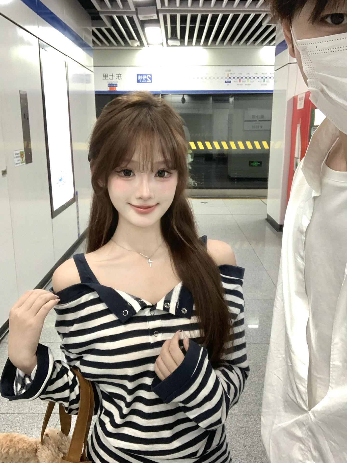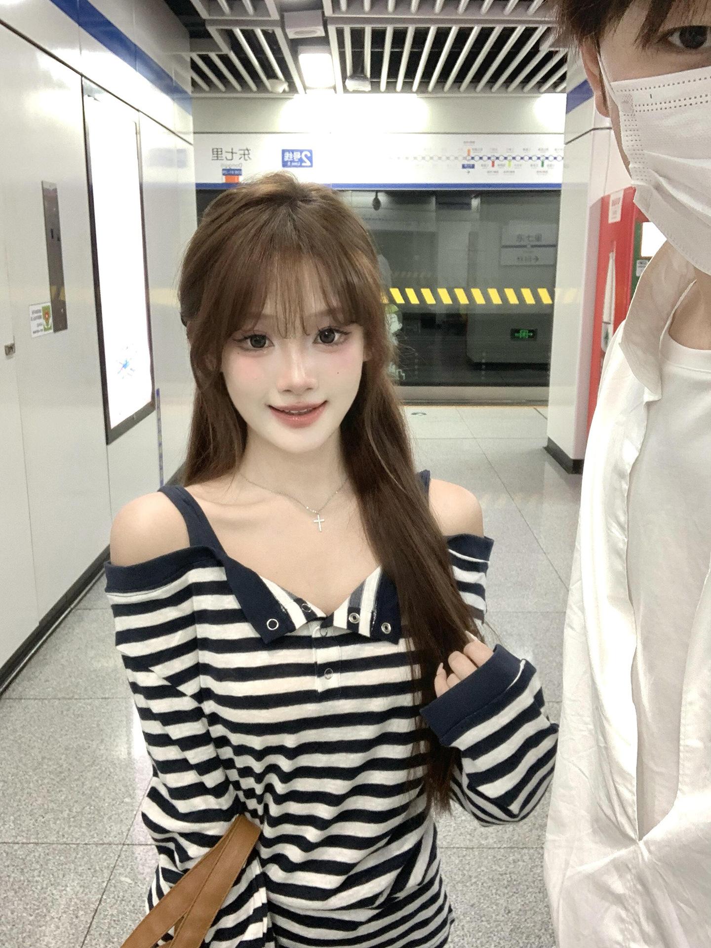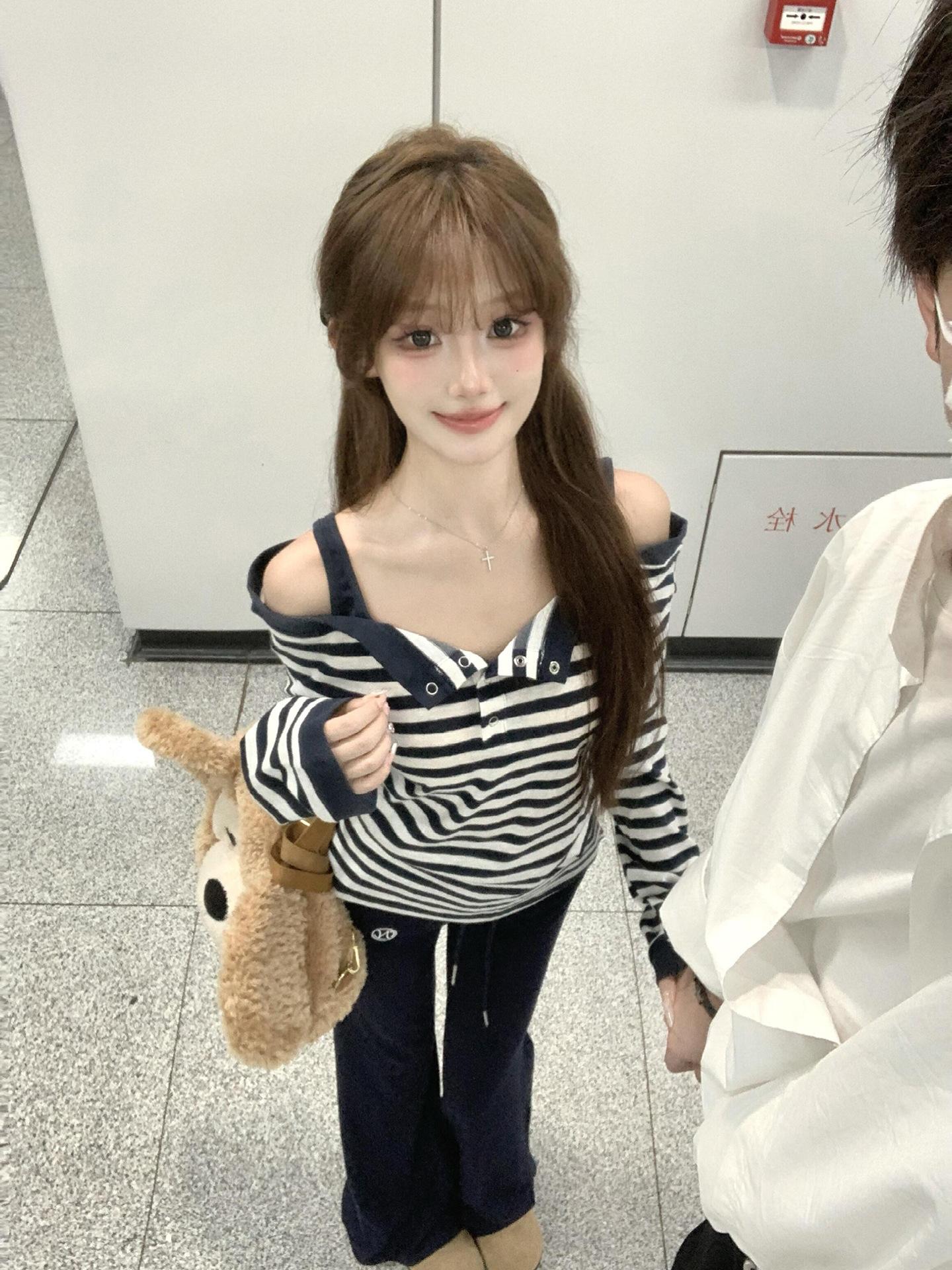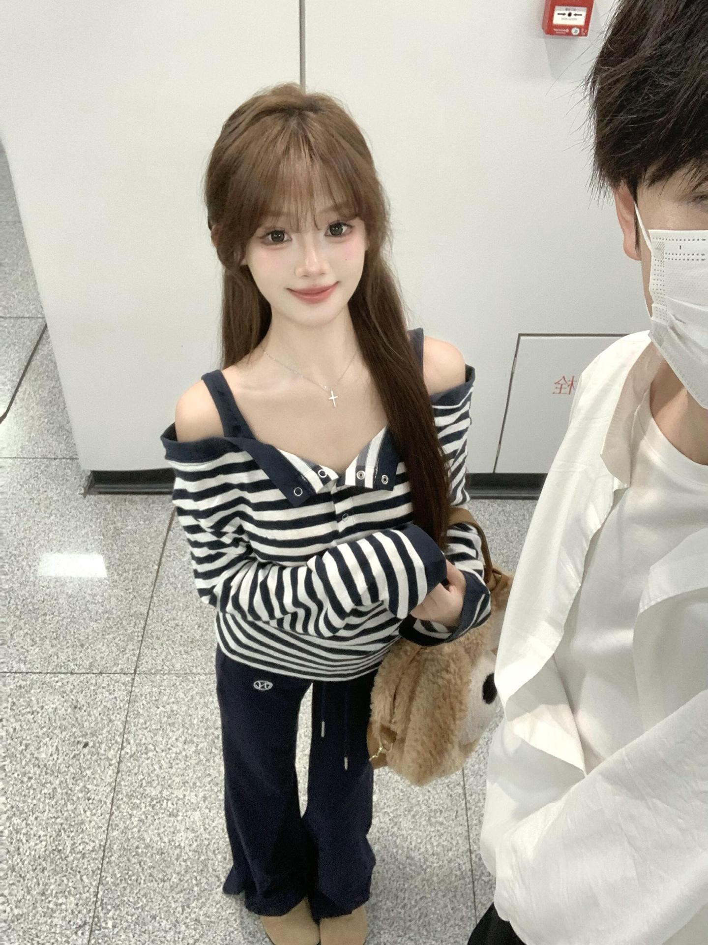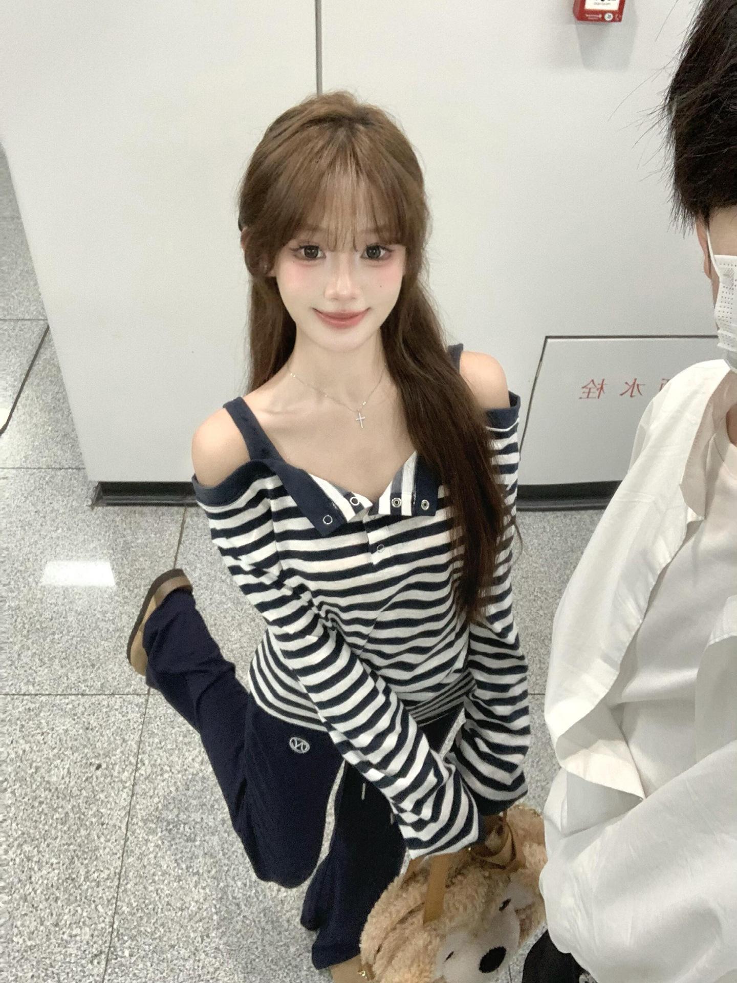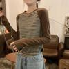 Camiseta de manga larga a rayas con bloques de color de un hombro para mujer, nueva de primavera y otoño, casual chic, holgada, relajada, top básico