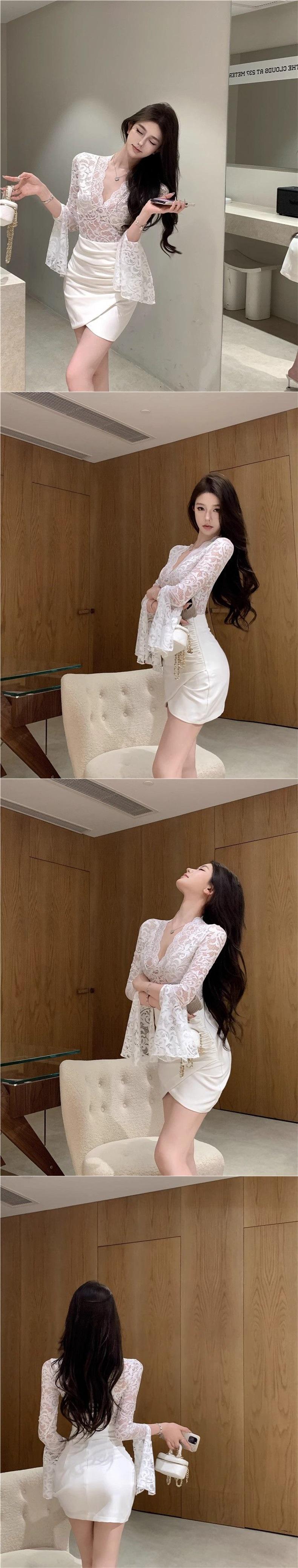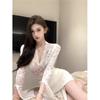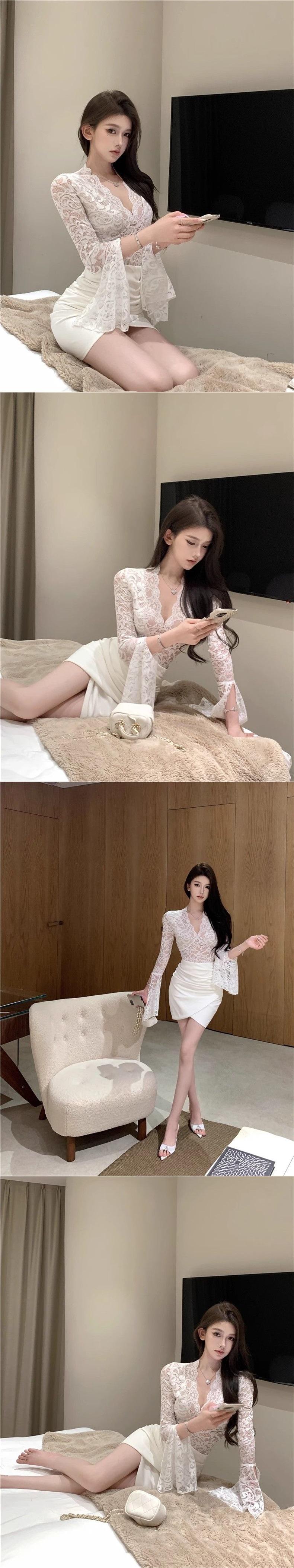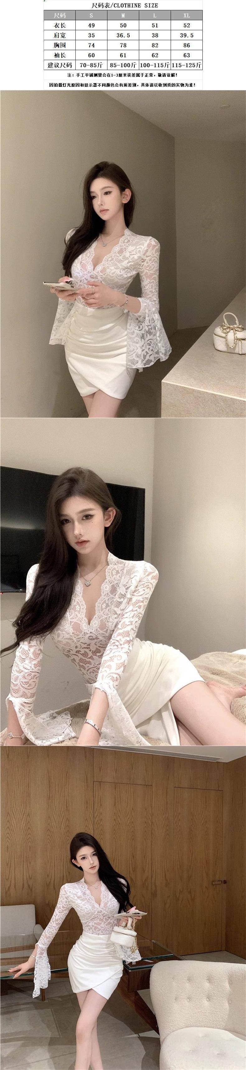 Encaje Sexy Cuello en V Camiseta para Mujer Principios de Otoño Nueva Chica Caliente Delgada Adelgazante Base Top Corto