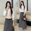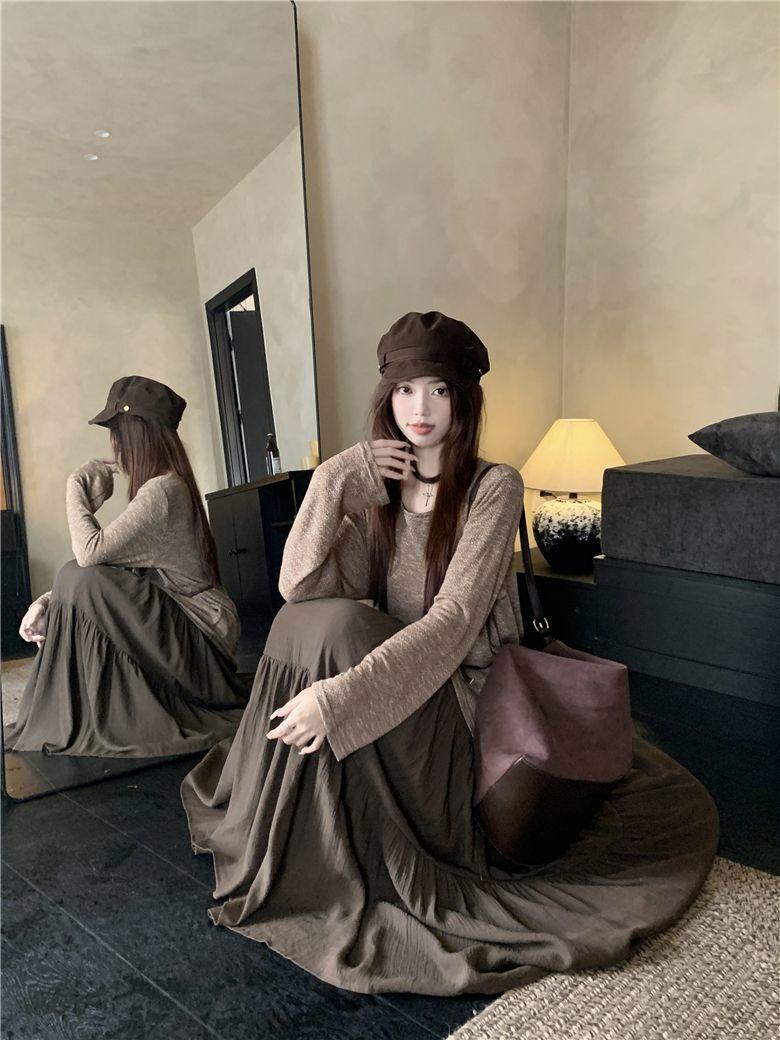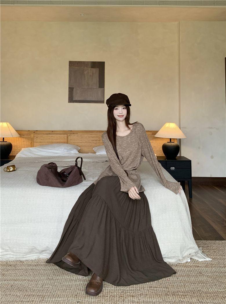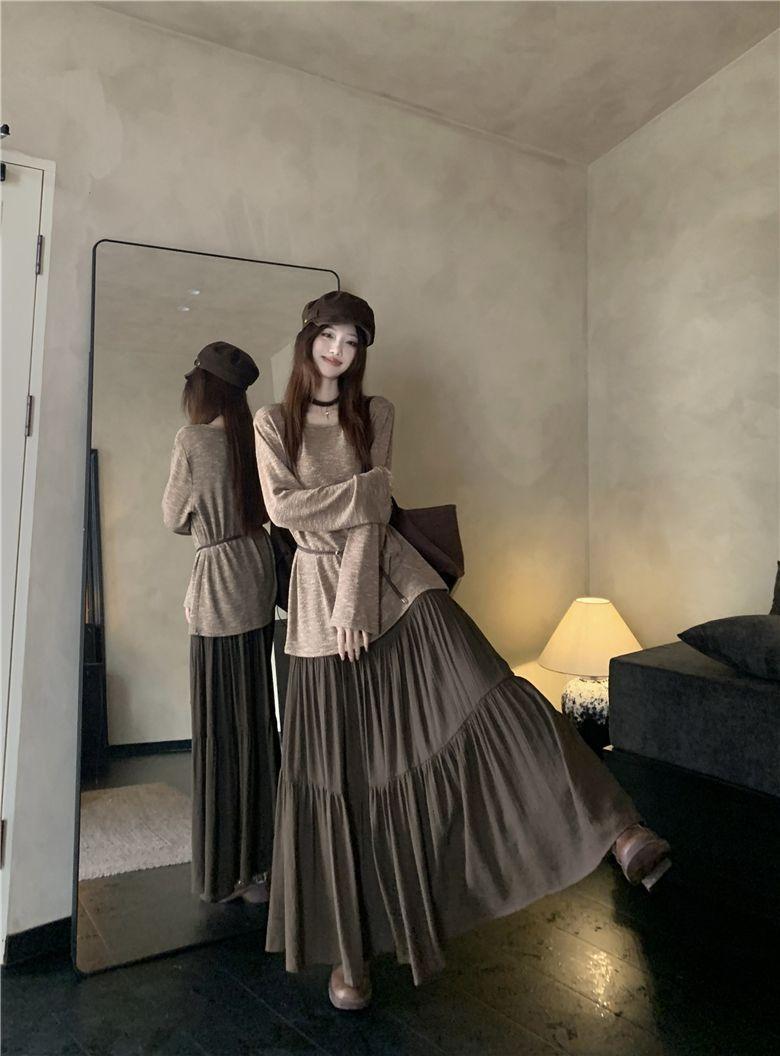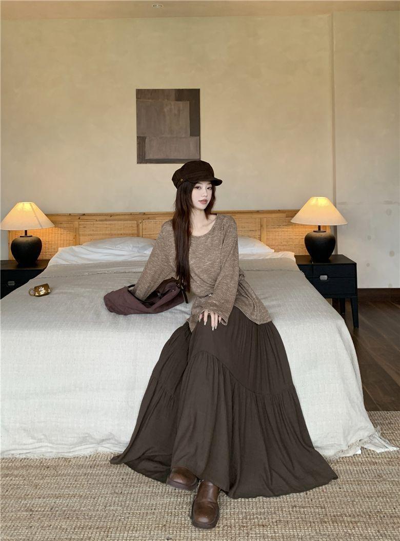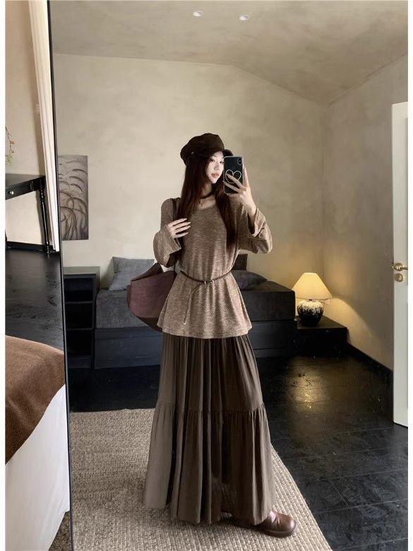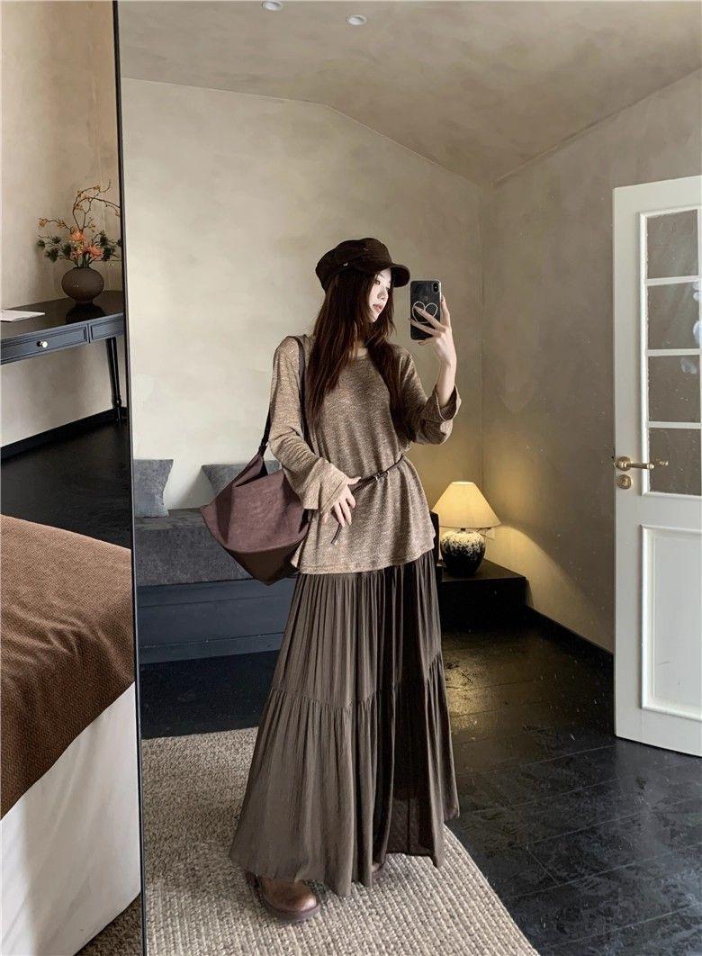 Conjunto de Ropa Maelard Talla Grande Mujer Otoño Estilo Holgazán Top Manga Larga MM Gordo Falda Midi Cintura Alta Conjunto de Dos Piezas