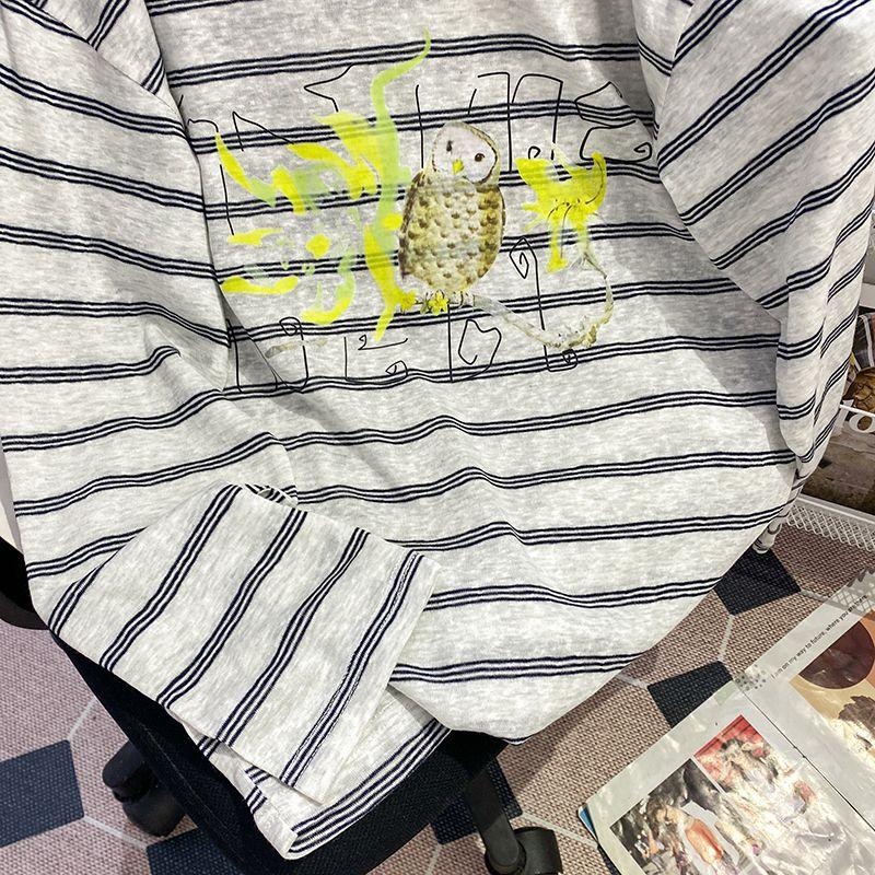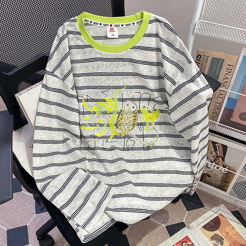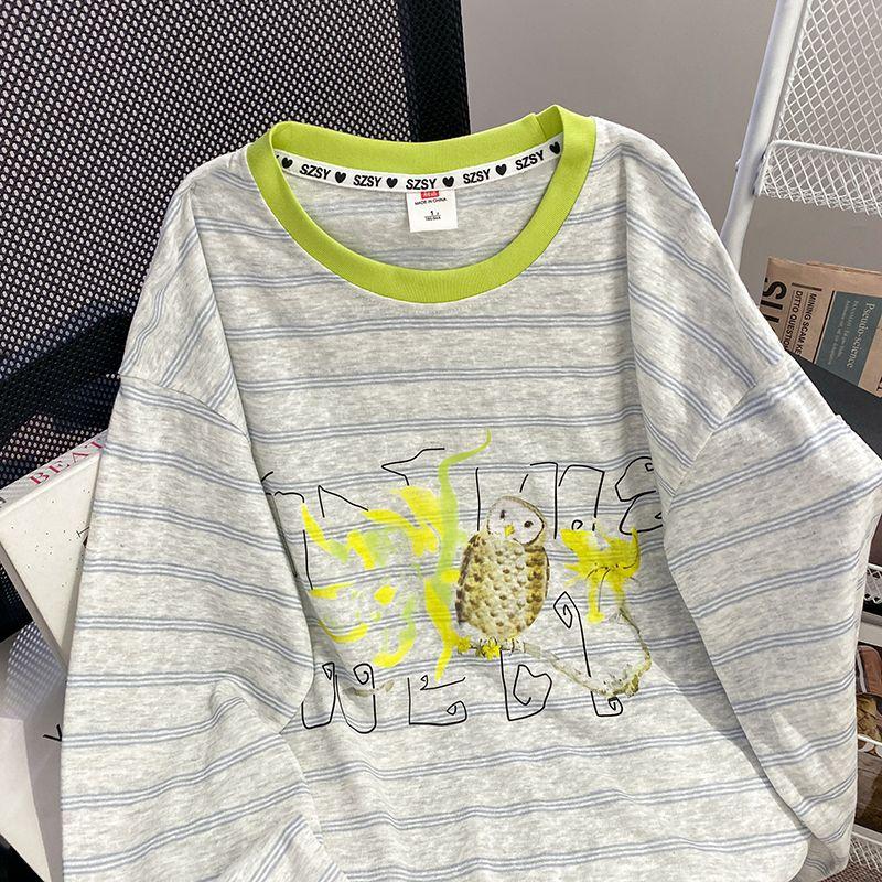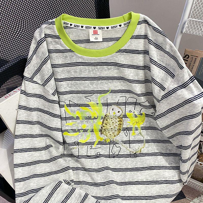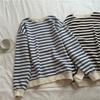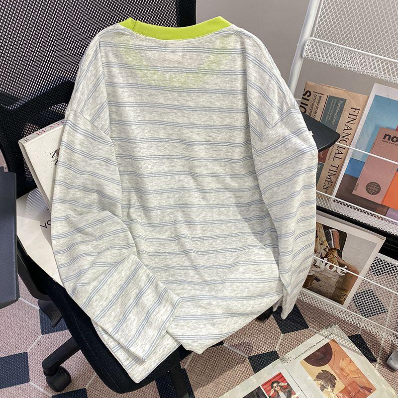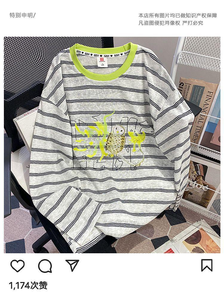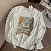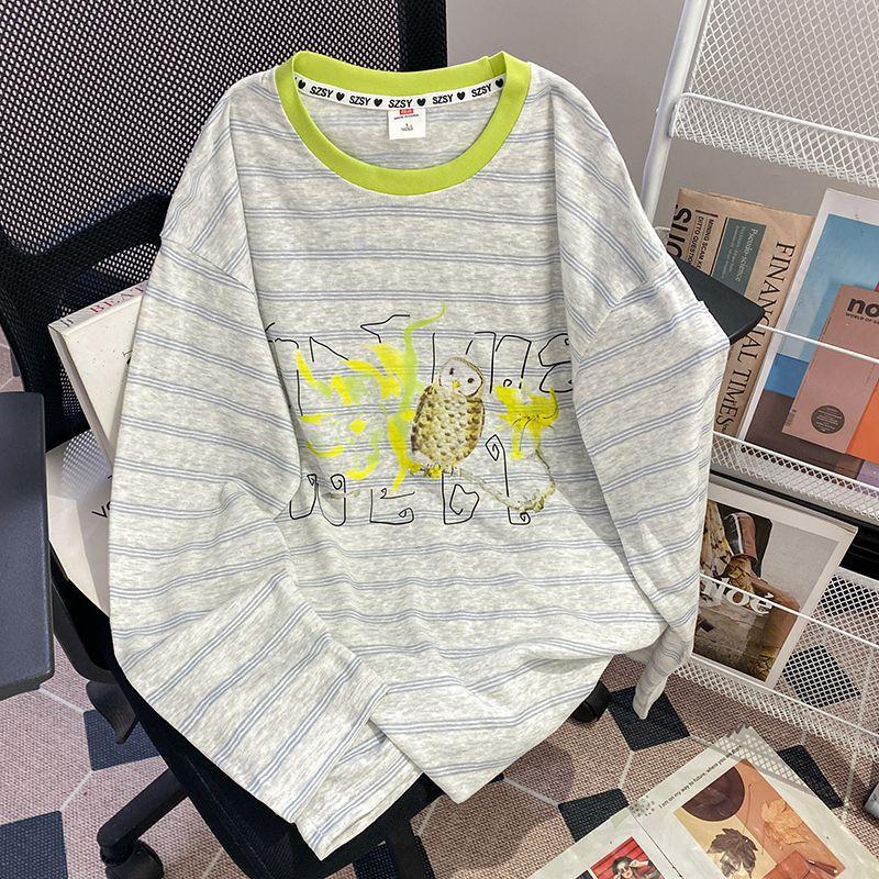 Playera de Manga Larga a Rayas con Bloques de Color y Estampado de Dibujos Animados Retro Streetwear para Mujer Verano Estilo Coreano Reductora de Edad Holgada Top Jersey ins