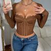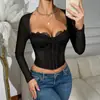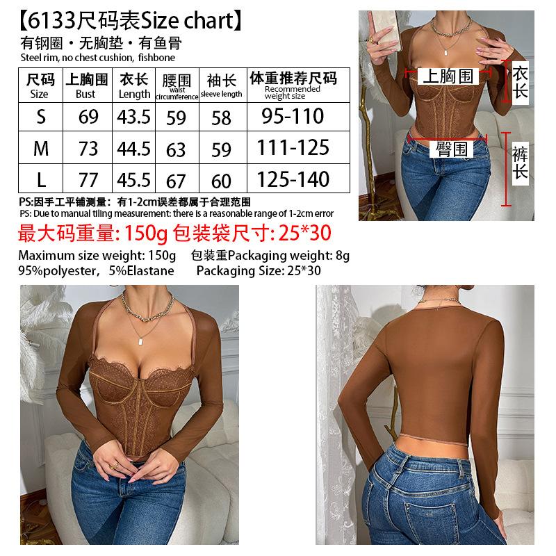 Nuevo Anillo de Acero Transfronterizo Europeo y Americano Adelgazante Malla Empalmada Top de Chica Caliente Sexy Encaje Transparente Manga Larga Corsé de Ballenas