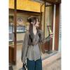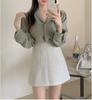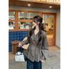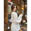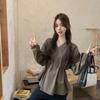 Foto real camisa coreana retro de cuello en V adelgazante con lazo para ceñir la cintura de manga larga para mujer top sencillo de diseño francés 89227