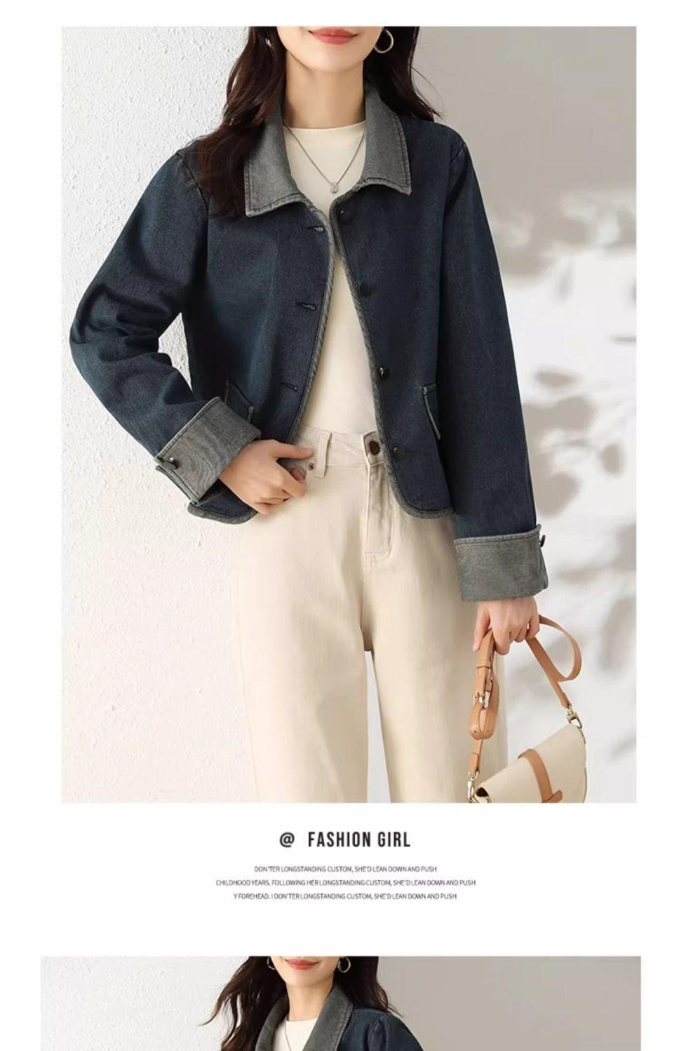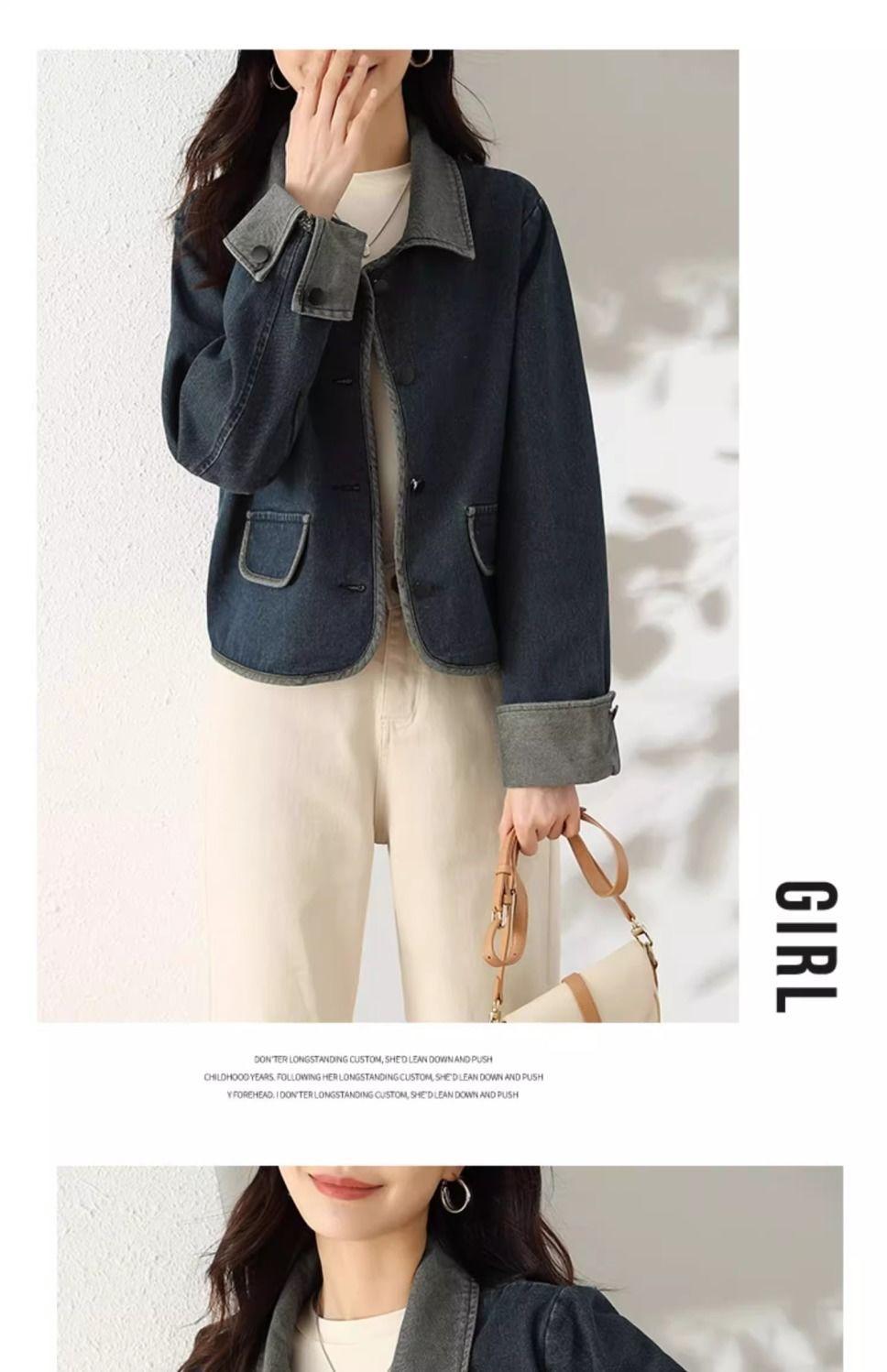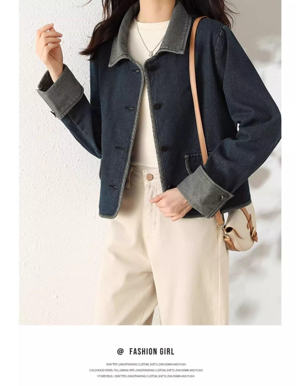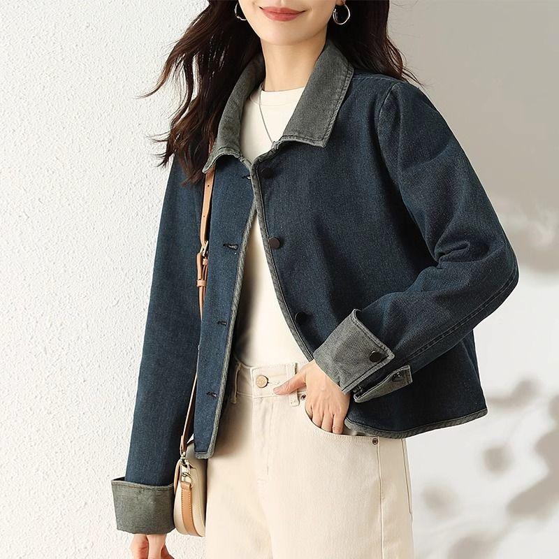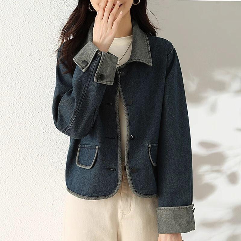 Chaqueta Solapa 2025 Top Temperamento Retro Diseño Casual Manga Larga Bloque de Color Sensación Otoñal Nuevo Estilo Chaqueta de Mezclilla Mujer