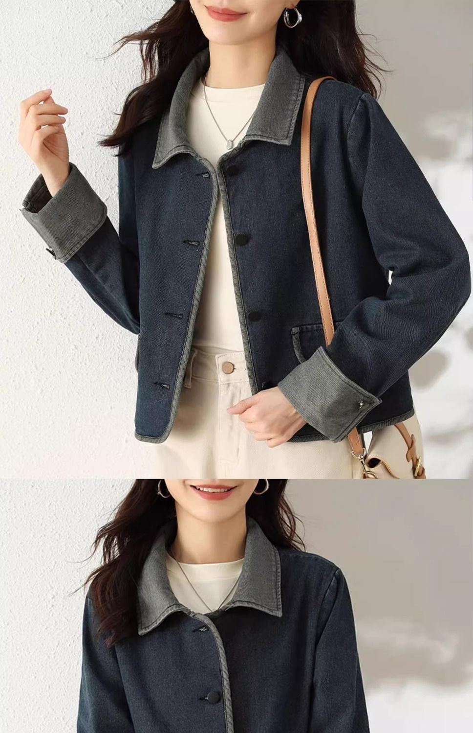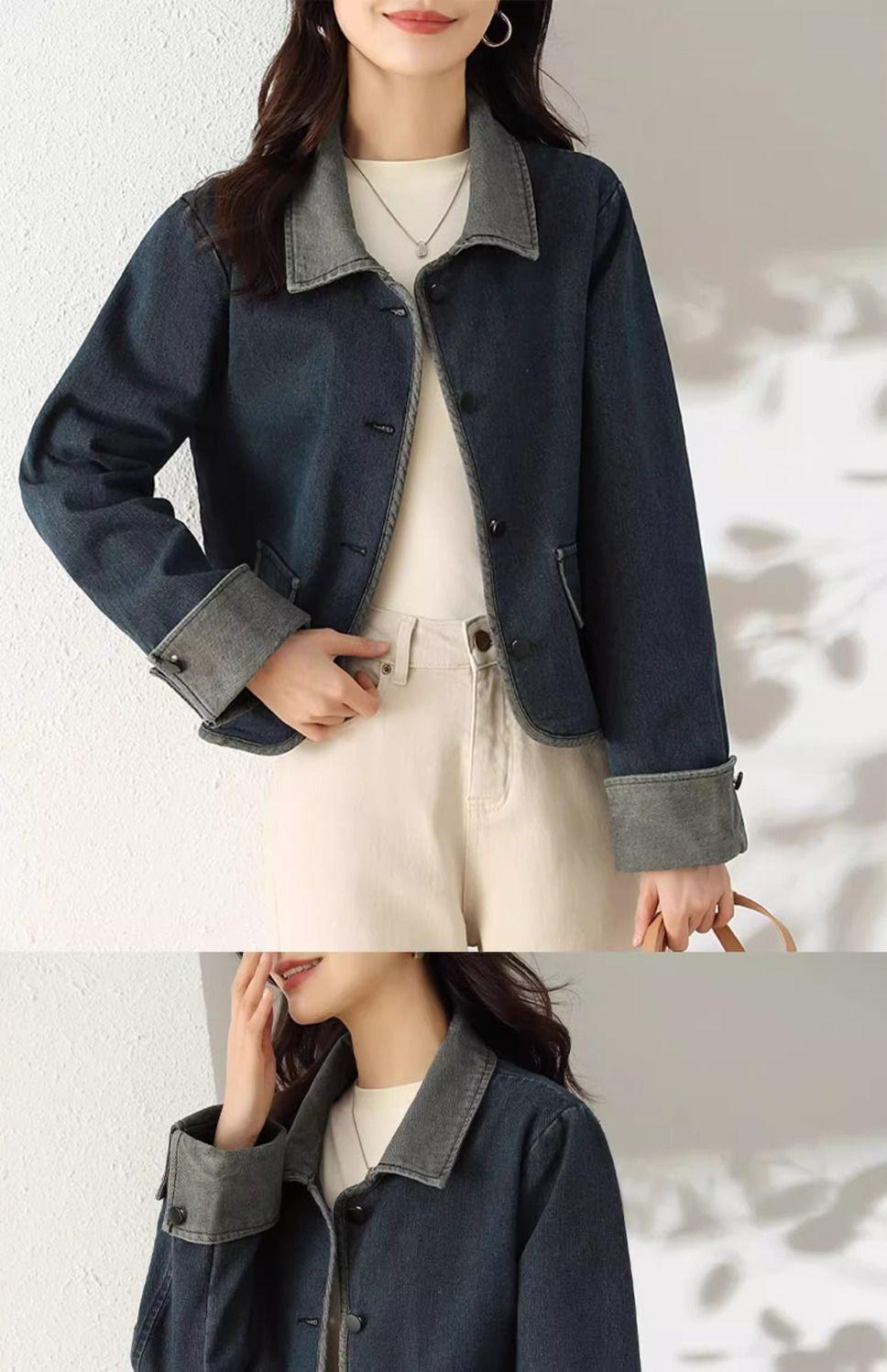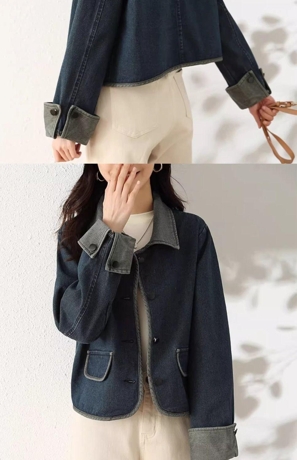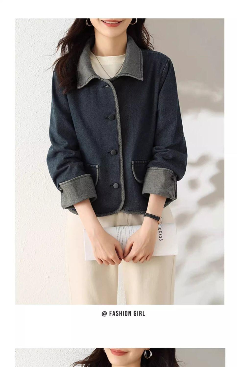 Chaqueta Solapa 2025 Top Temperamento Retro Diseño Casual Manga Larga Bloque de Color Sensación Otoñal Nuevo Estilo Chaqueta de Mezclilla Mujer